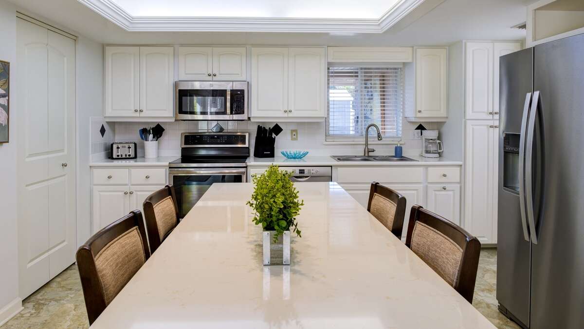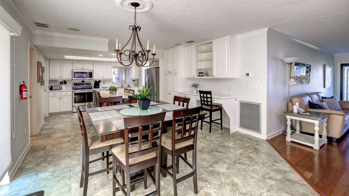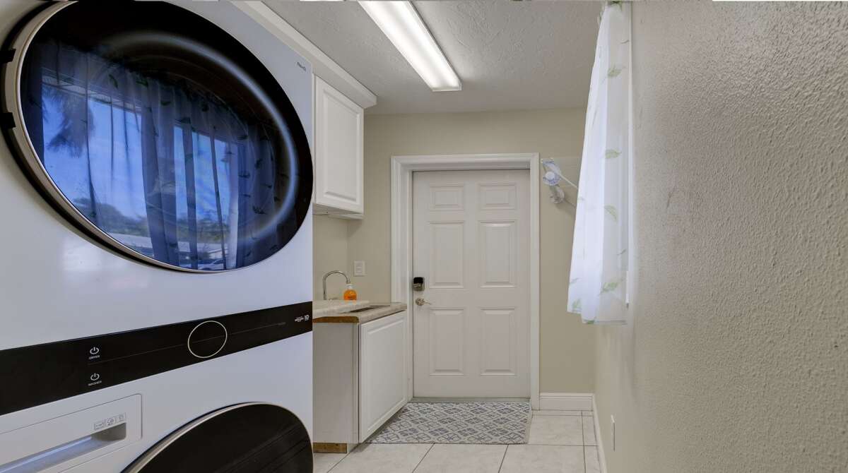 The large Kitchen offers the basic items to cook your meals at home. There is a workspace area in case you need to work while on vacation. Right off the kitchen is the Laundry Room with a large stackable washer and dryer.