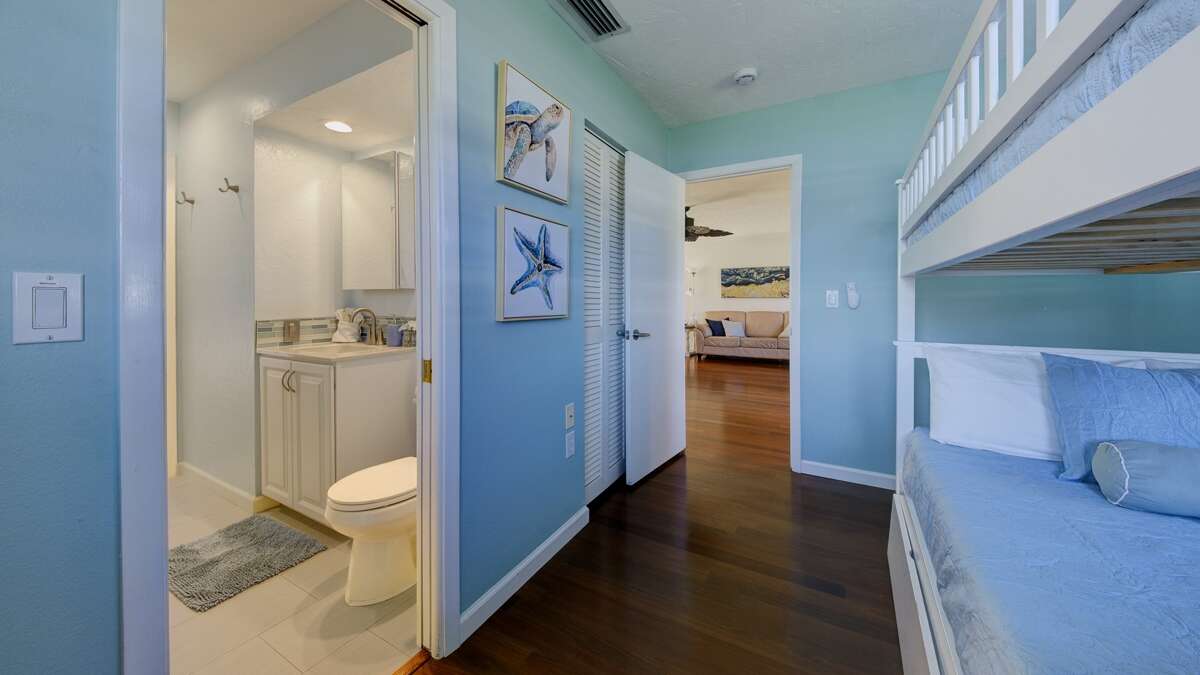 Off the sitting area is the Full Bunk Room which has a Jack and Jill Bathroom connected to the second room which offers a Queen bed. The bathroom between the two rooms has a nice sized walk-in shower. Both bedrooms offer adequate storage for your items.