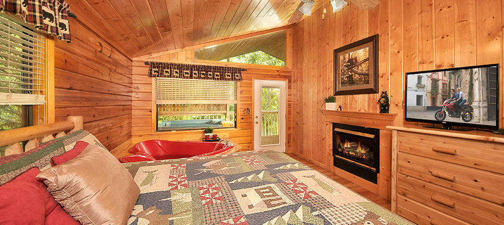Honey Bear Den is a warm and cozy one-bedroom cabin in Hidden Springs Resort. This quaint cabin is the perfect getaway for a honeymoon, anniversary or just a cozy couple's weekend. Honey Bear Den sleeps four guests with one king bed, queen sleeper sofa and one bathroom. The living room provides a cozy night in to watch movies around the beautiful stone fireplace. The full kitchen allows guests to prepare a romantic meal that can be enjoyed in the dining area. The master bedroom has a king bed, a heart-shaped Jacuzzi and a fireplace. Guests can also take a relaxing dip in the outdoor hot tub. Honey Bear Den is only one mile from Dollywood theme park and Dollywood's Splash Country water park. Also, the cabin is just minutes away from other area attractions in Pigeon Forge and Gatlinburg.