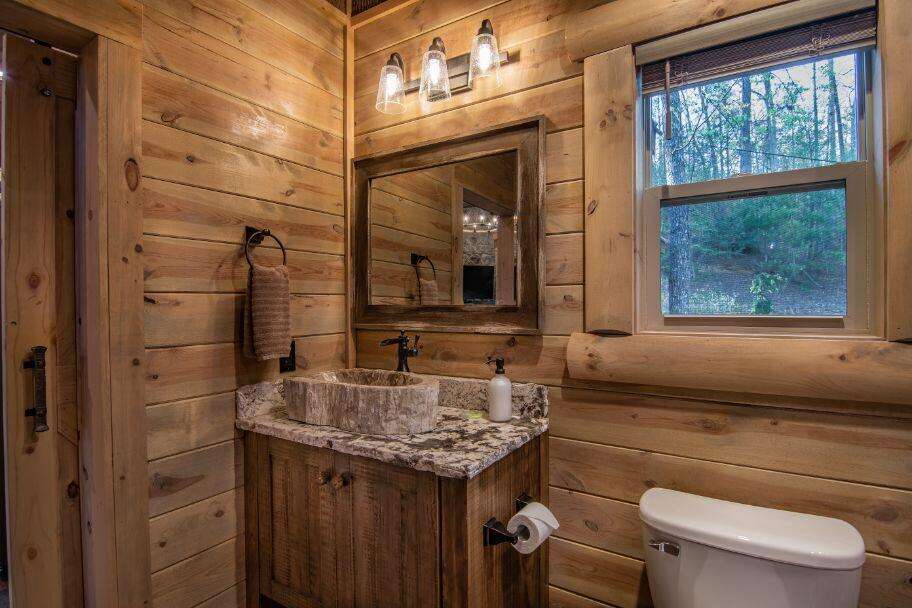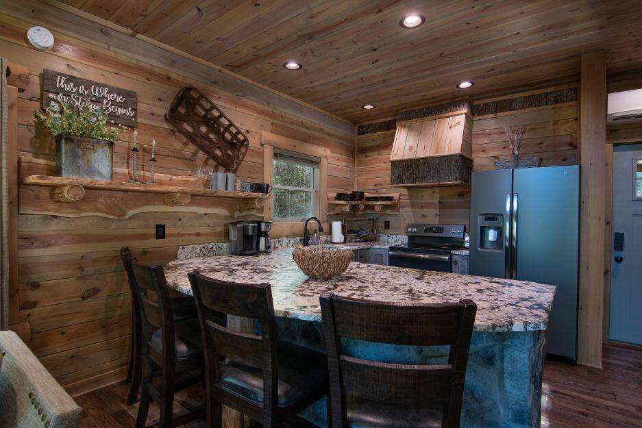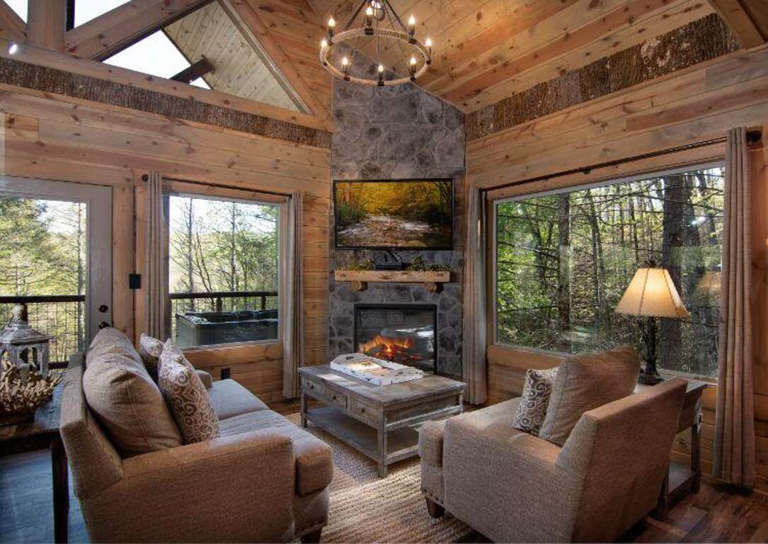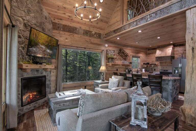 This treehouse cabin is devoted to giving guests the serenity of the Smokies right in the comfort of your cabin with its modern, yet rustic, furnishings, and bark accent walls, as well as large windows that will make you feel surrounded by the canopy of trees. Rustic rope chandeliers and a large fieldstone fireplace create a soothing nature atmosphere to enjoy while cooking in the fully equipped kitchen with large granite countertops. Enjoy watching TV or a Blu-Ray on the big 55'' screen TV!