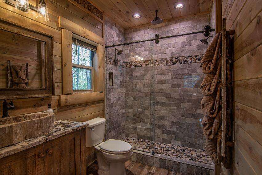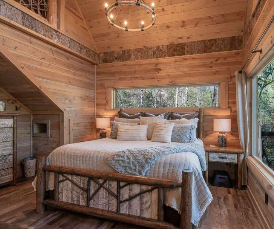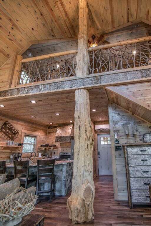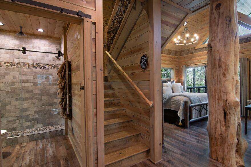 Enjoy the openness of the cabin with a king-size bed downstairs while taking in the remarkable features, including a year-round electric fireplace, sliding barn wood door, and large two-person tiled shower in the bathroom that has three showerheads. A large cedar tree runs through the center of the cabin for that rustic feel as if you were outdoors.