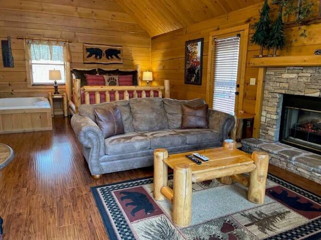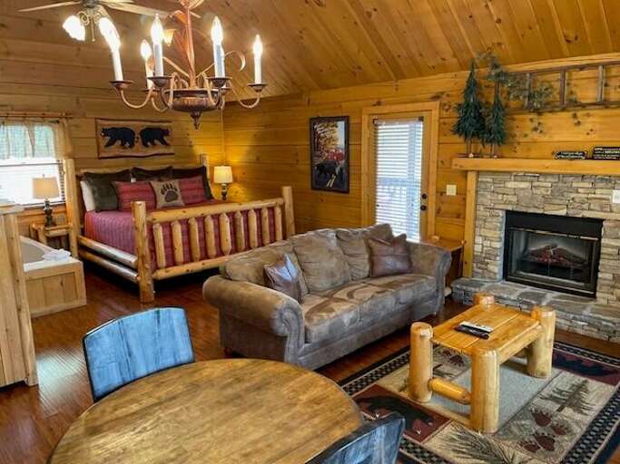 This cabin is a one-room studio, all on one level, with a main living area that features a big-screen TV, satellite cable, a DVD player, a cozy electric fireplace, and a sleeper sofa. There's also a kitchen with all the essentials, a small bistro table, and a wonderful jetted bathtub positioned right next to the bed.