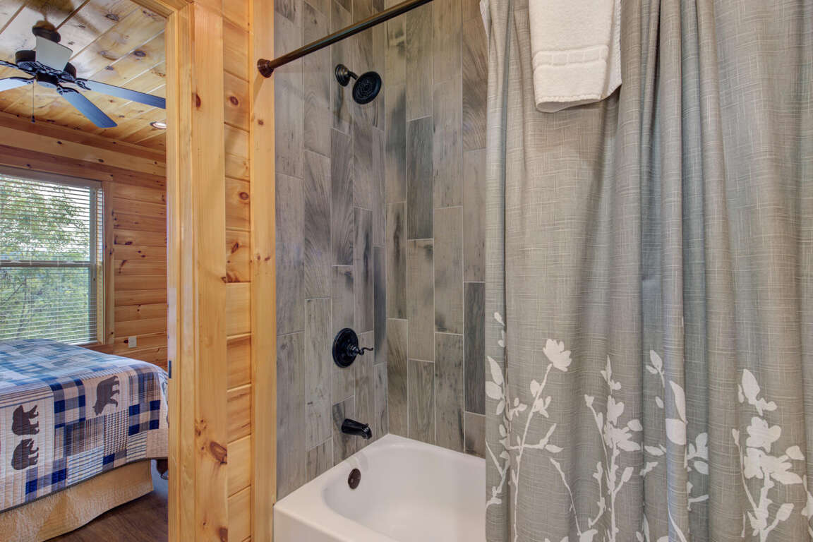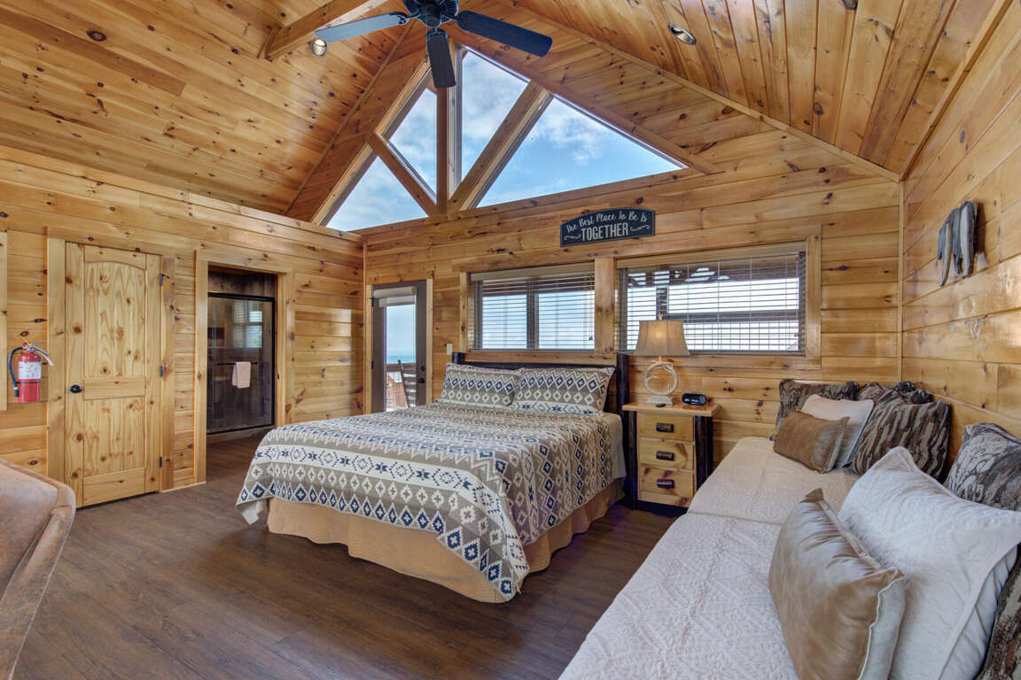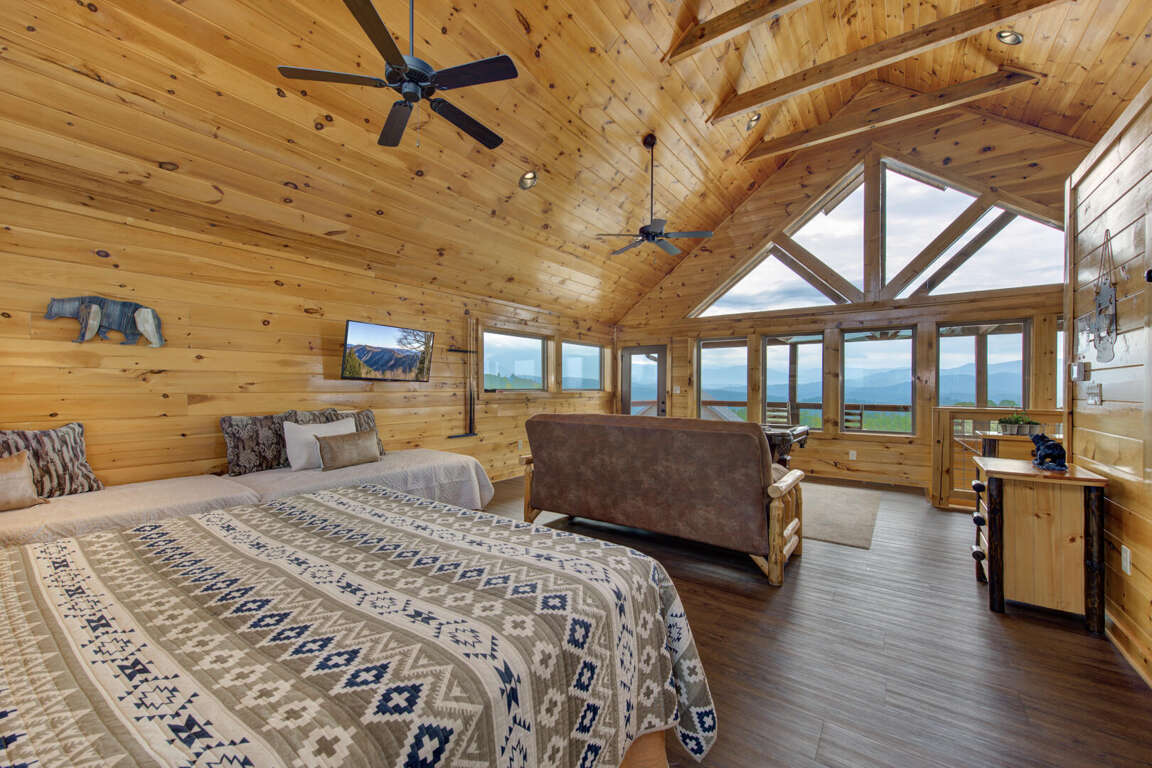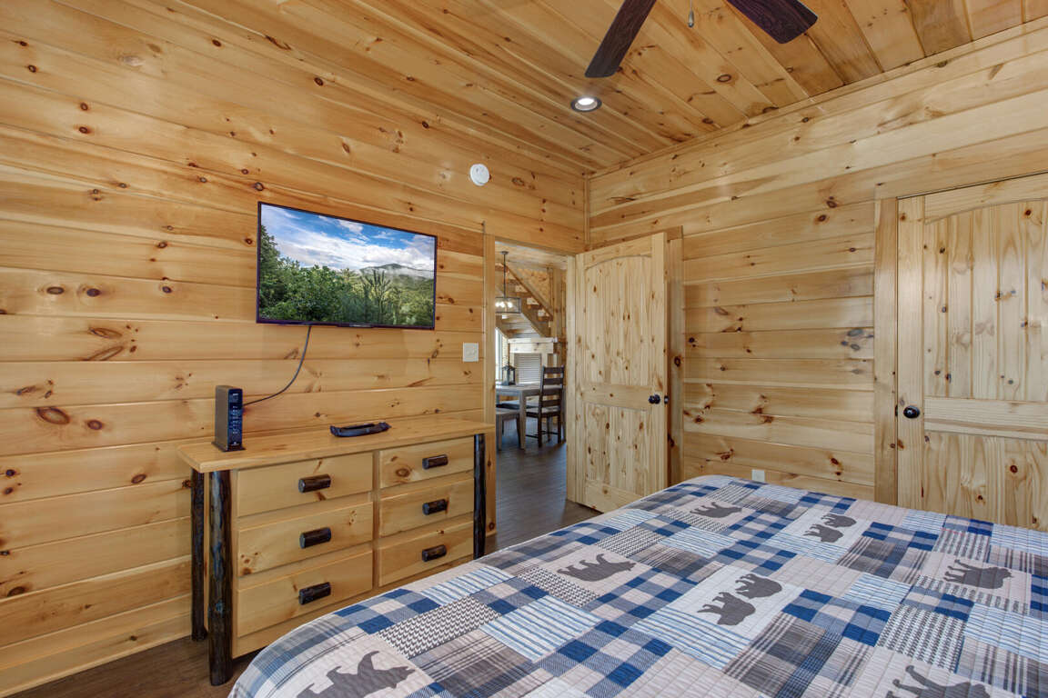 This charming 1-bedroom, 2-story log cabin boasts a stunning panoramic view of the Smoky Mountain range. On the main level, you’ll find a cozy living area with a warm gas-log fireplace and streaming TV—perfect for snuggling up on cool evenings. The fully equipped kitchen and dining space make it easy to share meals together, while the inviting king-size bedroom with a full bath offers restful comfort after a day of adventure.
