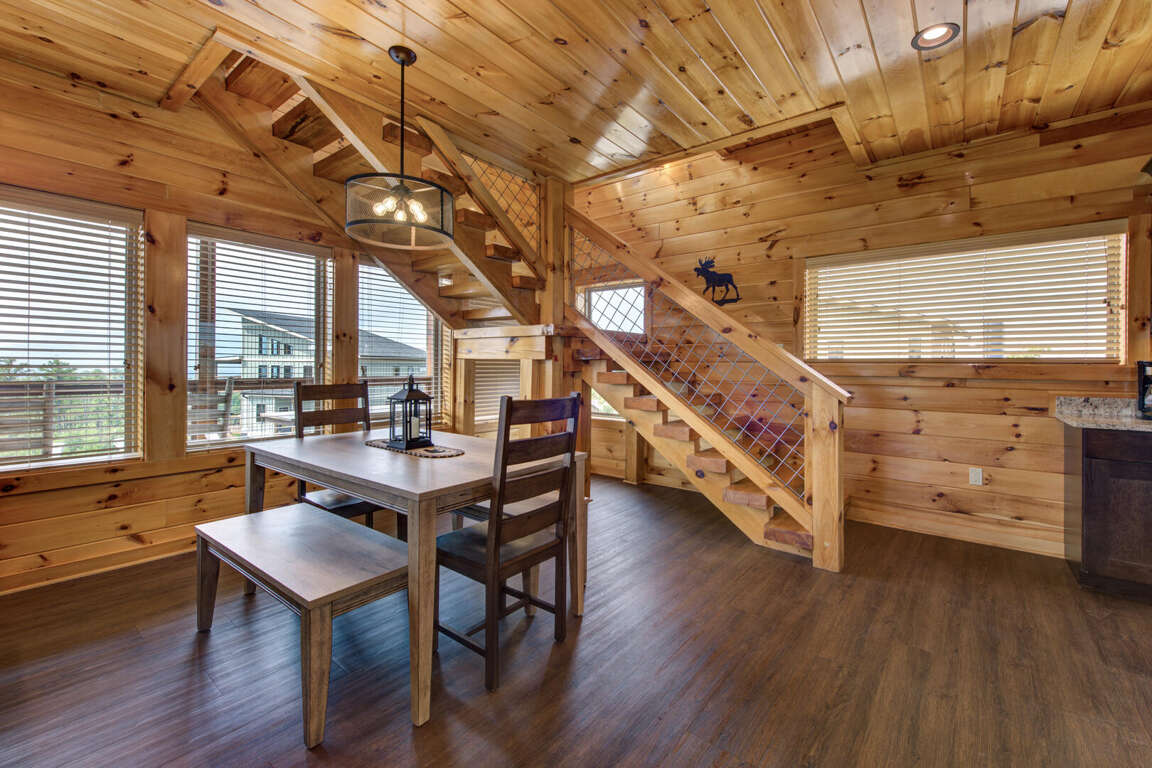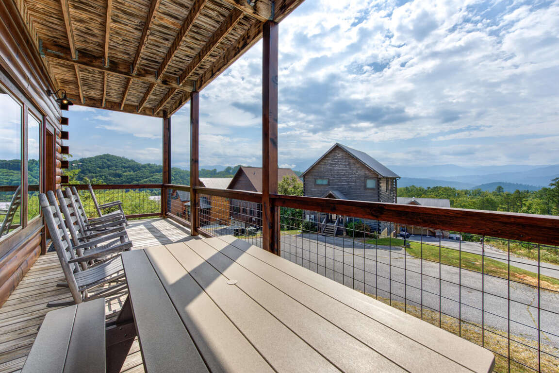 Step outside to soak in the mountain serenity. The upper deck invites couples to unwind in the bubbling hot tub or enjoy morning coffee in the rocking chairs, while the main level’s picnic table and rockers set the stage for outdoor family dining and evening sunsets.
