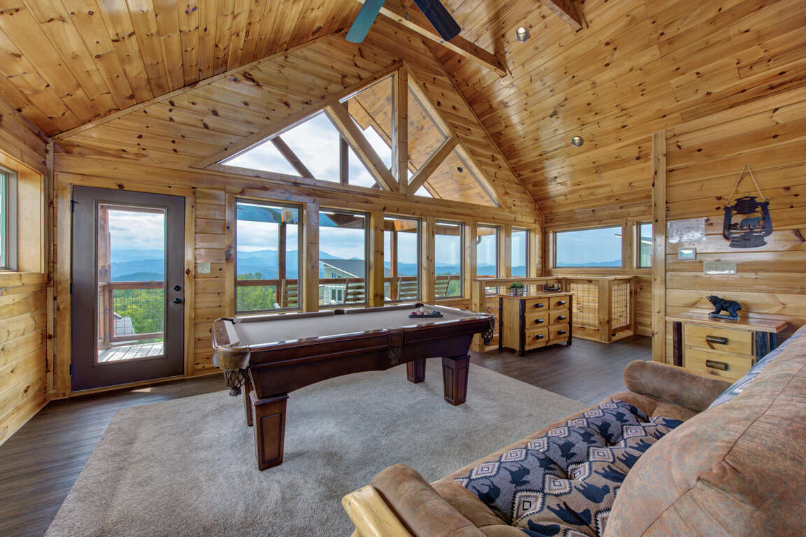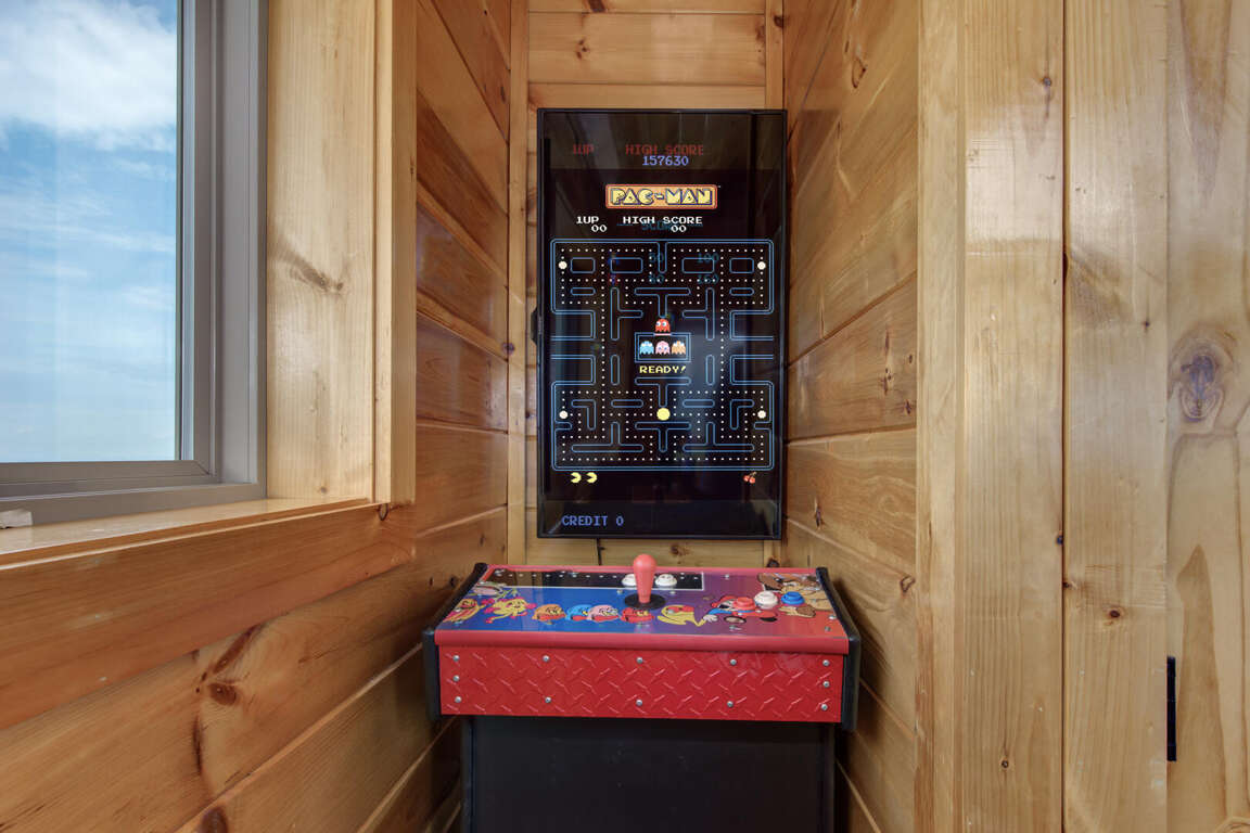 Upstairs, the spacious loft is ideal for both fun and relaxation. It features another king bed, a futon, and two twin beds—giving families plenty of space to spread out. Entertainment abounds with a pool table, arcade system (61 games!), and additional TV, making it a kid-friendly haven.
