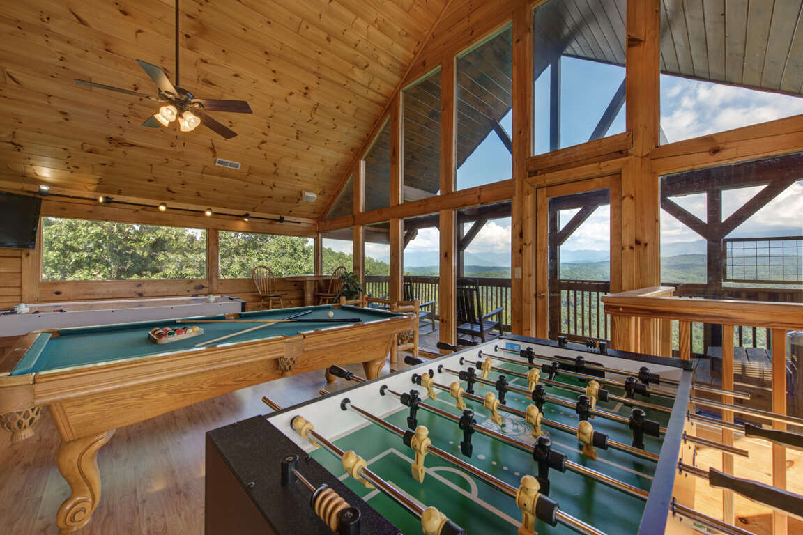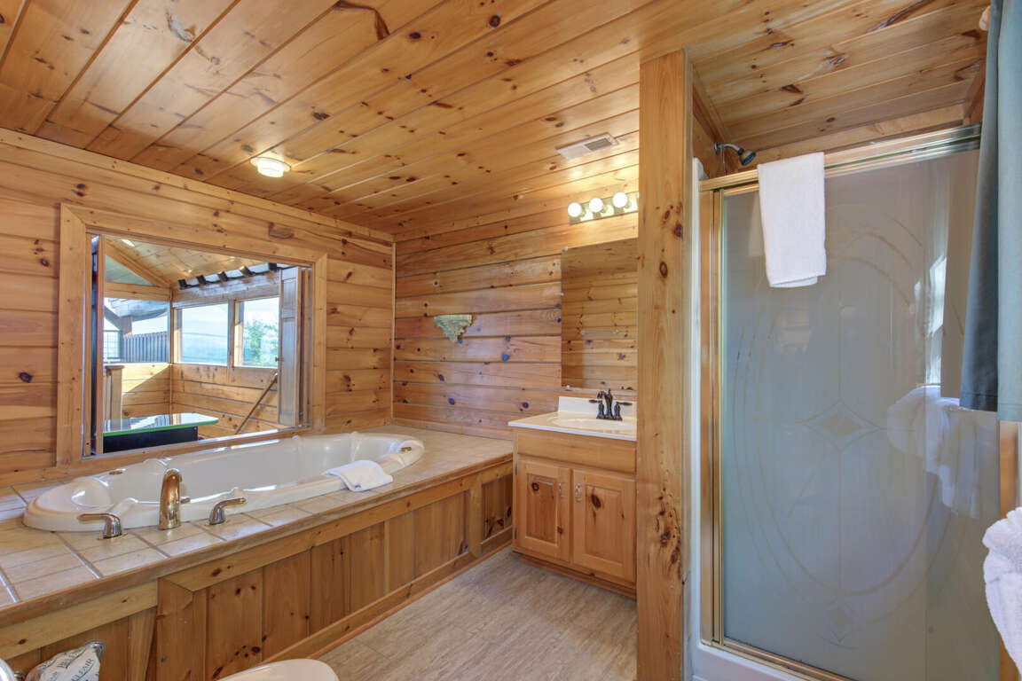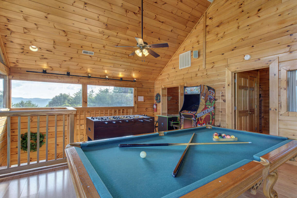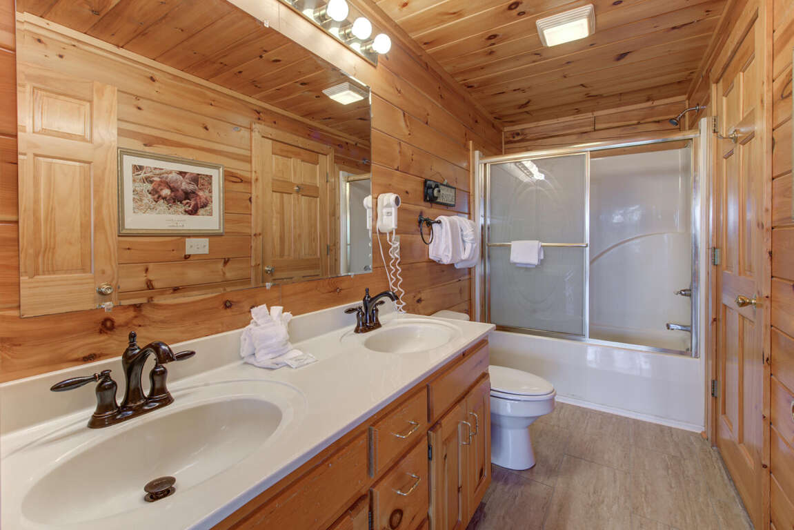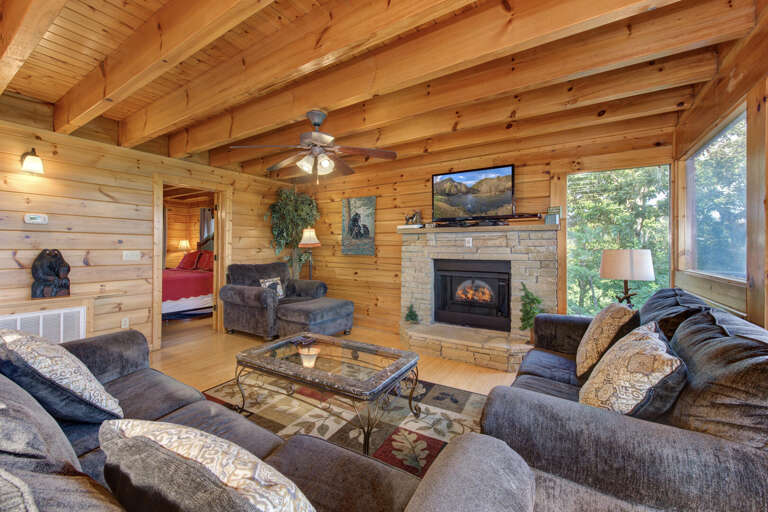 Beverly's Bearadise is a spacious two-bedroom cabin nestled in Starr Crest Resort. This beautiful cabin is great for a couple's getaway or a girls' weekend. Beverly's Bearadise sleeps six guests with two king beds, one sleeper sofa and two bathrooms. This vacation home is the perfect retreat for enjoying picturesque views of the beautiful Smoky Mountains while relaxing in a rocking chair. The bright, full kitchen and adjoining dining area allow guests to conveniently prepare and enjoy meals while fellowshipping and enjoying each other's company. The living room has a beautiful stone fireplace, a 50-inch flat screen TV and comfortable couches. The entire family will stay entertained with pool and air hockey tables, a classic video game system and a hot tub. Beverly's Bearadise is only 5.5 miles from Dollywood theme park and Dollywood's Splash Country water park. Also, the cabin is just minutes away from other area attractions in Pigeon Forge and Gatlinburg.