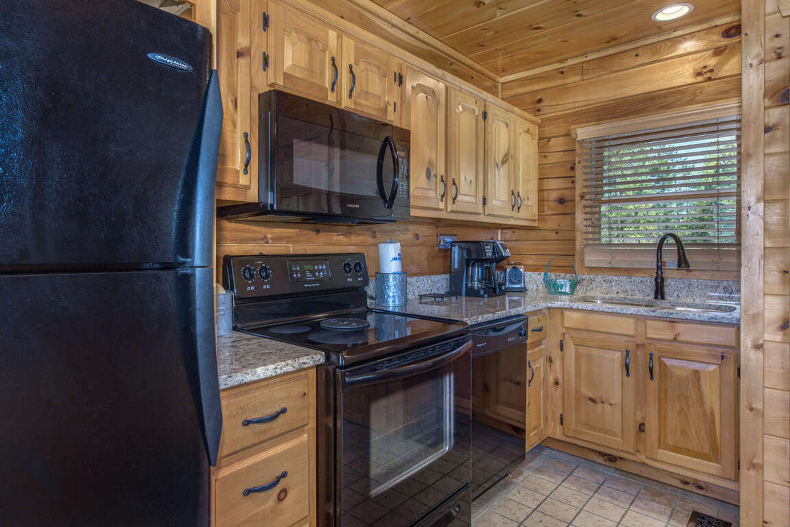 Step inside to find warm tongue-and-groove wood walls and ceilings that surround you in rustic elegance. The spacious open floor plan features a stacked-stone electric fireplace, a cozy living area with plush furnishings, and a queen sleeper sofa—perfect for family movie nights in front of the flat-screen TVs. The fully equipped kitchen, complete with a 2-in-1 Hamilton Flex Brew coffee maker, invites you to enjoy your morning cup while gazing at the majestic mountain views through the large picture windows.