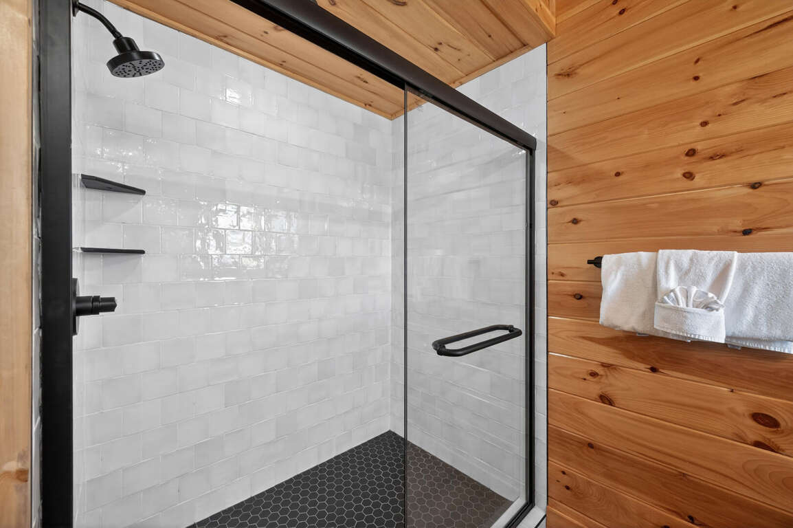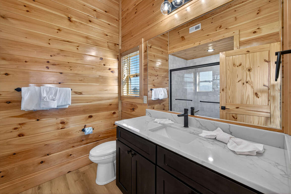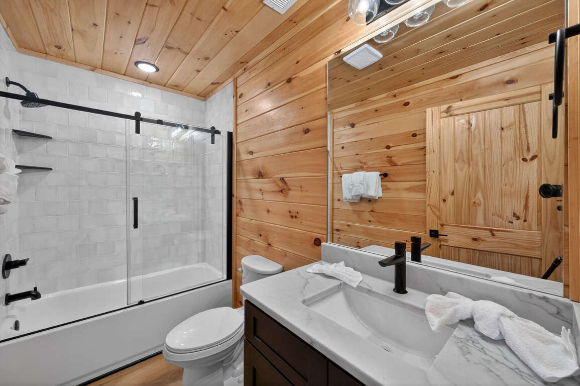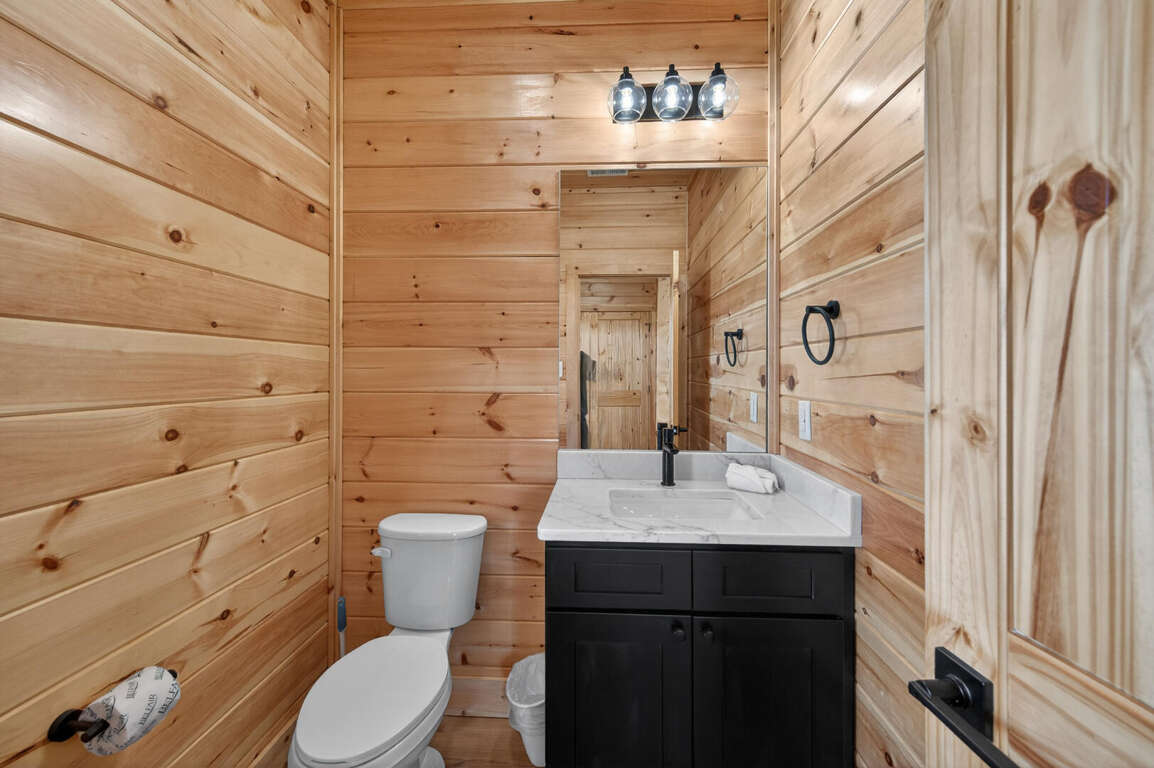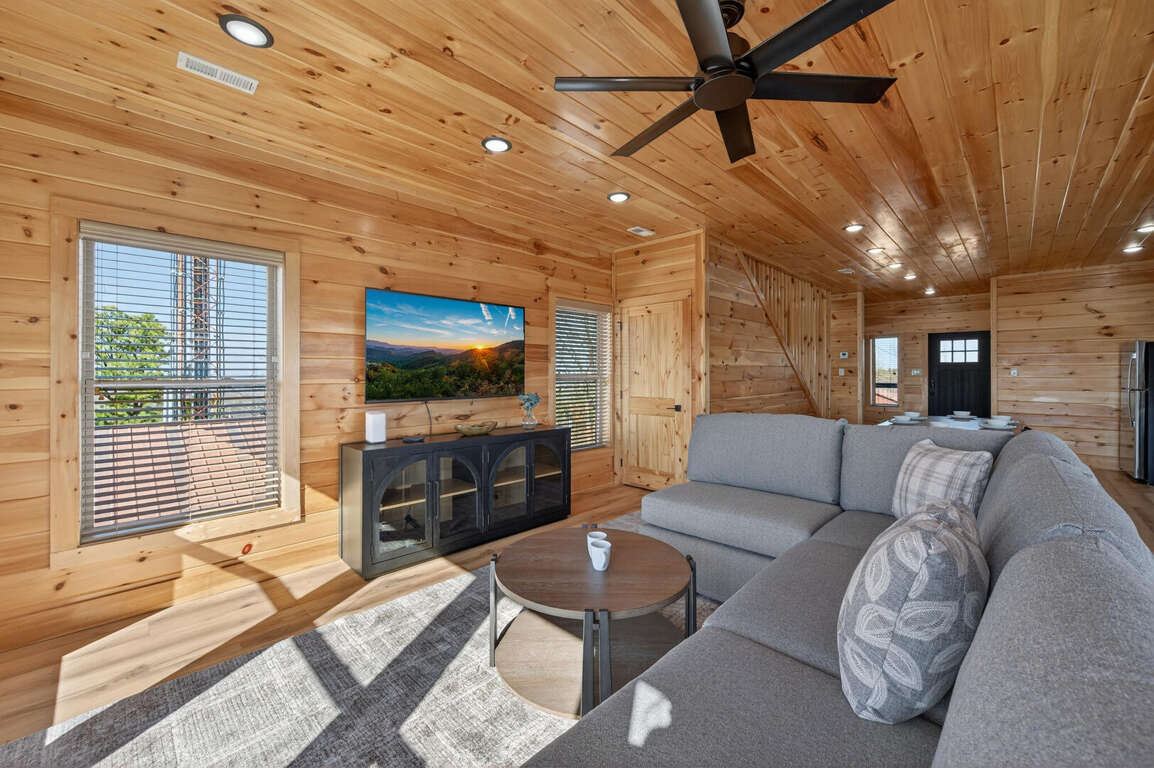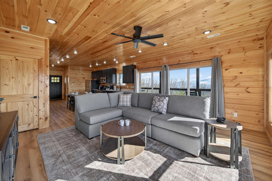 Thoughtfully designed for families and small groups, Rocky Top features two spacious bedrooms, each with a private en suite bathroom, an additional half bath, and a set of twin roll away beds. The open-concept living area is both stylish and welcoming, complete with a comfortable sectional sofa and large Smart TV—perfect for relaxing after a day of adventure or enjoying a quiet evening indoors.