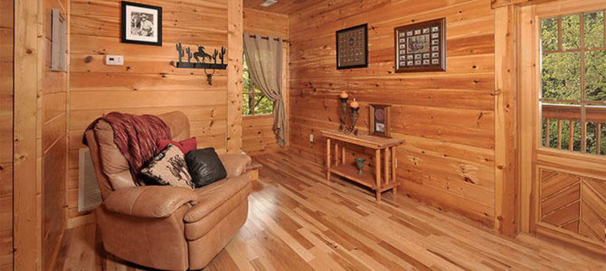 Turkey Creek Lodge is a luxurious two-bedroom cabin in Alpine Mountain Village. This stunning log home gets its name for the incredible wildlife, such as turkeys, that guests may see during their stay. Turkey Creek Lodge sleeps eight guests with one king bed, two queen beds, two twin beds and two bathrooms. This cabin is furnished with everything families need to create and enjoy the perfect Smoky Mountain getaway. On the main level, the spacious full kitchen with an island provides families with the perfect space to prepare delicious meals. Guests can gather and fellowship in the cozy living room to watch a movie by the beautiful stone fireplace. Downstairs, guests can enjoy a friendly game of pool or watch their favorite team. The third level is a great place for the kids to camp out with plenty of sleeping space. Outside on the cabin's two decks, guests can stargaze in the hot tub or relax in a rocking chair. Turkey Creek Lodge is only six miles from Dollywood theme park and Dollywood's Splash Country water park. Also, this cabin is also only minutes away from other area attractions in Pigeon Forge and Gatlinburg. Turkey Creek Lodge will not be decorated for Christmas.