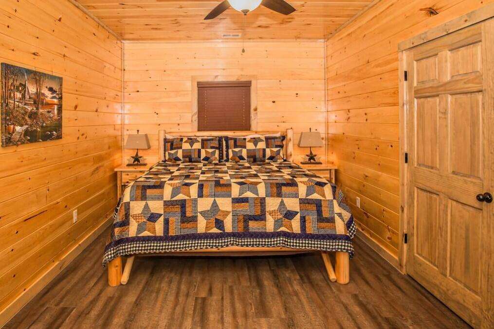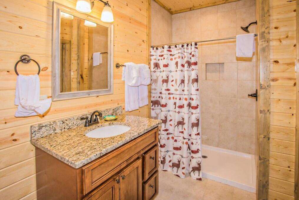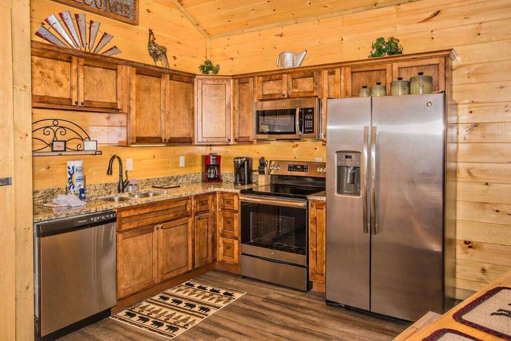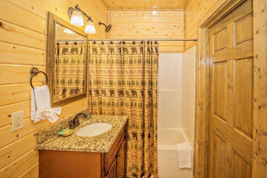 Situated at Bear Cove Falls in the midst of breathtaking mountain scenery, All Bear Paws is a three-bedroom, two-bath cabin home with gorgeous wood accents throughout. This home will accommodate up to eight guests with two king-sized beds and a set of queen-sized bunk beds, making it a perfect mountain retreat for family and friends. The spacious living area is welcoming to all, as the open floor plan makes room for entertainment and relaxation and is outfitted with comfortable seating options, a stone fireplace and large flat screen TV. Stepping over into the kitchen, guests will find a fully-equipped kitchen to help them prepare delicious meals during their stay. Once dinner is ready, guests can sit at the large wooden table, then enjoy the outdoor pool and hot tub for recreation. Other entertainment options for guests are located just three miles from the cabin & Dollywood theme park and Dollywood Splash Country! This cabin also is located minutes away from endless dining options and attractions in Gatlinburg and Pigeon Forge.