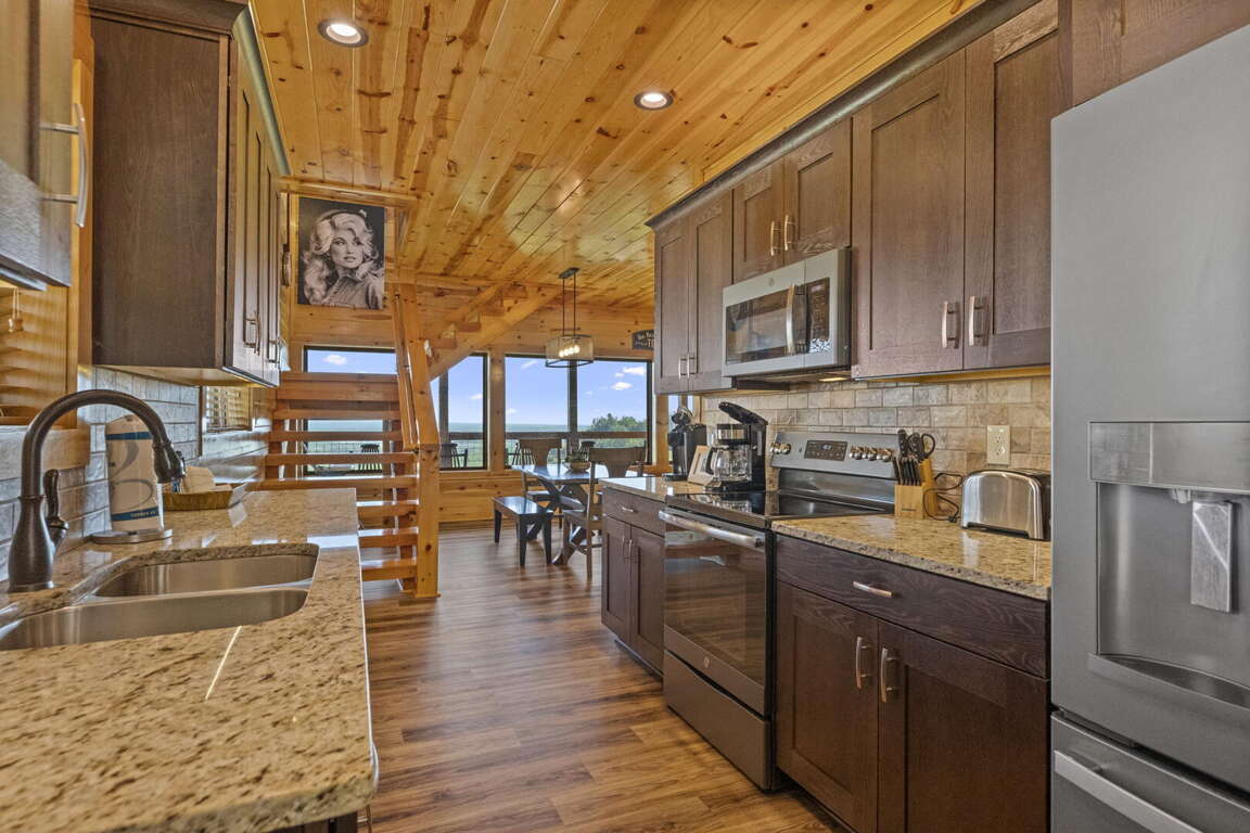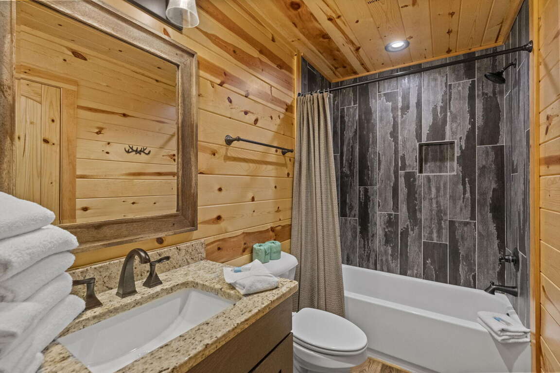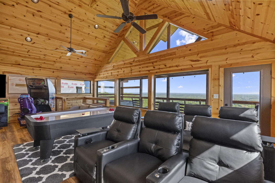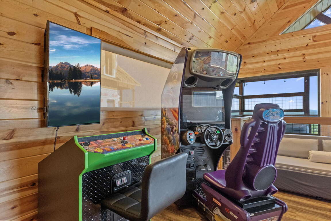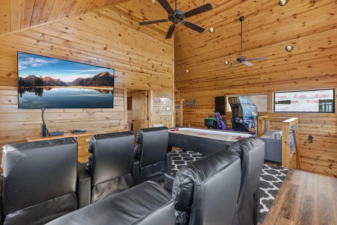 When you enter the cabin you will be standing in the beautiful kitchen with granite countertops and stainless steel appliances. We have taken care to ensure everything you could need in a kitchen is included. From there you will walk into the family room where you can snuggle up in front of the fireplace or enjoy the breathtaking views from the rocking chairs on the decks. On the main floor you will also find a king bed suite with a full bathroom. Head up stairs and you have entered into the activity center of the cabin. Here you will find several arcade games, air hockey, and an 85" TV set up with theater seating to watch your favorite movie. Head outside on the upper deck to enjoy the unobstructed views while you soak in the hot tub. Back in the game room you will find a large sleeper sofa large enough for two as well as built in bunk beds for the kids. Lastly the upstairs includes one more king size suite with its own full bathroom. This cabin is the perfect combination of luxury and rustic charm to appeal to anyone's taste.