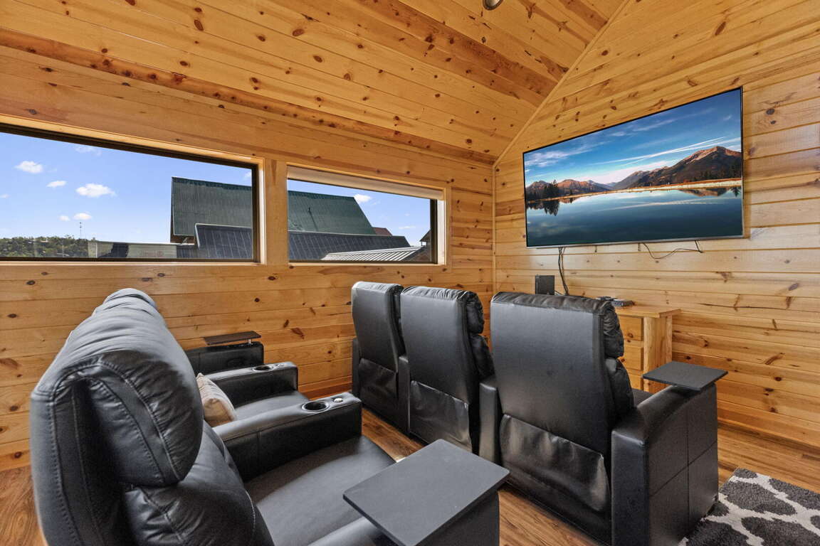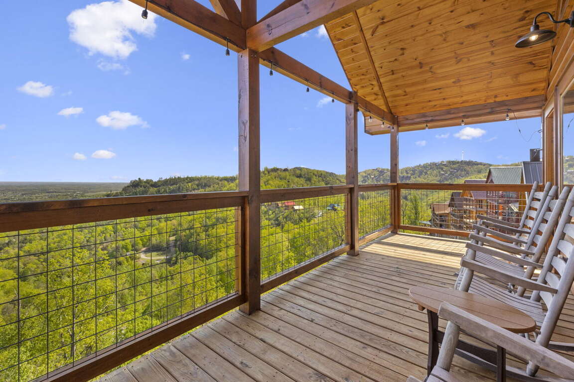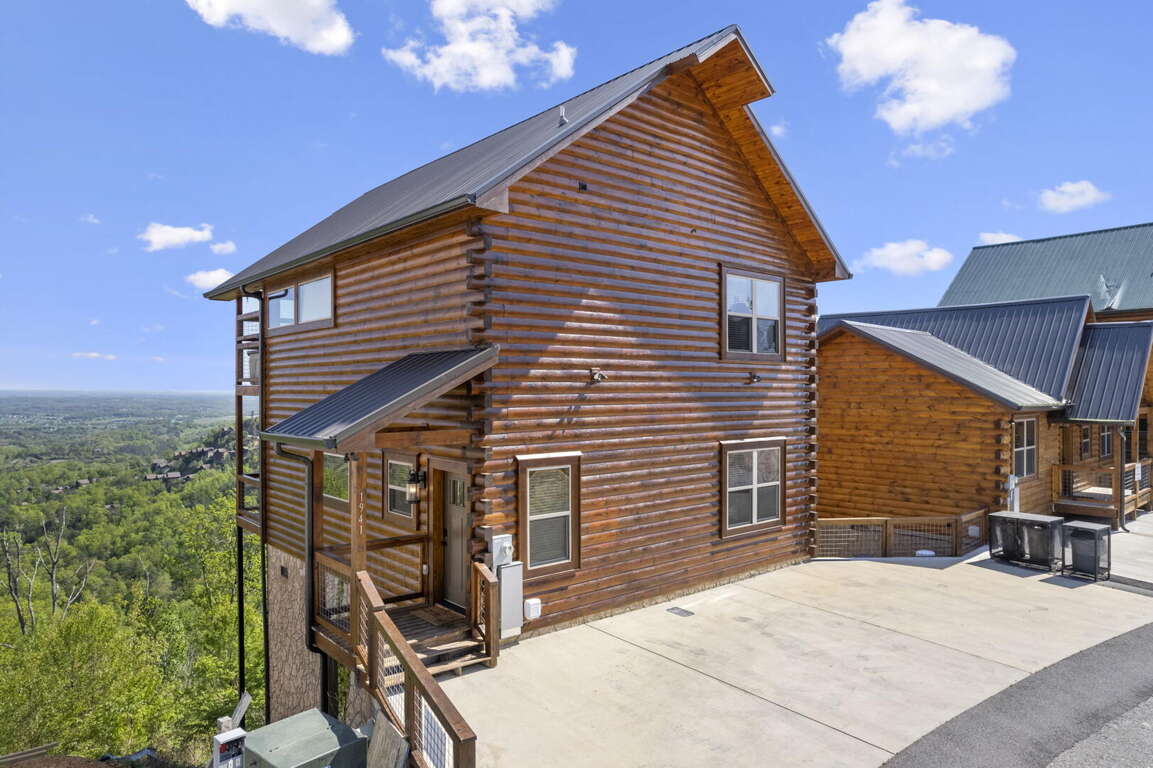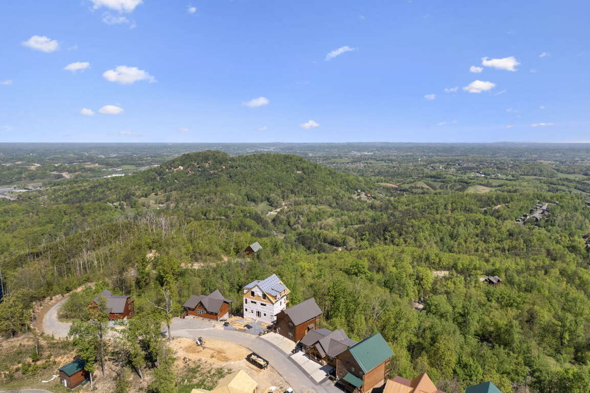 When you enter the cabin you will be standing in the beautiful kitchen with granite countertops and stainless steel appliances. We have taken care to ensure everything you could need in a kitchen is included. From there you will walk into the family room where you can snuggle up in front of the fireplace or enjoy the breathtaking views from the rocking chairs on the decks. On the main floor you will also find a king bed suite with a full bathroom. Head up stairs and you have entered into the activity center of the cabin. Here you will find several arcade games, air hockey, and an 85" TV set up with theater seating to watch your favorite movie. Head outside on the upper deck to enjoy the unobstructed views while you soak in the hot tub. Back in the game room you will find a large sleeper sofa large enough for two as well as built in bunk beds for the kids. Lastly the upstairs includes one more king size suite with its own full bathroom. This cabin is the perfect combination of luxury and rustic charm to appeal to anyone's taste.