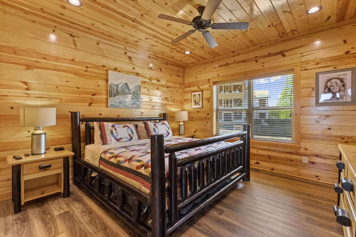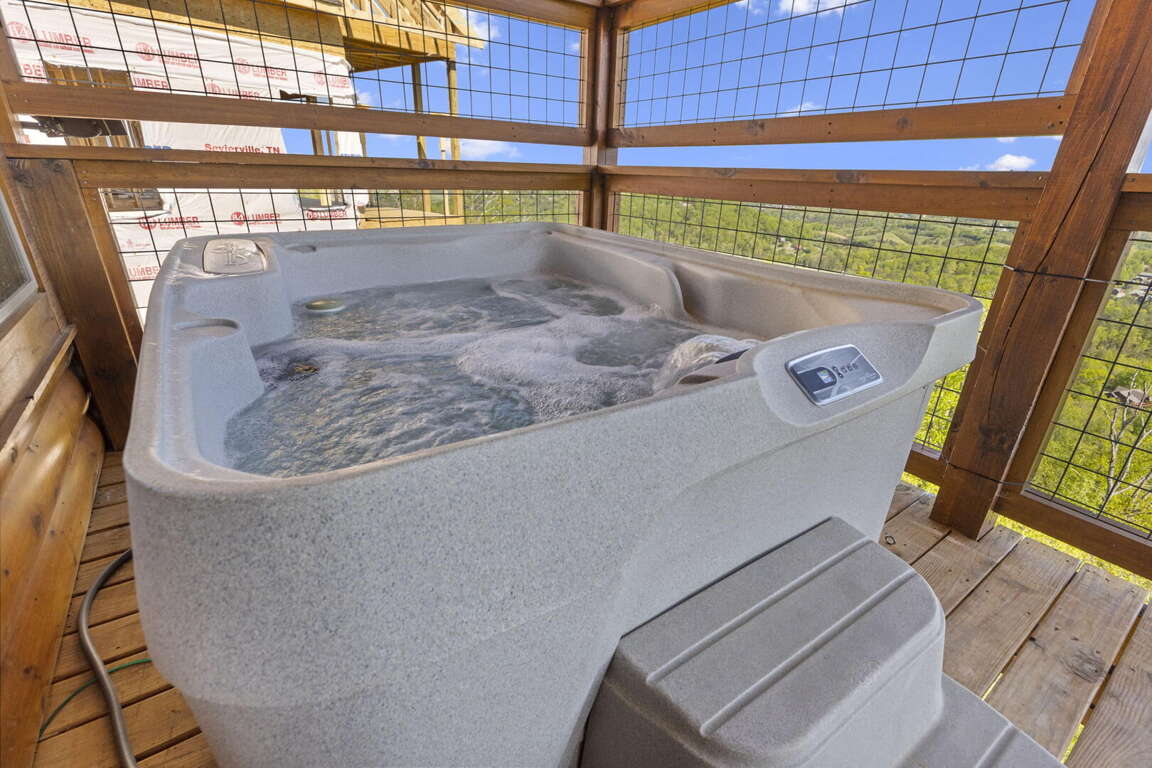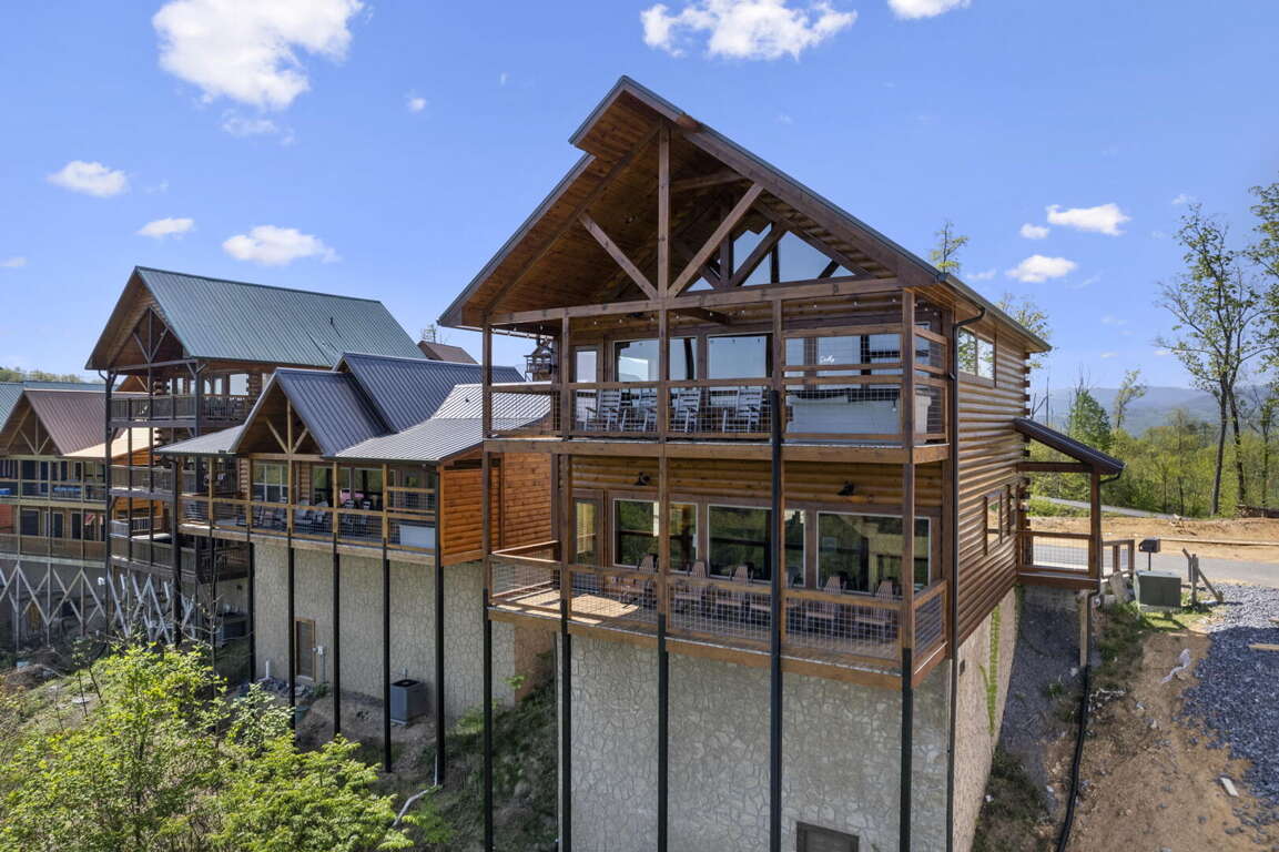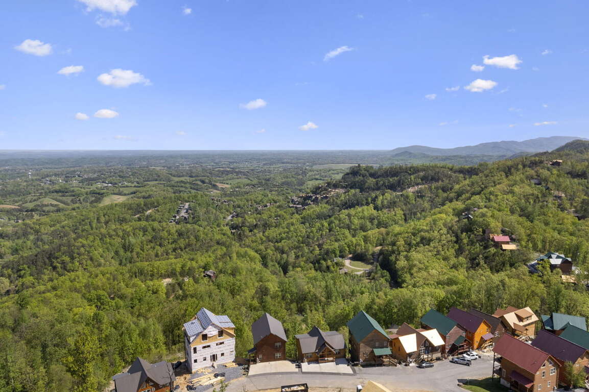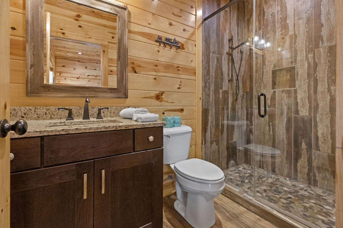 When you enter the cabin you will be standing in the beautiful kitchen with granite countertops and stainless steel appliances. We have taken care to ensure everything you could need in a kitchen is included. From there you will walk into the family room where you can snuggle up in front of the fireplace or enjoy the breathtaking views from the rocking chairs on the decks. On the main floor you will also find a king bed suite with a full bathroom. Head up stairs and you have entered into the activity center of the cabin. Here you will find several arcade games, air hockey, and an 85" TV set up with theater seating to watch your favorite movie. Head outside on the upper deck to enjoy the unobstructed views while you soak in the hot tub. Back in the game room you will find a large sleeper sofa large enough for two as well as built in bunk beds for the kids. Lastly the upstairs includes one more king size suite with its own full bathroom. This cabin is the perfect combination of luxury and rustic charm to appeal to anyone's taste.