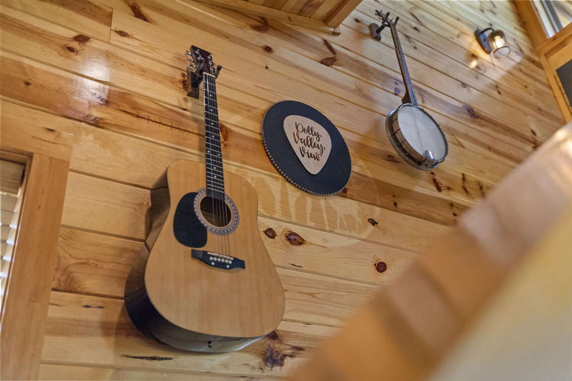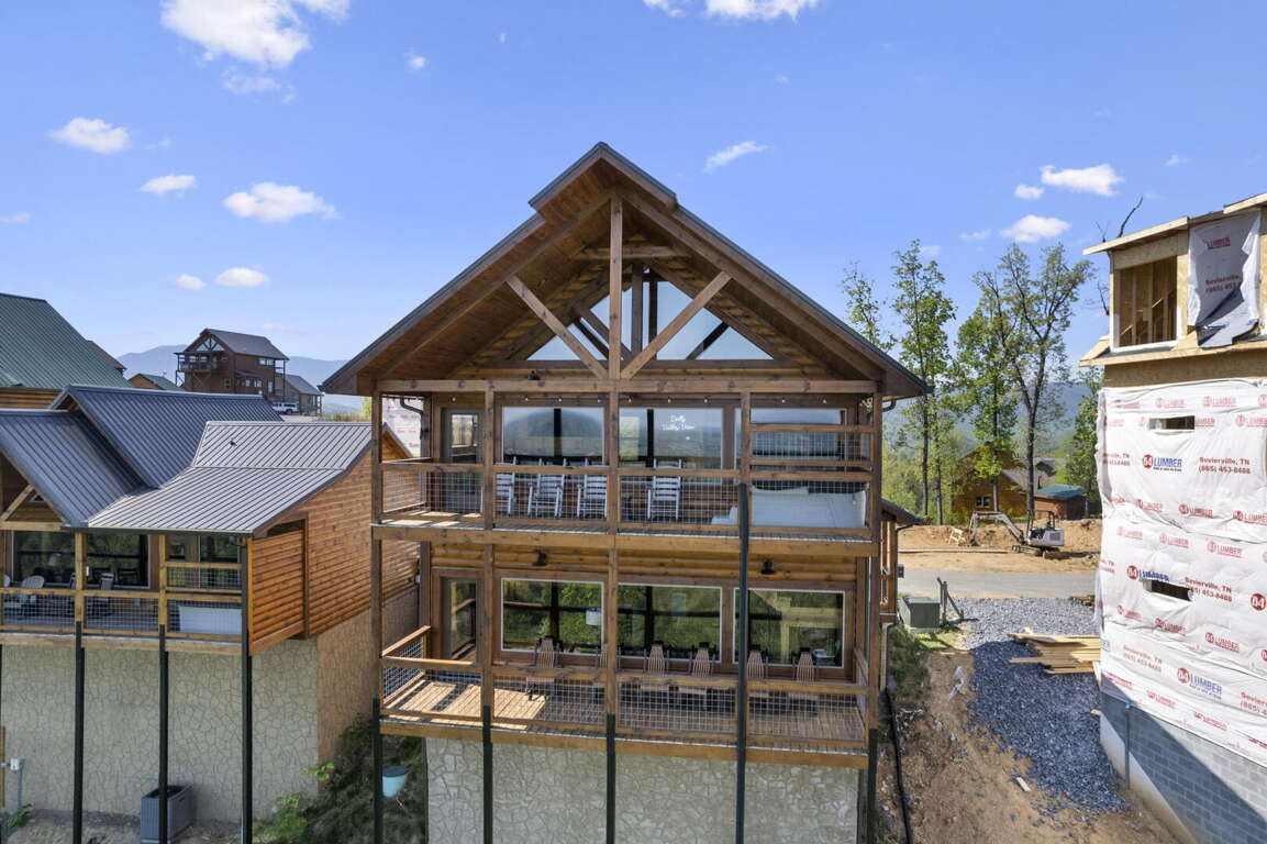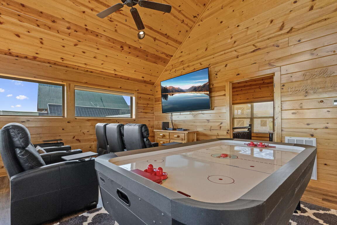 Dolly Valley View is a gorgeous modern cabin with maximum entertainment inside and sweet serenity on the outside. From the moment you pull up, you will feel on top of the world. The cabin is bright and airy with walls of windows framing the breathtaking Smoky Mountain Views. This cabin sleeps 8 guests with two balconies with two ensuite bedrooms on each floor, a set of bunk beds for the kids and a King sofa sleeper. Whether you enjoy playing with the 48 game arcades or air hockey in the game room, streaming movies in the theater area or relaxing in the hot tub overlooking the valley below, your stay will be unforgettable. Dollywood and Dollywood Splash Country is just a short distance away and the Dollywood Express Train can be heard daily whistling through the foothills from the balconies, CHOO! CHOO!