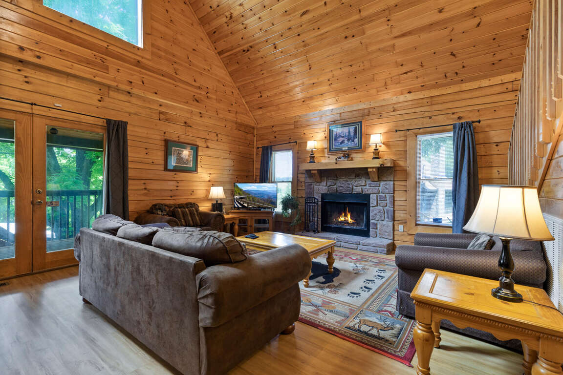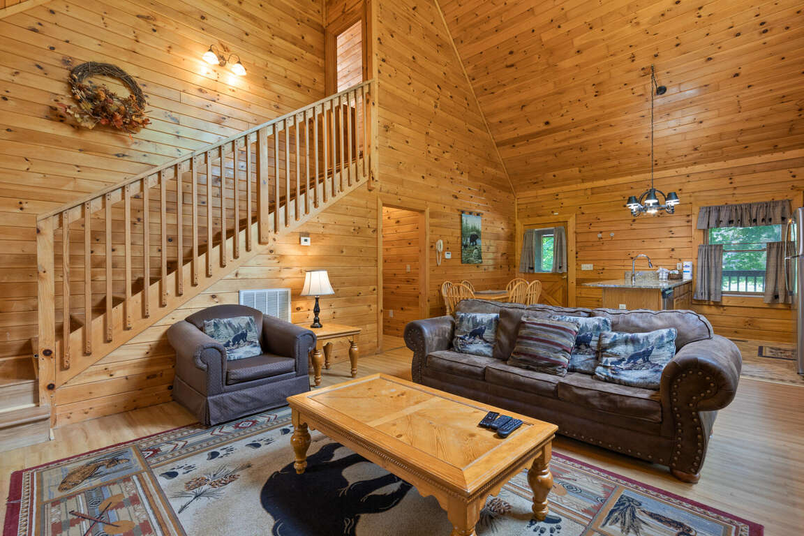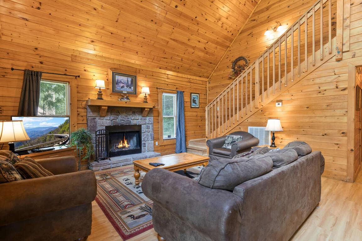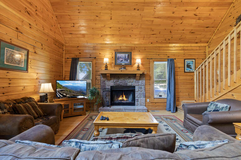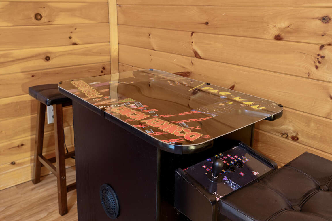 Three bears is a charming three-bedroom cabin located in Sevierville. This cozy cabin sleeps ten guests with one king bed, three queen beds, one queen sleeper sofa, and two bathrooms. The cabin has two bedrooms downstairs with a comfy bedroom upstairs with a balcony. The cabin boasts a wood burning fireplace, multi game arcade, and hot tub for you to enjoy your time away. Three Bears is only 3.6 miles from Dollywood theme park and Dollywood's Splash Country water park. Also, the cabin is just minutes away from other area attractions in Pigeon Forge and Gatlinburg.