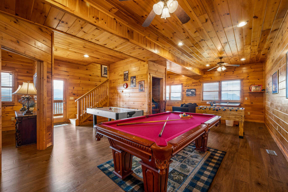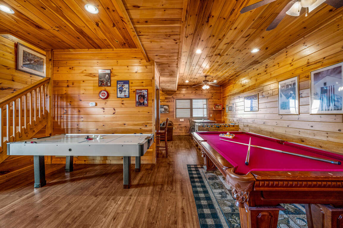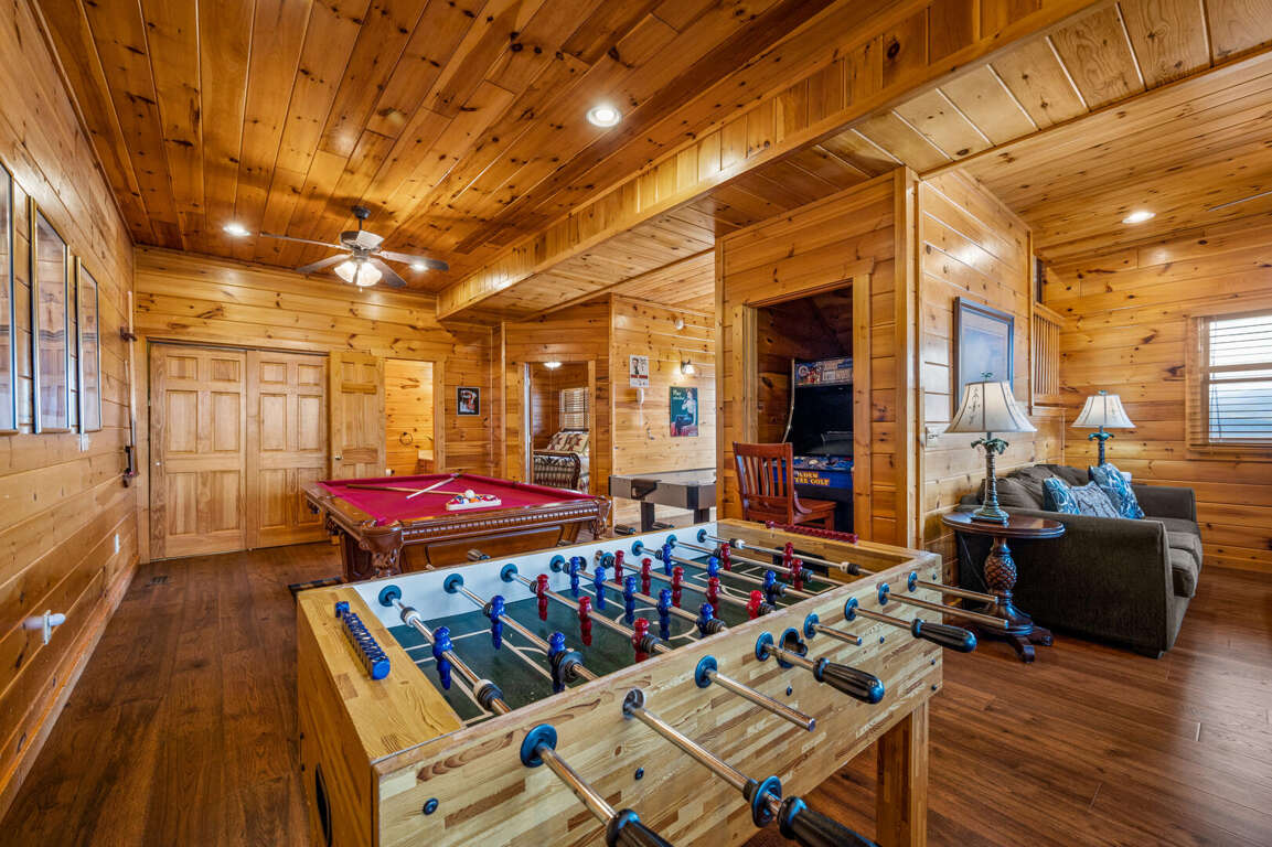 The lower level is a destination in itself — a sprawling entertainment and game zone featuring a pool table, foosball, air hockey, and a classic arcade-style game for endless fun. A wet bar with fridge and microwave makes movie nights effortless in the theatre-style seating area with a large flat-screen TV. Throughout the cabin, you’ll find five flat-screen televisions, cable service, and high-speed internet to keep everyone connected.