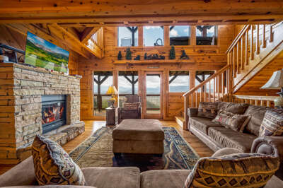 Lookout Lodge comfortably sleeps 10 guests, featuring three king bedrooms, two queen beds, and four full baths plus a half bath, ensuring ample privacy for everyone. From the moment you step inside, you’ll be enveloped in warmth and craftsmanship — tongue-and-groove wood walls and soaring ceilings, paired with rich hardwood floors that flow seamlessly throughout. The open-concept main level showcases rustic sophistication, anchored by a stacked-stone electric fireplace and expansive windows framing breathtaking mountain views.