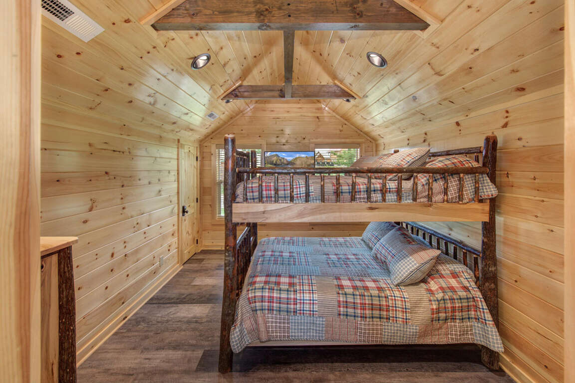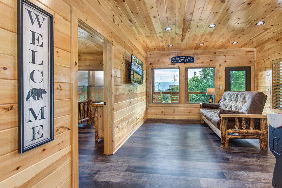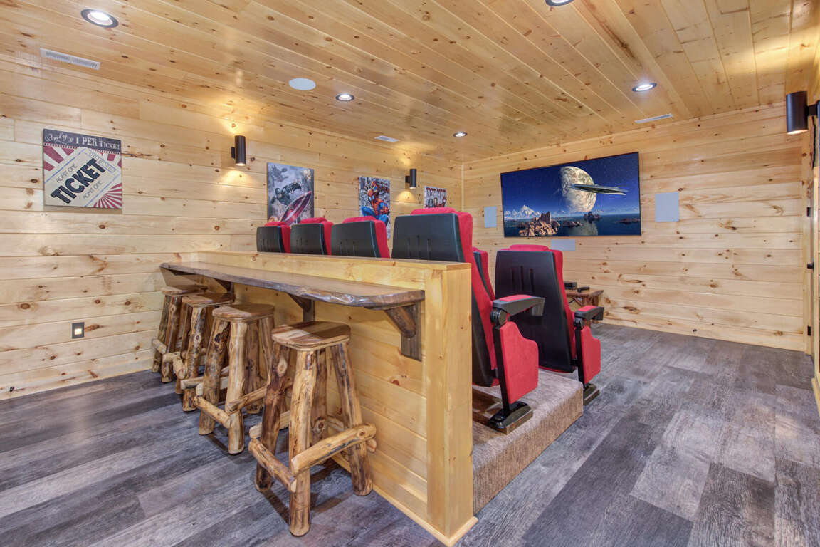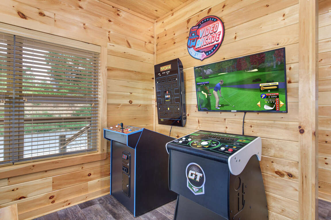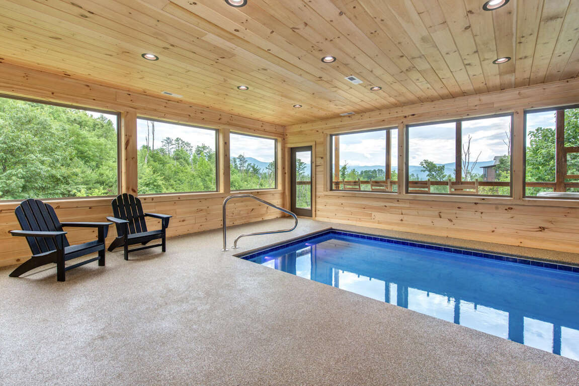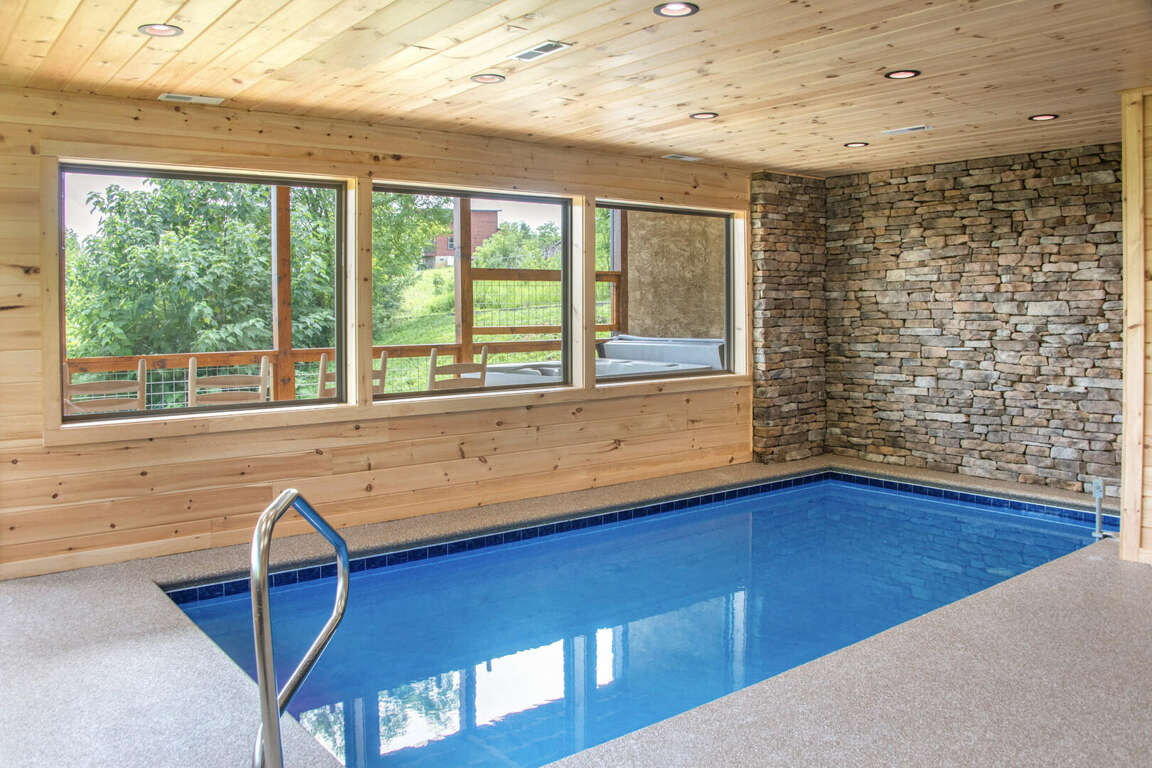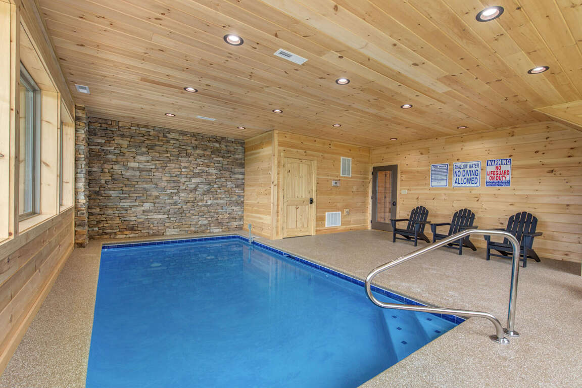 Jump on Inn to this luxurious new pool cabin. Enter on the main floor to wood floors and gorgeous tongue & groove throughout. Main floor features three king bedrooms with En Suites & queen futon sleeping space with arcade games and flat screens in every room. Ascend to the second floor for queen over queen bunk bed room, fully furnished kitchen with oversized island for meal prep, perfect for enjoying meals for evenings in. Spacious living room space with log furniture, soaring chapel sealing, stacked stone gas fireplace, Amish farmhouse dining table and numerous windows that perfectly frame the breathtaking mountain views. Main floor also has exterior deck, perfect for morning coffee and star filled nights. For some real fun & R & R, head to the lower level for indoor swimming pool, outdoor jetted jacuzzi tub, deck rockers & oversized movie theatre space, enough room for everyone to kick back together and watch your favorite movies.