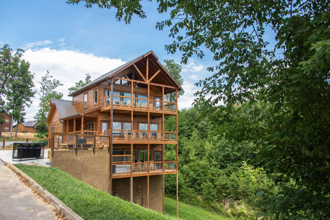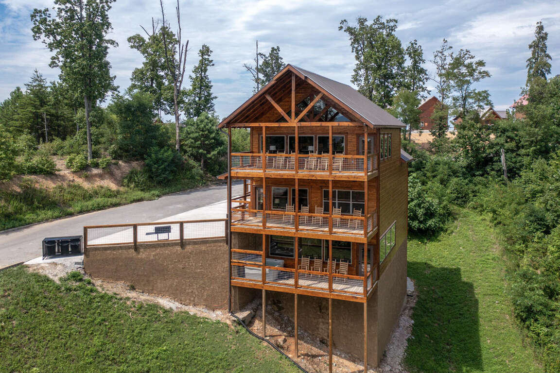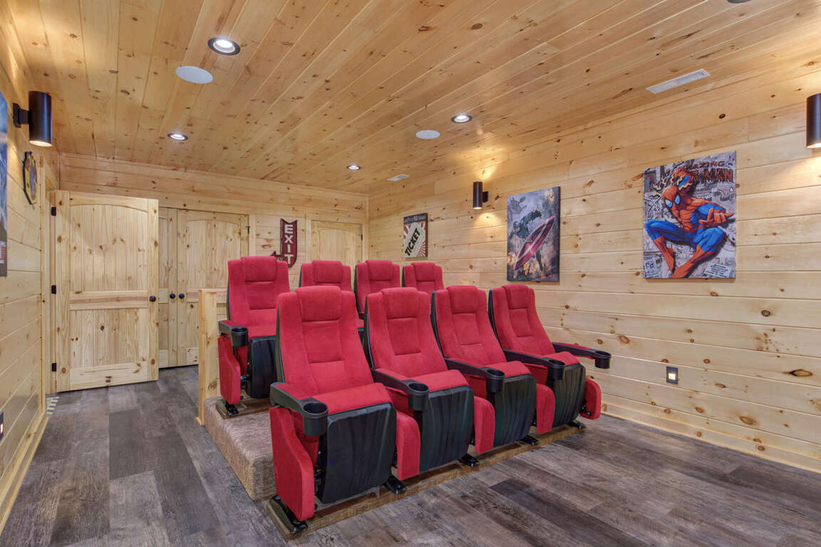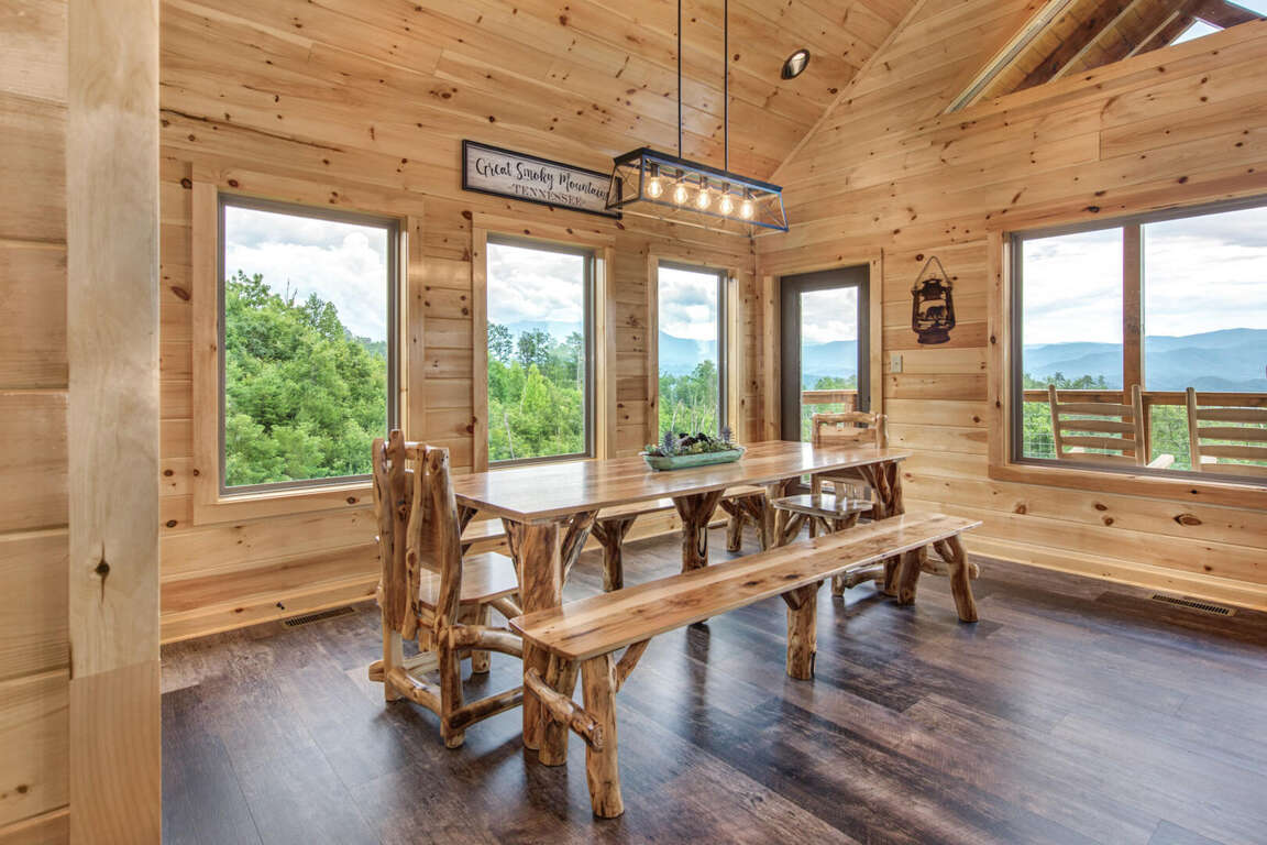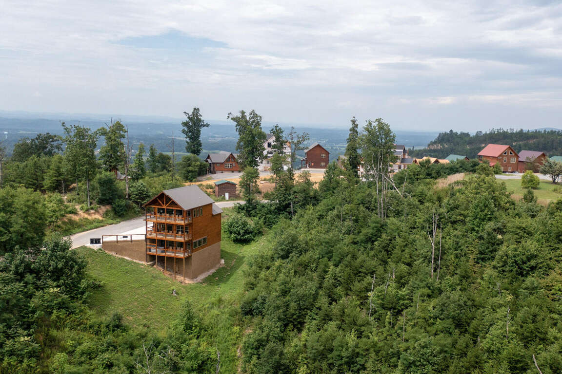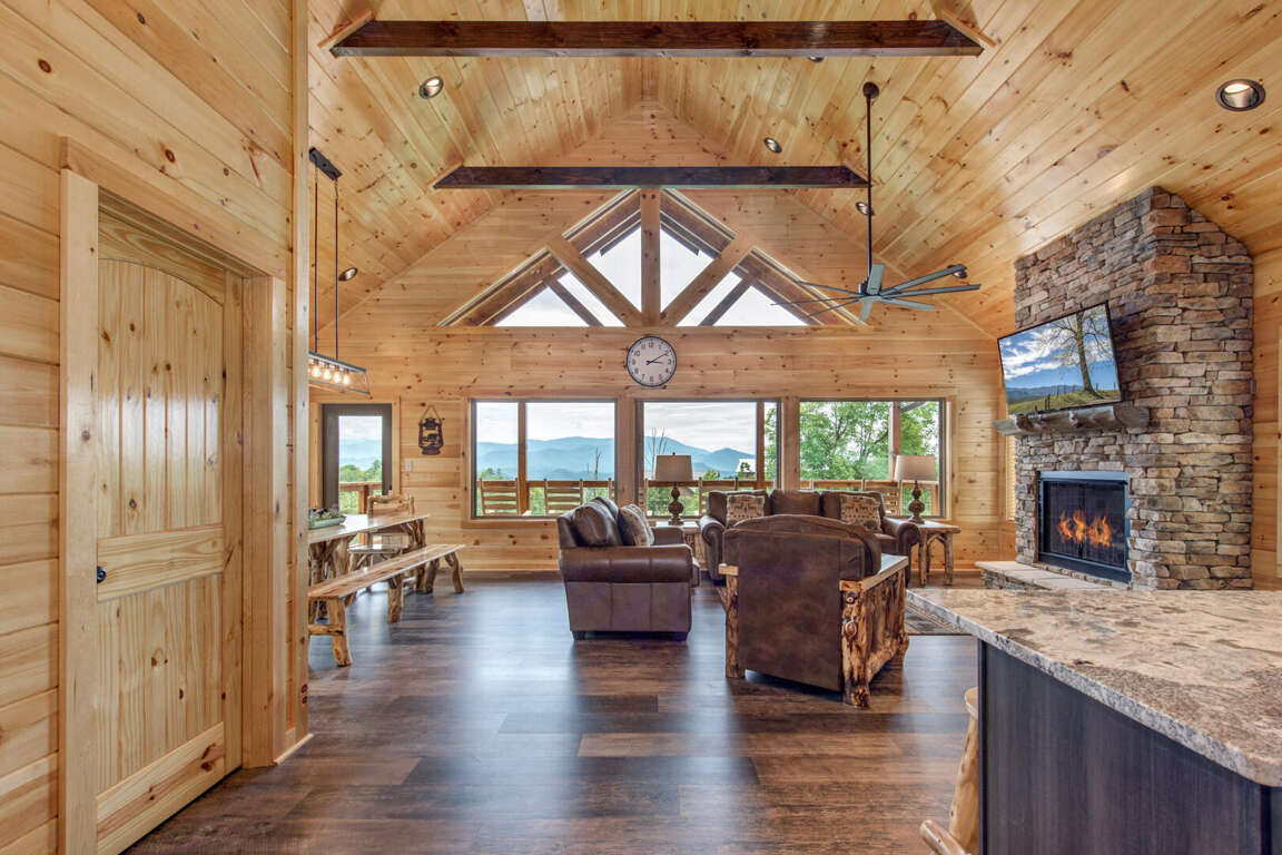 Jump on Inn to this luxurious new pool cabin. Enter on the main floor to wood floors and gorgeous tongue & groove throughout. Main floor features three king bedrooms with En Suites & queen futon sleeping space with arcade games and flat screens in every room. Ascend to the second floor for queen over queen bunk bed room, fully furnished kitchen with oversized island for meal prep, perfect for enjoying meals for evenings in. Spacious living room space with log furniture, soaring chapel sealing, stacked stone gas fireplace, Amish farmhouse dining table and numerous windows that perfectly frame the breathtaking mountain views. Main floor also has exterior deck, perfect for morning coffee and star filled nights. For some real fun & R & R, head to the lower level for indoor swimming pool, outdoor jetted jacuzzi tub, deck rockers & oversized movie theatre space, enough room for everyone to kick back together and watch your favorite movies.