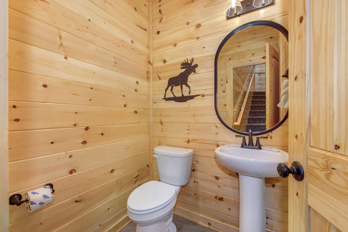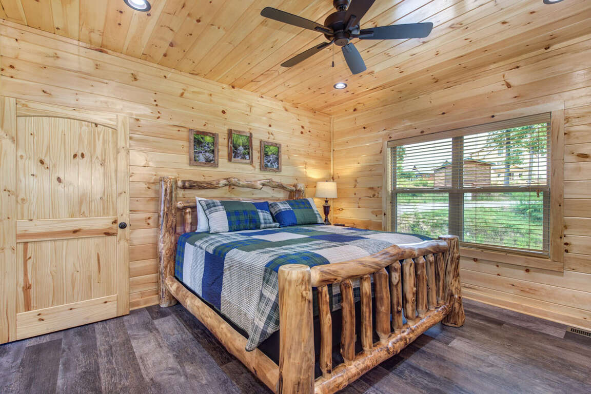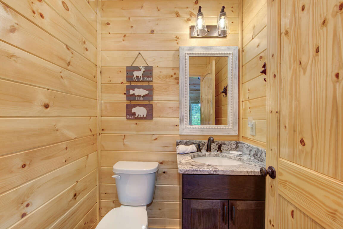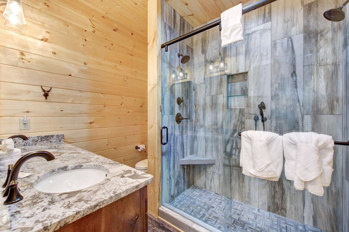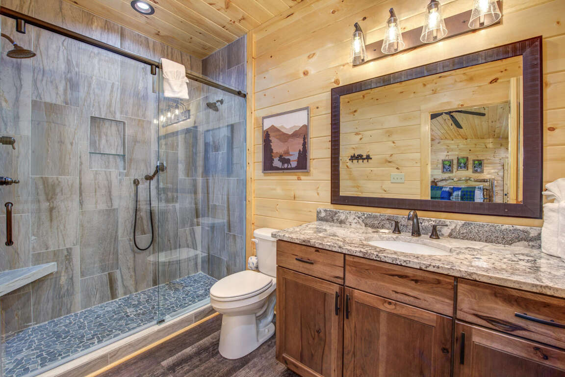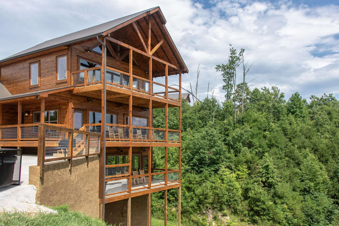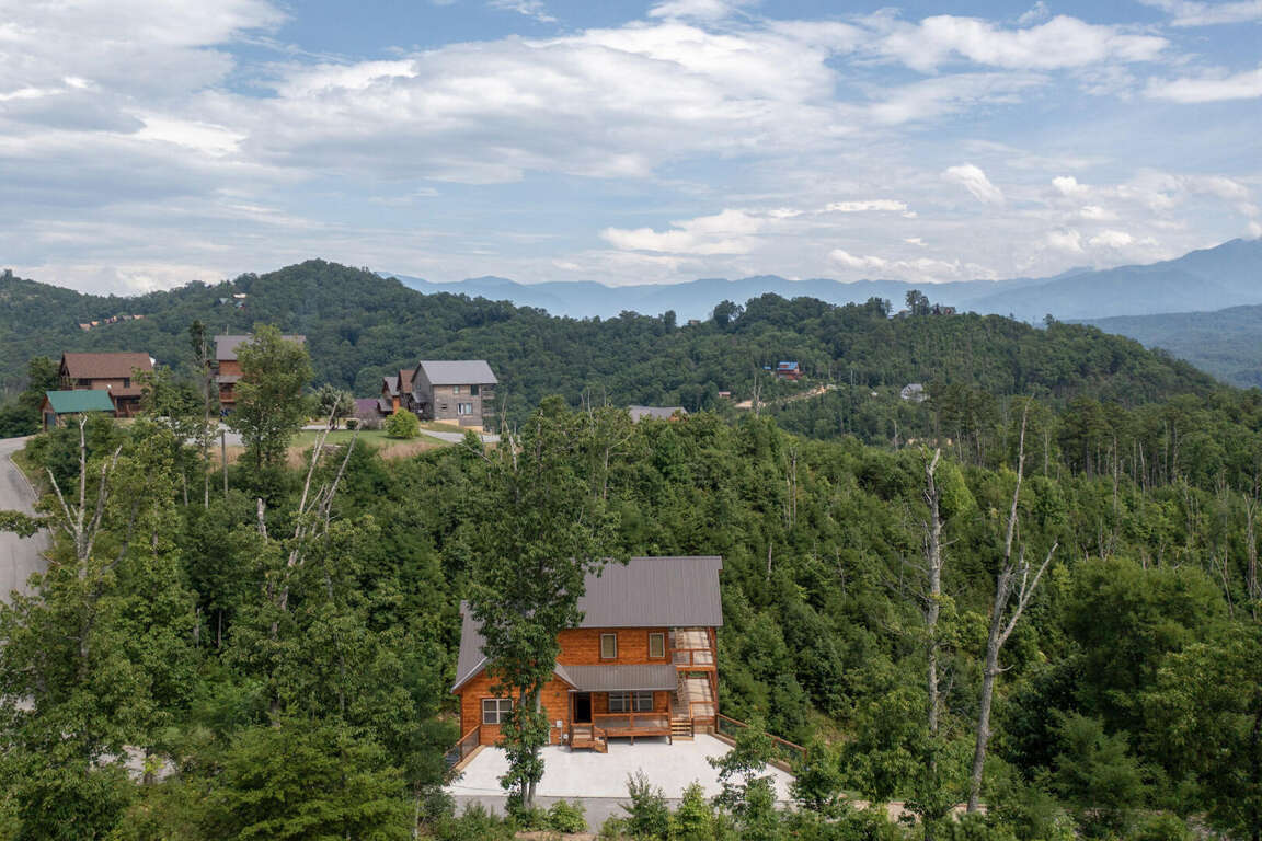 Jump on Inn to this luxurious new pool cabin. Enter on the main floor to wood floors and gorgeous tongue & groove throughout. Main floor features three king bedrooms with En Suites & queen futon sleeping space with arcade games and flat screens in every room. Ascend to the second floor for queen over queen bunk bed room, fully furnished kitchen with oversized island for meal prep, perfect for enjoying meals for evenings in. Spacious living room space with log furniture, soaring chapel sealing, stacked stone gas fireplace, Amish farmhouse dining table and numerous windows that perfectly frame the breathtaking mountain views. Main floor also has exterior deck, perfect for morning coffee and star filled nights. For some real fun & R & R, head to the lower level for indoor swimming pool, outdoor jetted jacuzzi tub, deck rockers & oversized movie theatre space, enough room for everyone to kick back together and watch your favorite movies.