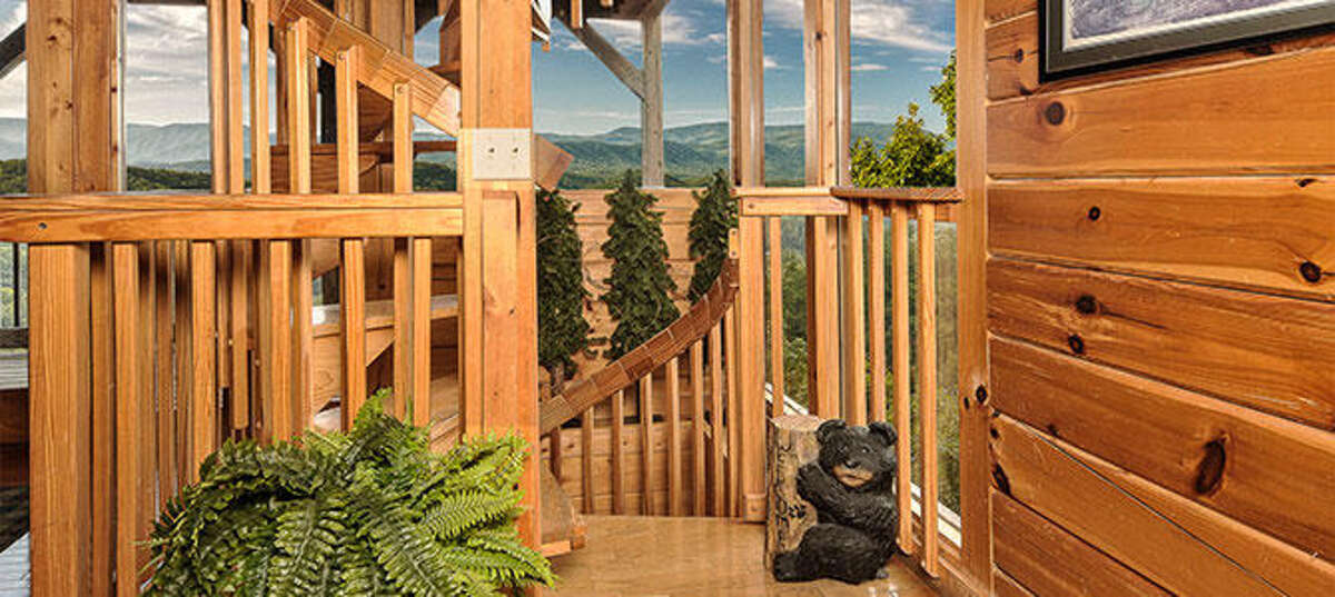 Clouds & Mountains Lodge is a spacious four-bedroom cabin in Starr Crest Resort. This cabin is perfect for large families or friend groups. It sleeps 12 guests with three queen beds, one king bed, one queen sleeper sofa, two futons and four bathrooms. Clouds & Mountains Lodge offers spectacular Smoky Mountain views that guests can enjoy from the deck swings, gliders, rockers and hot tub. The living room provides a central location to lounge and fellowship with a fireplace and large flat screen TV. The full kitchen and dining areas provide the perfect place to prepare and enjoy meals with family and friends. The pool table, foosball table and video game arcade provide hours of fun entertainment. The spiral staircase adds a touch of whimsy and adventure. Clouds & Mountains is only 5.5 miles from Dollywood theme park and Dollywood's Splash Country water park. Also, the cabin is just minutes away from other area attractions in Pigeon Forge and Gatlinburg.