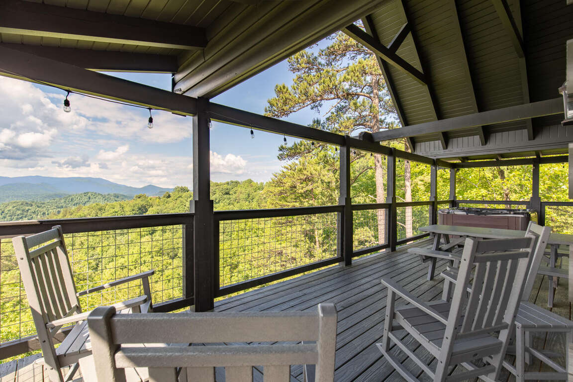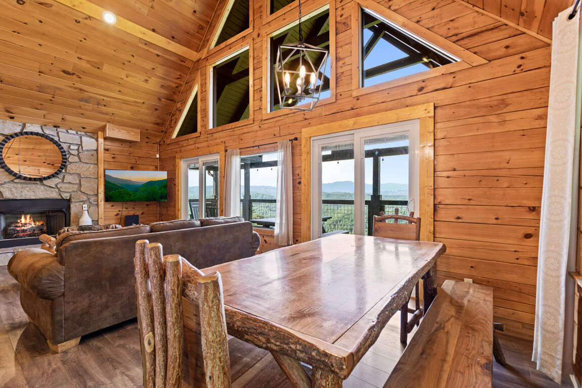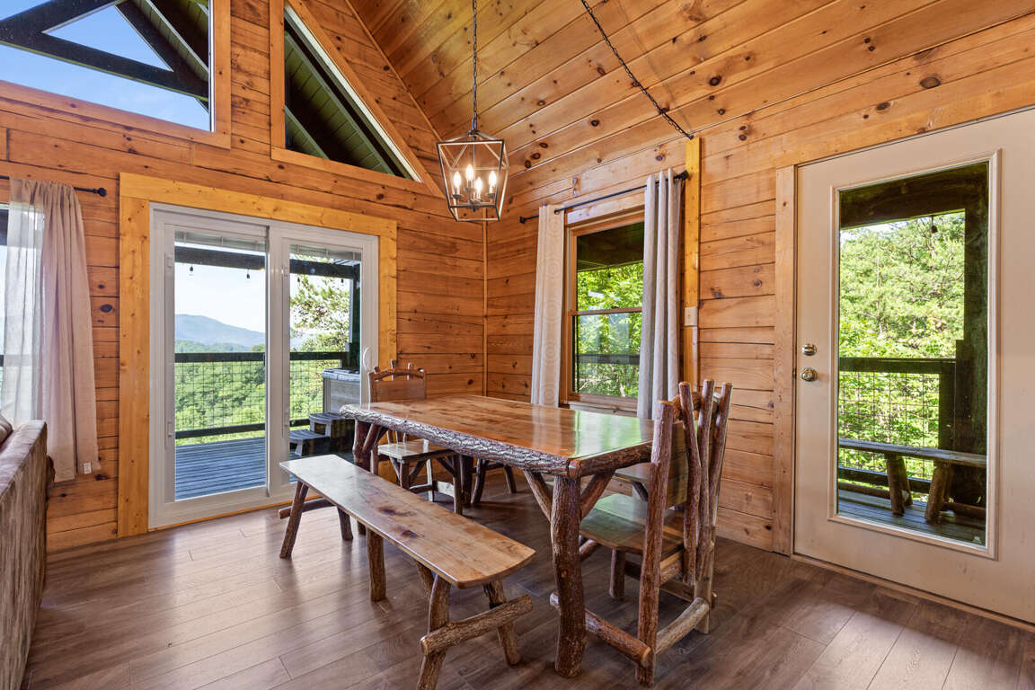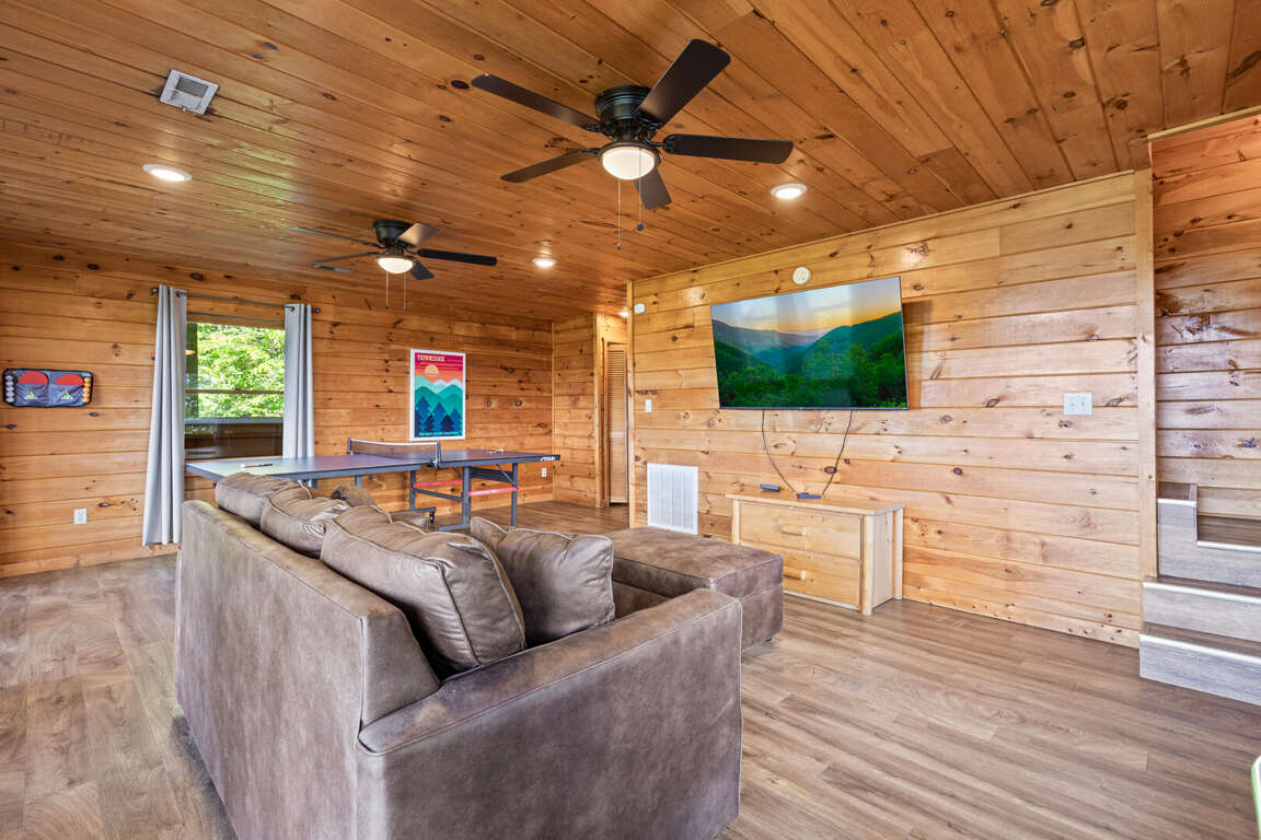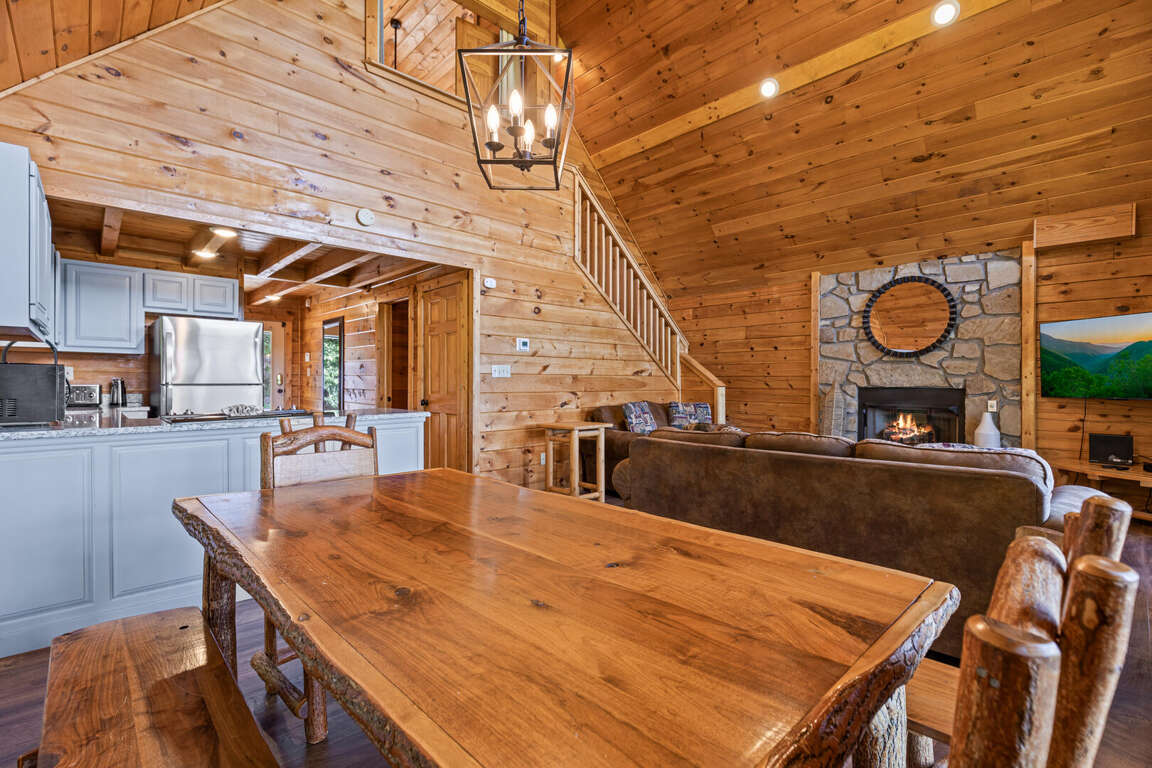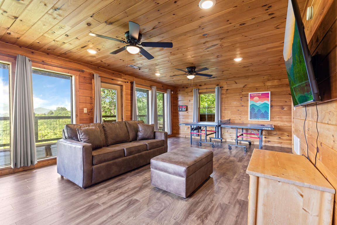 Updated in May 2024, Serenity Now is a serene three-bedroom cabin in Mountain View Court. This traditional log cabin home offers a rustic cabin feel with luxurious amenities. Serenity Now sleeps 12 guests with two king beds, one queen bed, two queen sleeper sofas, twin bunk bed and three bathrooms. Guests will enjoy the privacy of being tucked away in the mountains but also love the convenience of being minutes from exciting area attractions. The large floor-to-ceiling stone fireplace is the centerpiece of the living room. Guests can enjoy a movie on the TV or beautiful mountain views through the picture windows. The full kitchen offers guests the option to create delicious home-cooked meals to enjoy at the large dining table or outdoor picnic table. Kids and adults alike will enjoy friendly competition playing ping pong and classic video games. Out on the deck, guests can take in the breathtaking mountain views from the relaxing hot tub and deck rockers. Serenity Now is only 6.5 miles from Dollywood theme park and Dollywood's Splash Country water park. Also, this cabin is only minutes away from other area attractions in Pigeon Forge and Gatlinburg.