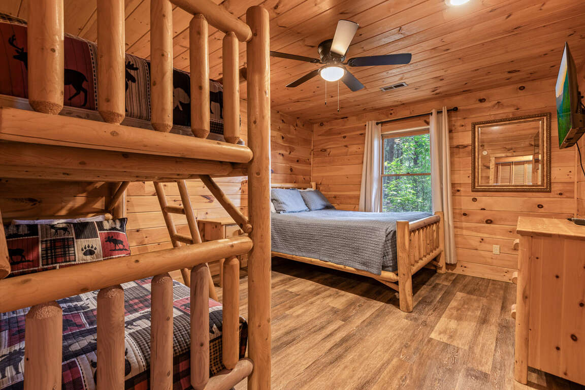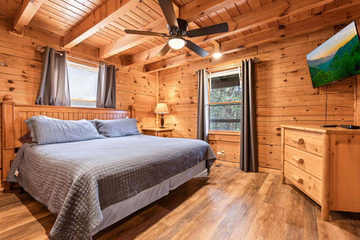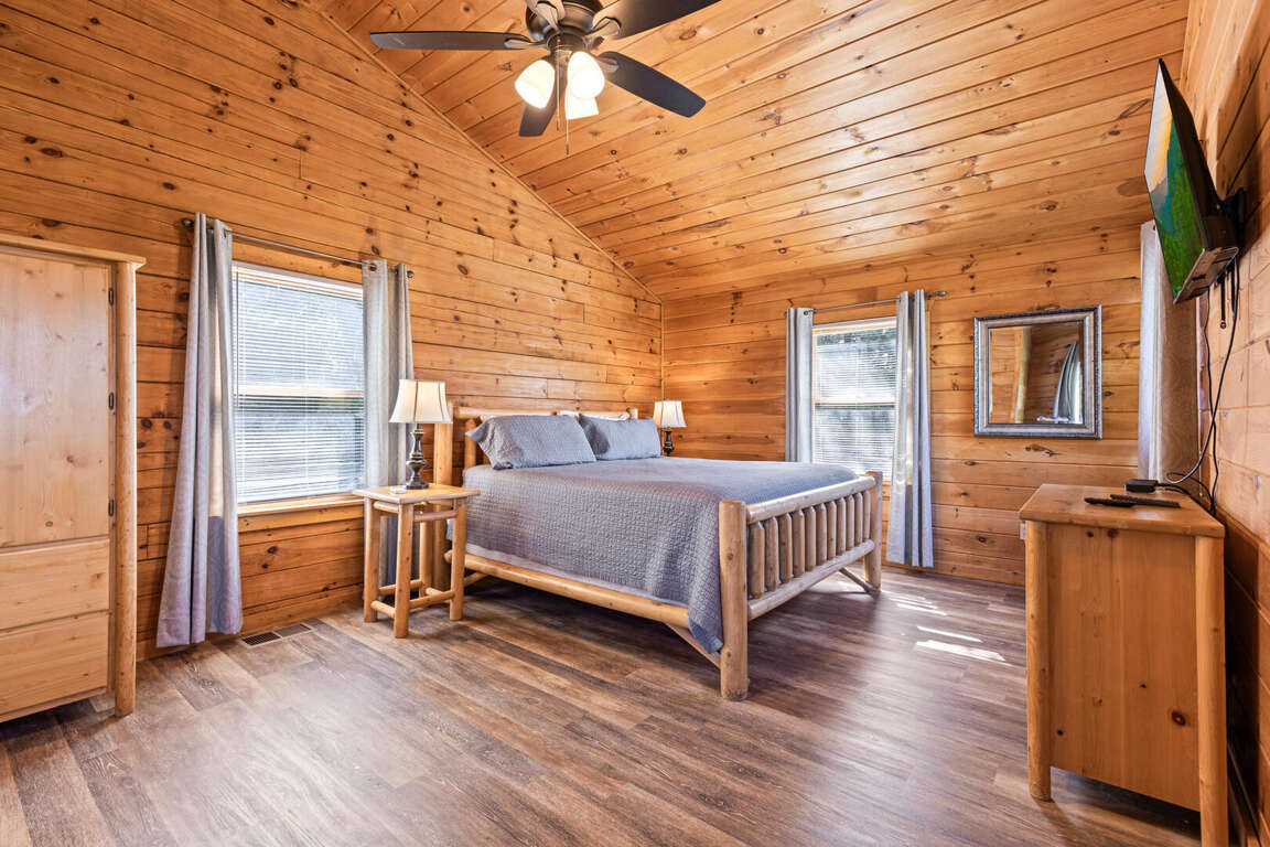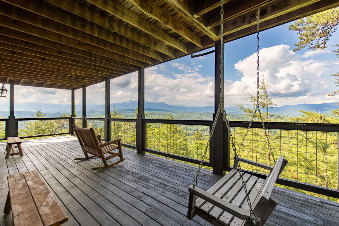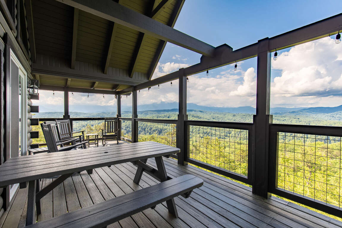 Updated in May 2024, Serenity Now is a serene three-bedroom cabin in Mountain View Court. This traditional log cabin home offers a rustic cabin feel with luxurious amenities. Serenity Now sleeps 12 guests with two king beds, one queen bed, two queen sleeper sofas, twin bunk bed and three bathrooms. Guests will enjoy the privacy of being tucked away in the mountains but also love the convenience of being minutes from exciting area attractions. The large floor-to-ceiling stone fireplace is the centerpiece of the living room. Guests can enjoy a movie on the TV or beautiful mountain views through the picture windows. The full kitchen offers guests the option to create delicious home-cooked meals to enjoy at the large dining table or outdoor picnic table. Kids and adults alike will enjoy friendly competition playing ping pong and classic video games. Out on the deck, guests can take in the breathtaking mountain views from the relaxing hot tub and deck rockers. Serenity Now is only 6.5 miles from Dollywood theme park and Dollywood's Splash Country water park. Also, this cabin is only minutes away from other area attractions in Pigeon Forge and Gatlinburg.