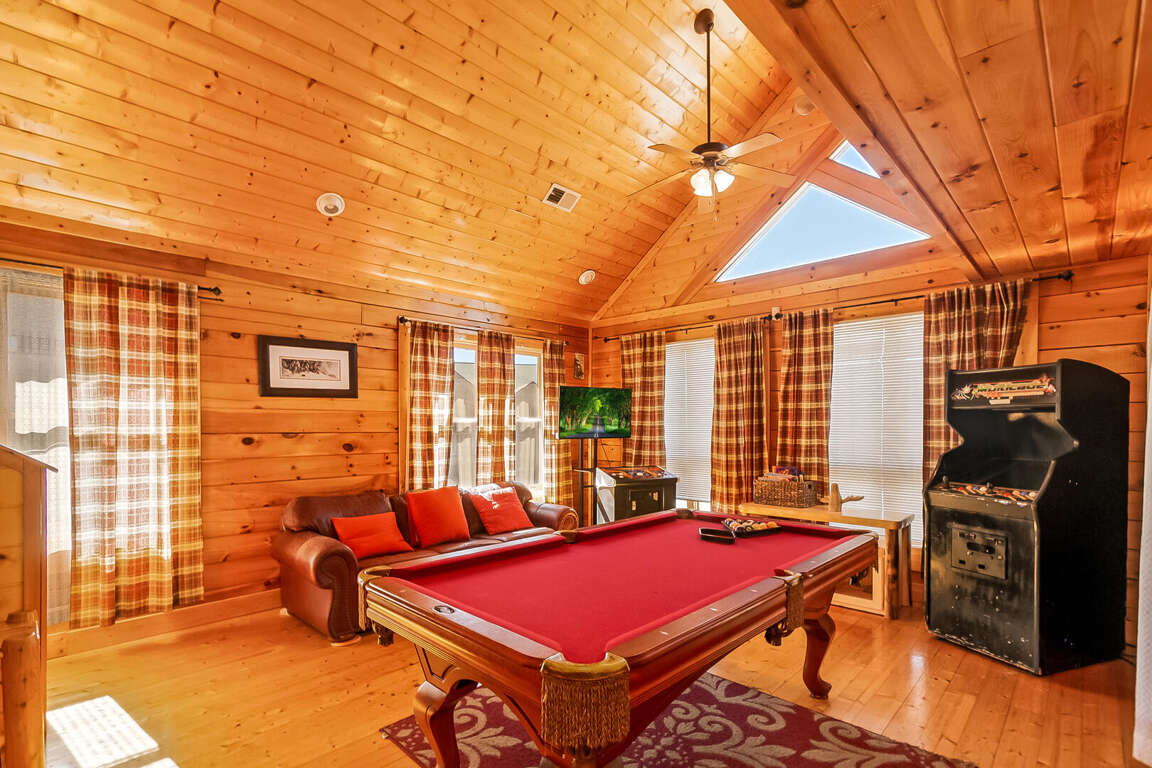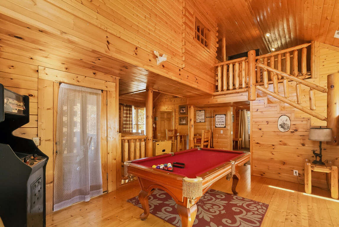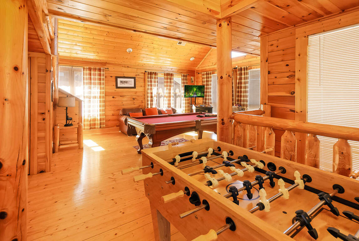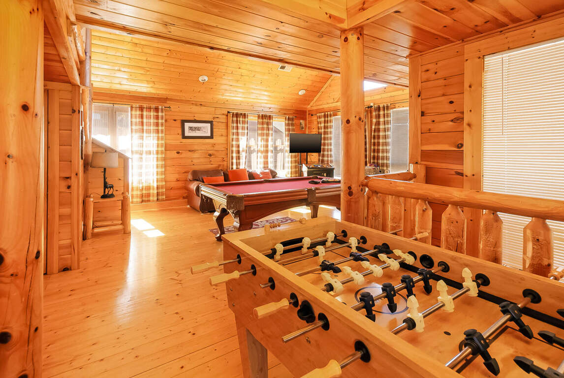 Center of Attention is a beautiful cabin that offers a wonderful experience in the smokies! With 2 master suites, a 2-queen bed loft area and a children's bunk room, this cabin sleeps 12. Walk in, through the kitchen you will see your dining room and living room (with electric fireplace). To the left is a master suite. To the right there is a door that leads to the private outdoor hot tub, perfect for those chilly nights. Up the first flight of stairs, you will find a half bath and a game room/ lounge area equipped with a pool table, foosball table, golden T video game and multi-arcade video game. Beautiful outdoor balcony with a view. On this floor there is also another master suite with a TV. Enjoy the tree house feel of the adorable loft area that you can see from the Rec room. The loft includes 2 sleeping areas: 1 with 2 queen beds and a TV and 1 with a twin bunk bed. This is a pet friendly property.
