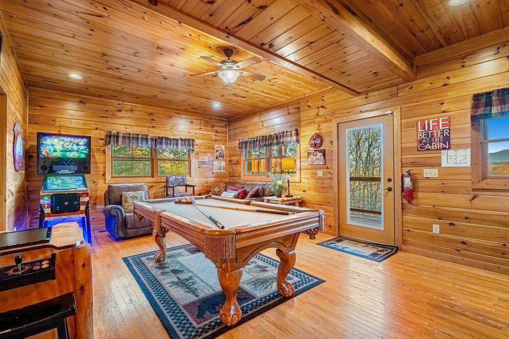 Throughout the lodge, you’ll find six flat-screen TVs with cable, free high-speed internet, and entertainment options designed for all ages. The expansive game room features a pool table, pinball machine, multi-game arcade, and foosball, offering endless fun and friendly competition.