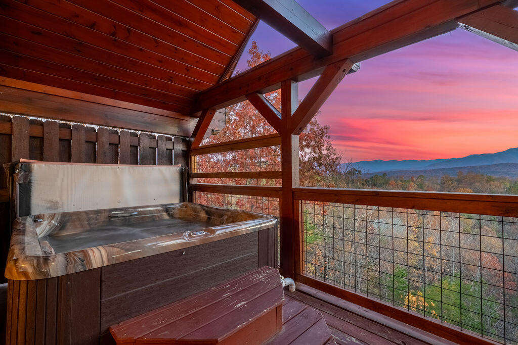 This stunning three-story retreat offers adventure around every corner, with outdoor deck access on every level, allowing you to experience the sights, sounds, and serenity of the Smoky Mountains from every floor. Step outside to relax on the spacious decks—each offering rocking chairs and outdoor dining areas for savoring morning coffee, mountain breezes, or evening sunsets. Two private hot tubs invite you to unwind beneath the stars, while a charcoal grill makes outdoor dining a delight.