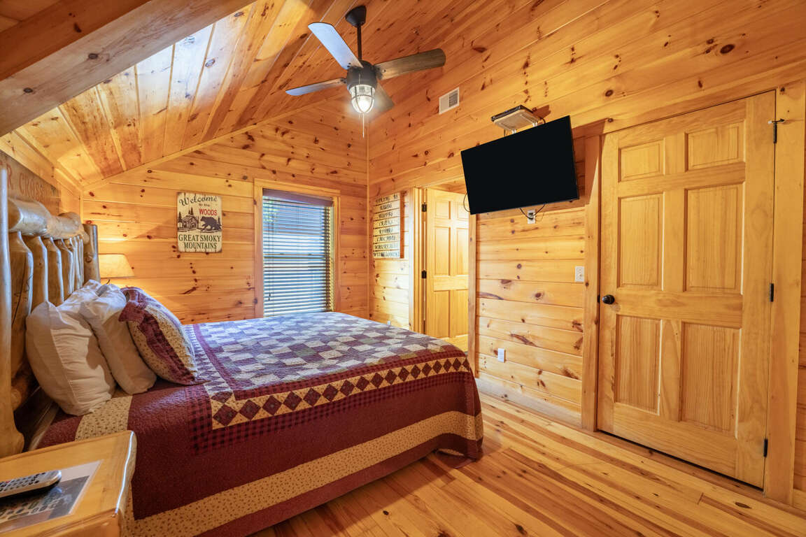 As you step inside, you’re greeted by sun-drenched living spaces where oversized windows reveal breathtaking, uninterrupted views of the Smokies stretching to the horizon. The crackling gas fireplace invites you to curl up with a cup of cocoa, while the big screen TV is perfect for movie nights or lazy morning cartoons.