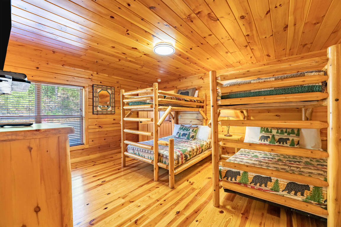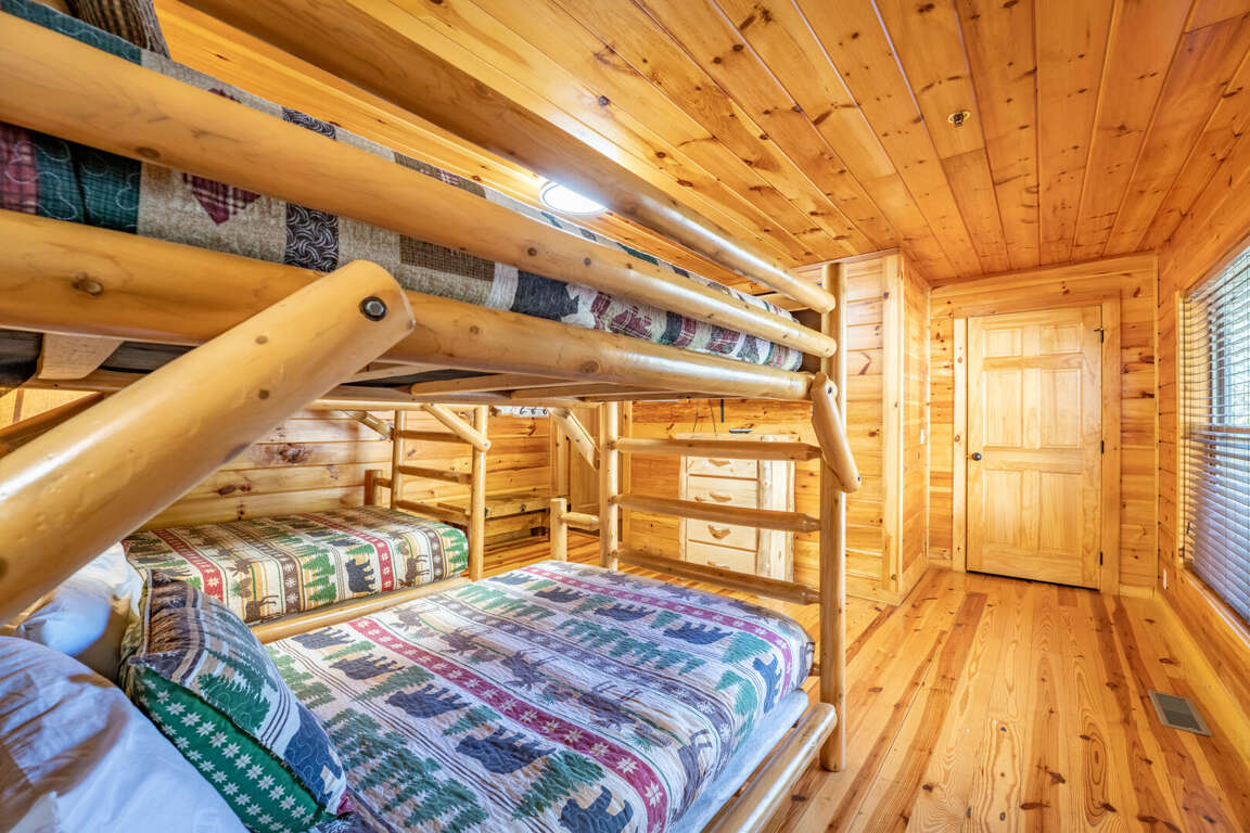 A bunk room featuring two twin-over-queen beds and its own full bath—ideal for kids or extra guests