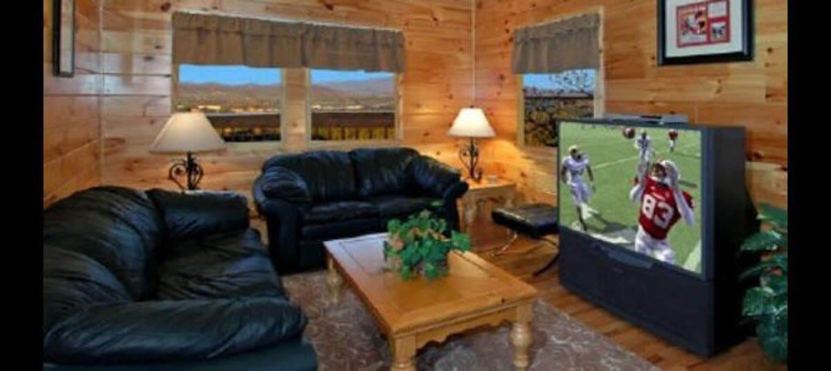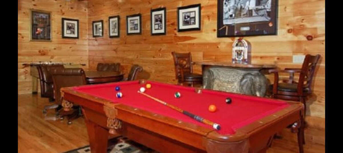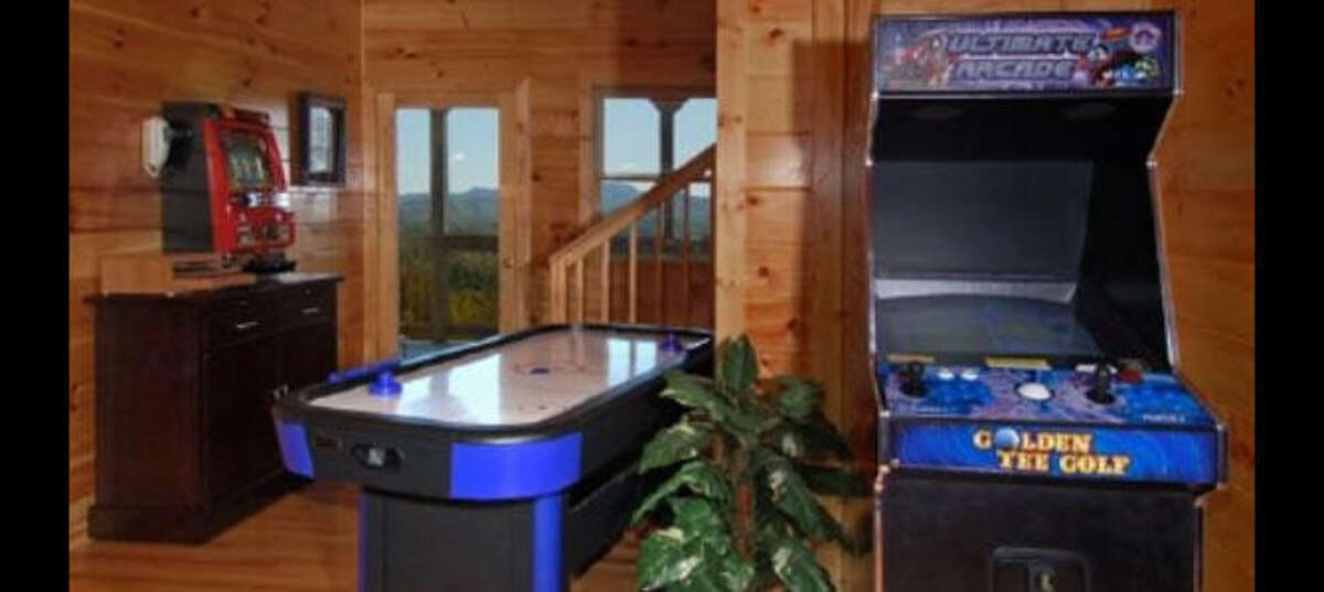 Majestic Mountain is a spacious four-bedroom cabin is in Starr Crest Resort. This beautiful cabin has plenty of room for large families and groups. Majestic Mountain sleeps 13 guests with five kings beds, one queen sleeper sofa, one futon and 4.5 bathrooms. Guests will enjoy beautiful views overlooking the Smoky Mountains and Dollywood from the cabin's three decks. Guests can also take in the views from the living room through the large picture windows. The living area also has a beautiful stone fireplace and large flat screen TV that provide that home-like feel. Adjacent to the living room are the master bedrooms with comfortable king beds and adjoining full bathrooms furnished with two-person Jacuzzi tubs. The full kitchen with an island and the dining area provide plenty of space to conveniently create and enjoy meals as a group. Downstairs, guests will find a uniquely decorated game room with air hockey, foosball, pool and a video arcade system with 48 games. Majestic Mountain is located 5.5 miles from Dollywood theme park and Dollywood's Splash Country water park. Also, the cabin is just minutes away from other area attractions in Pigeon Forge and Gatlinburg.