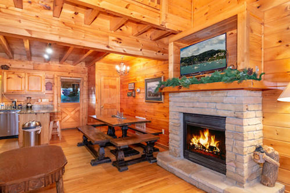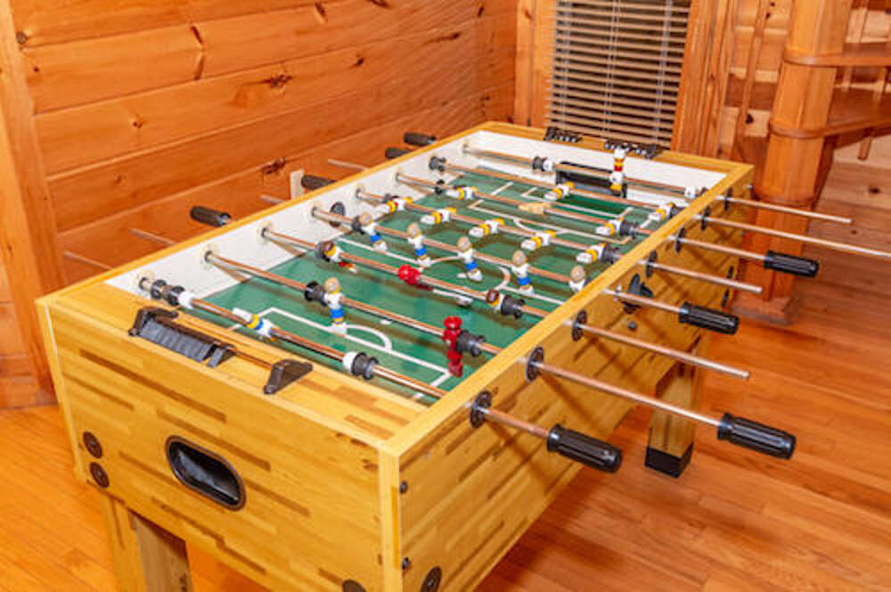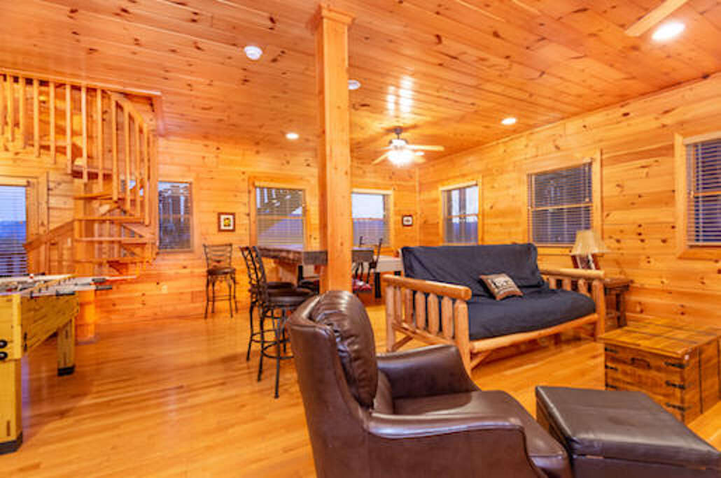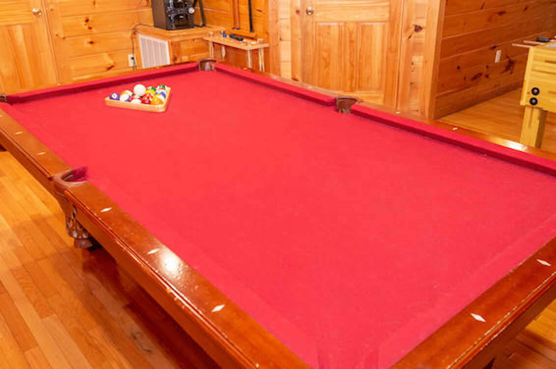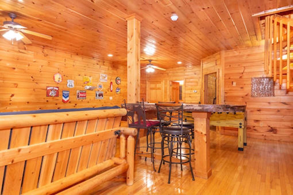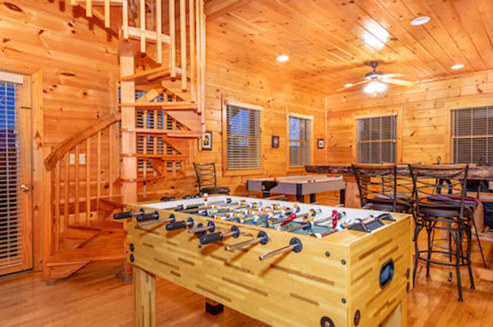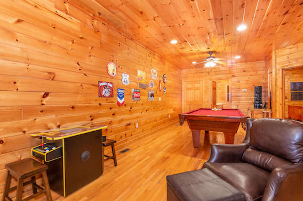 Starr Crest Lodge is a gorgeous four-bedroom cabin located in Starr Crest Resort. This inviting and spacious cabin is an amazing retreat for the whole family. Starr Crest Lodge sleeps 15 guests with one king bed, five queen beds, queen sleeper sofa, futon and four bathrooms. Guests can enjoy quality family time in the living room watching movies on the couch or fellowshipping around the beautiful stone fireplace. The full kitchen is the perfect place to create delicious meals together to enjoy at the large dining room table. The game room will keep the whole family entertained with pool, air hockey, foosball and a video arcade system with 48 classic games. The three decks offer spectacular views of Mt. LeConte that can be enjoyed from the hot tub or rocking chairs. Starr Crest Lodge is only 5.5 miles from Dollywood theme park and Dollywood's Splash Country water park. Also, this cabin is only minutes away from other area attractions in Pigeon Forge and Gatlinburg.
