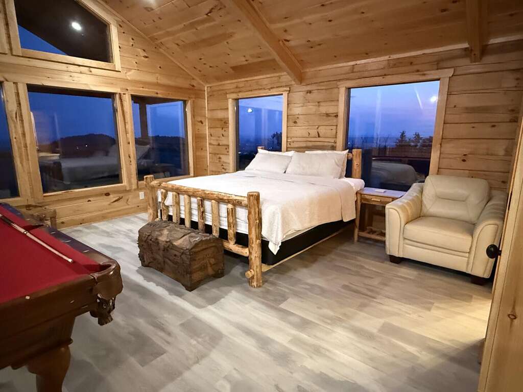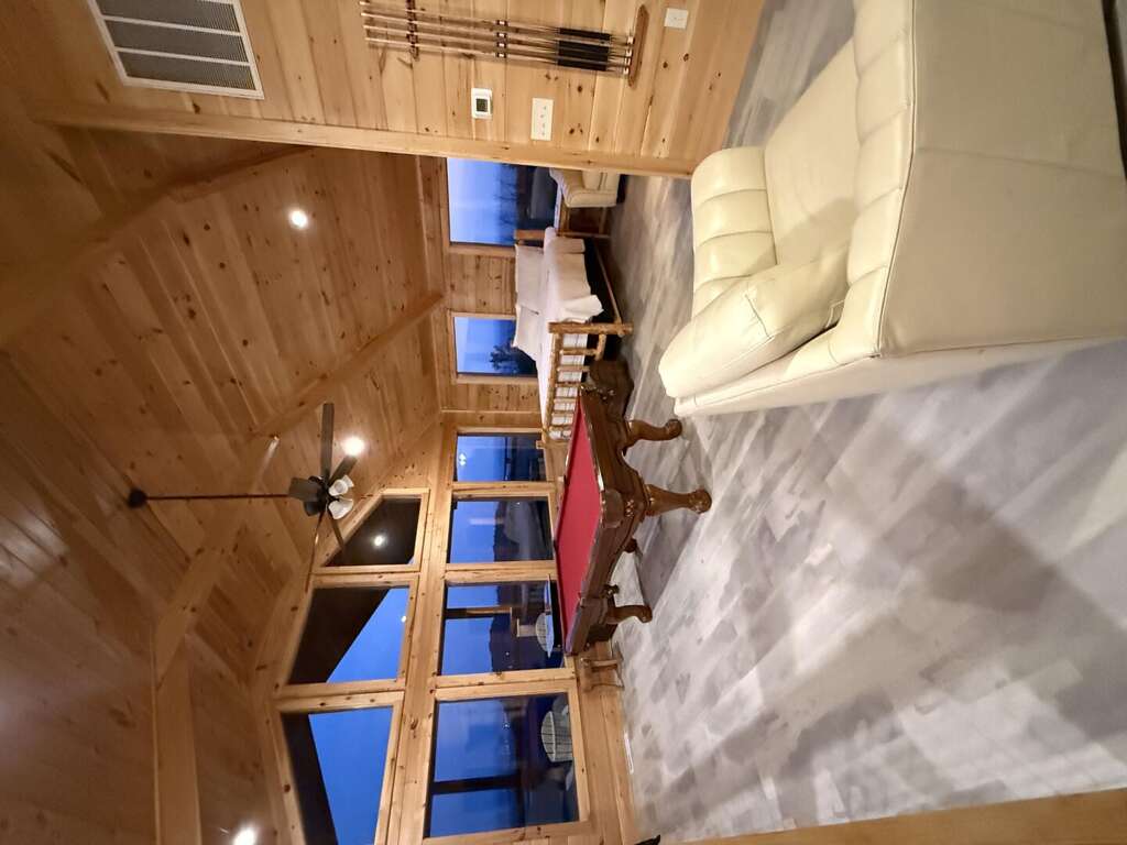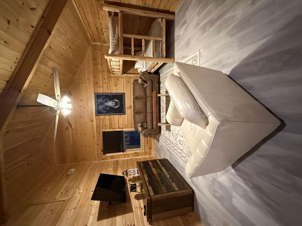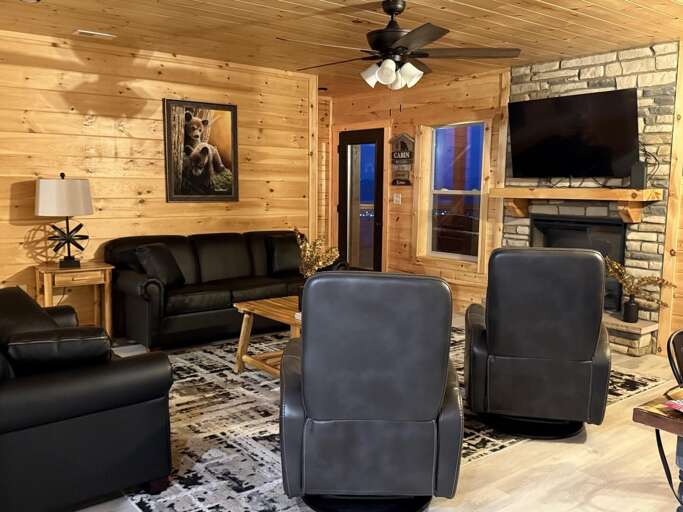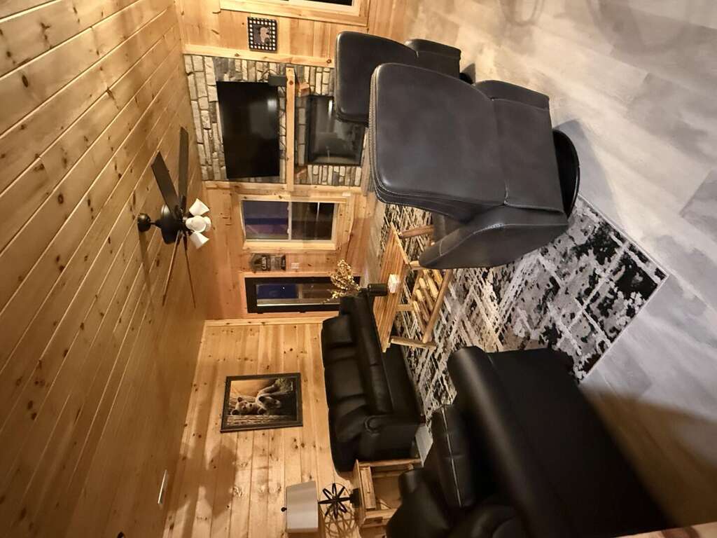 Step inside and discover a warm, wood-wrapped sanctuary where comfort and charm meet. The spacious living room welcomes you with plush seating, a cozy electric fireplace, and all the comforts of home — perfect for curling up with a book, sharing stories, or simply soaking in the glow of the mountains through expansive windows.