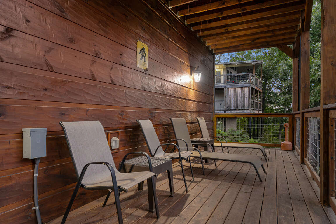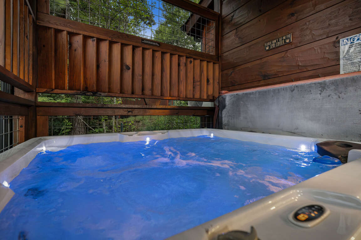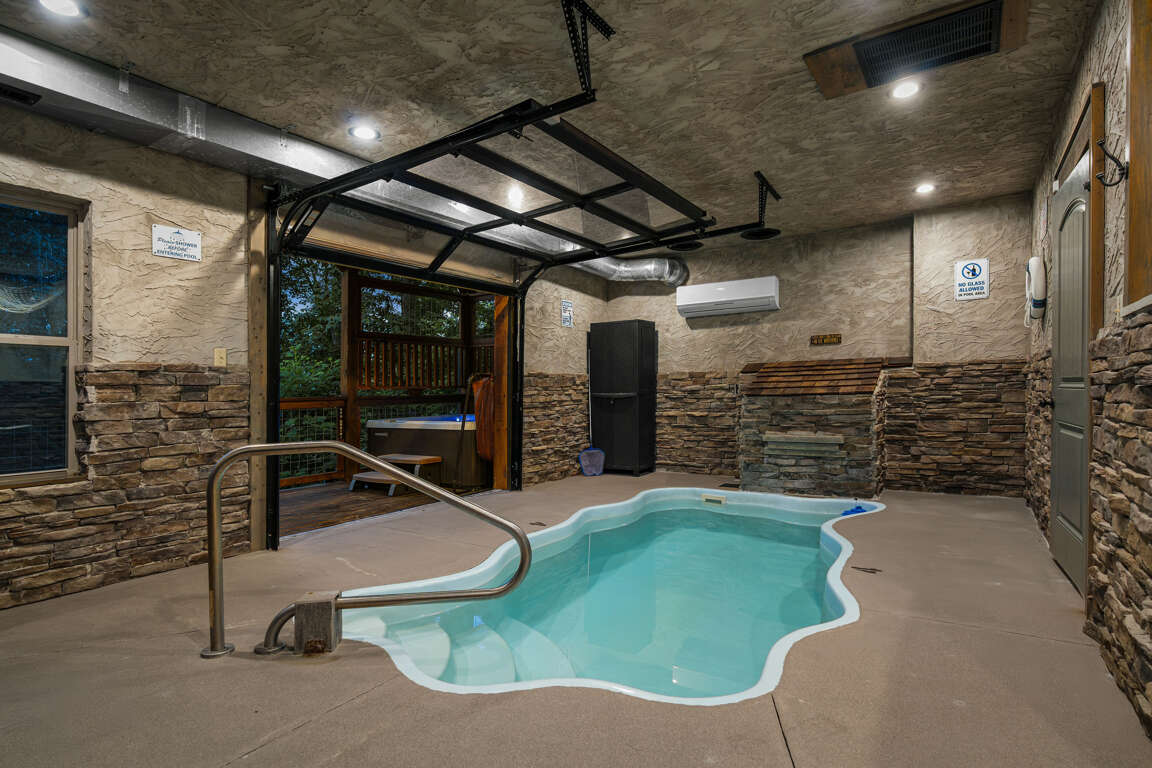 From here you can enter the indoor heated pool through a secured and alarmed door. Open the bay door to open your experience to the sounds and sites of the Smokies. If the muscles are tired after a long day of hiking or shopping you can step through the bay door to relax in the hot tub.