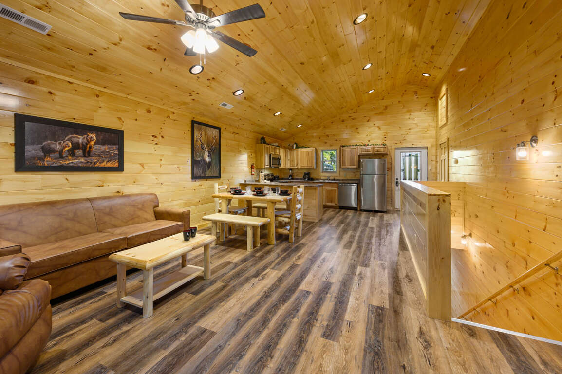 1845 sq ft Mountain Music Cabin offers 2 bedrooms with prime comfort. Boasting amenities such as Internet Access, Dishwasher, and a Hot Tub.