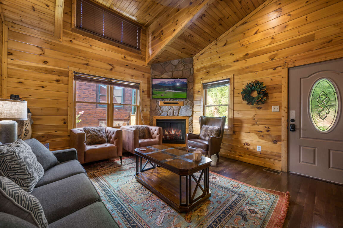 Relax in the cozy living room — featuring a stone, electric fireplace, a couch, 3 comfy armchairs, and a big screen TV! Catch up with one another or make plans for the day. And in the evenings, flip on the TV for a bit of entertainment or gather around the fireplace for bedtime stories.