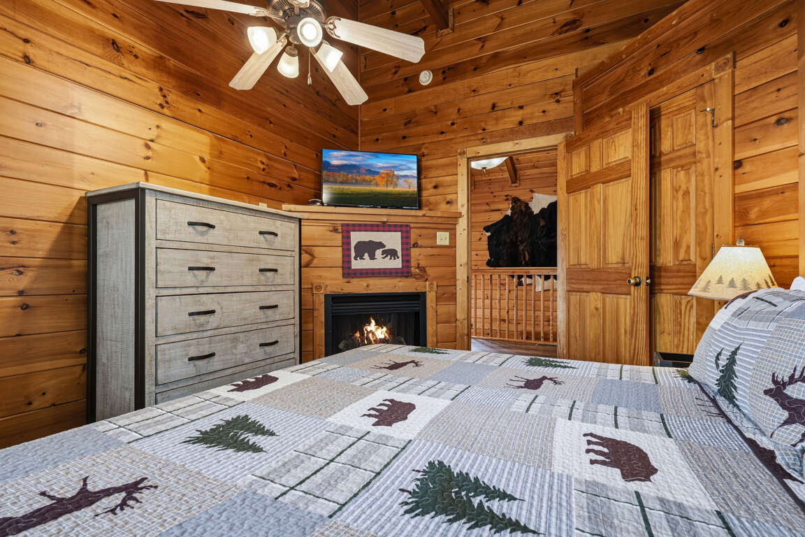 The sofa folds out into a queen sleeper sofa, allowing guests to spread out comfortably. A ceiling fan helps keep the airflow fresh during warmer months, while the electric fireplace creates a cozy cabin ambiance during cooler evenings — perfect for relaxing after a day exploring the Smoky Mountains.