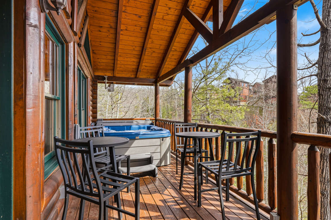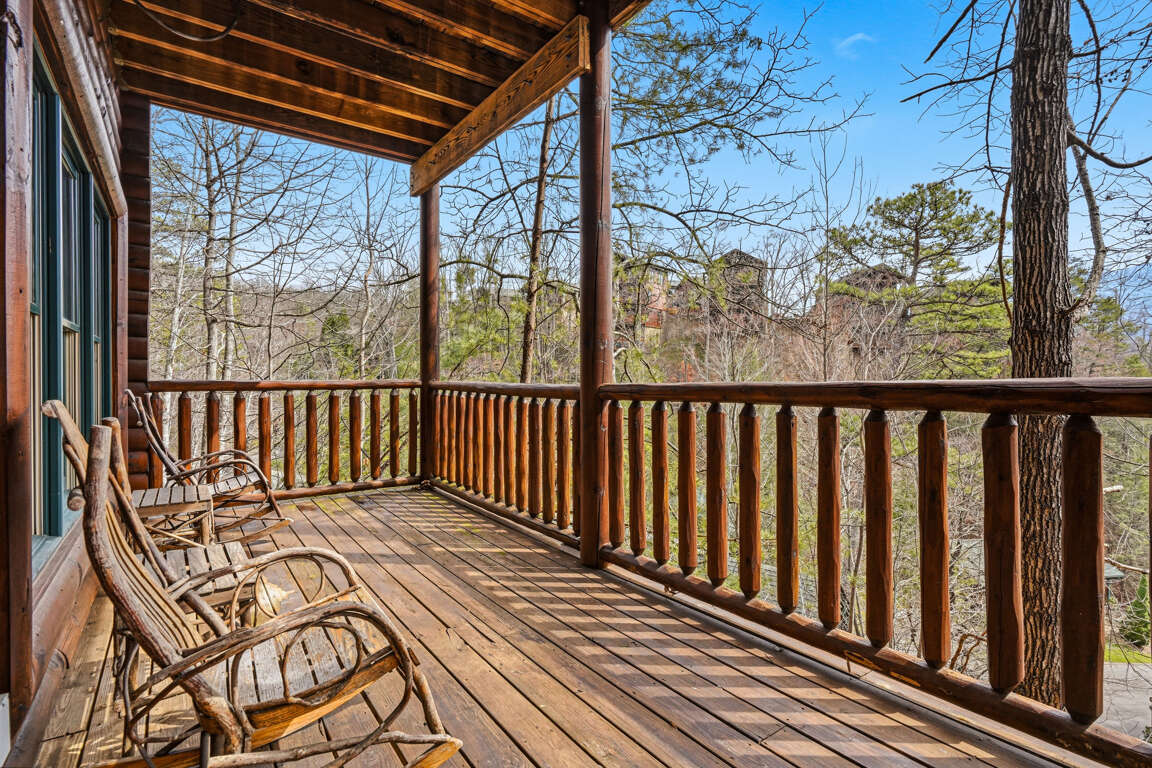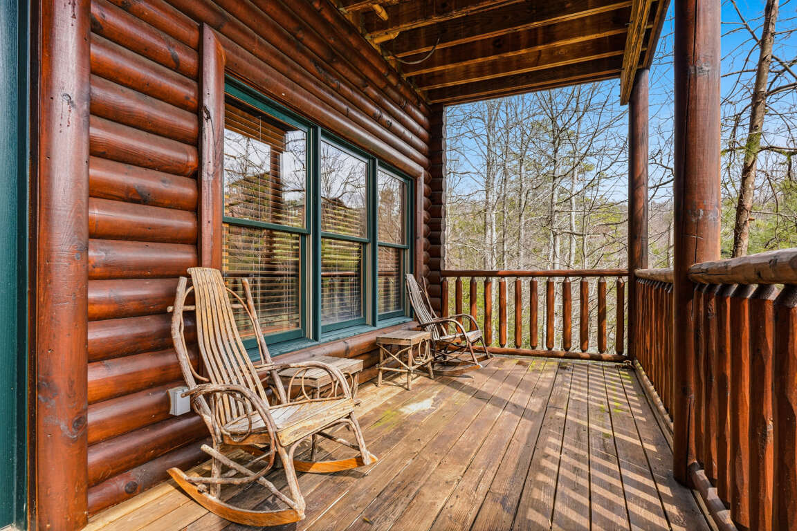 Step outside and enjoy the peaceful forest setting from the cabin’s spacious deck.