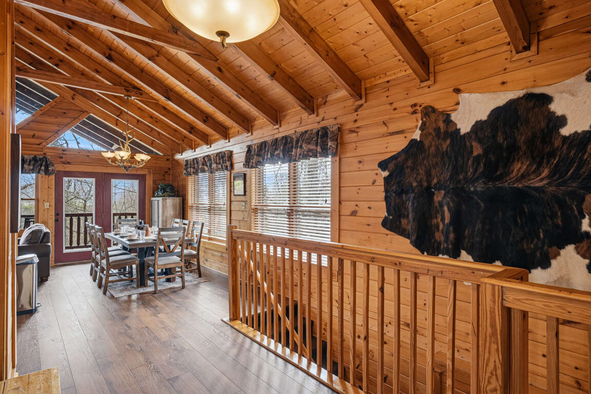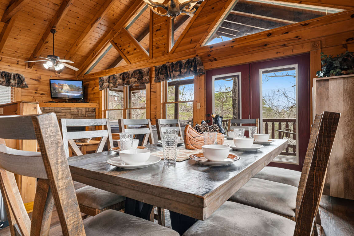 Enjoy meals together at the large wood dining table with seating for 8 guests. The open layout allows everyone to gather comfortably while still enjoying the surrounding living space.