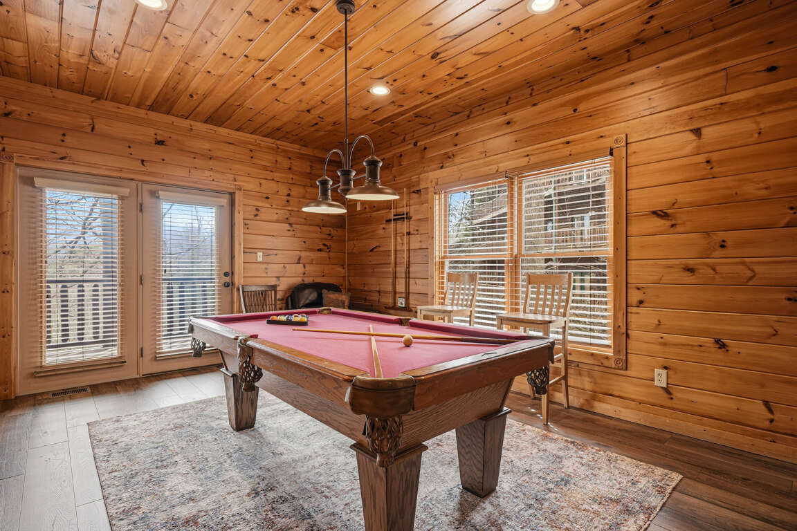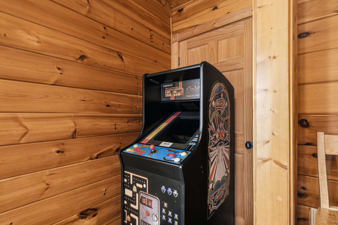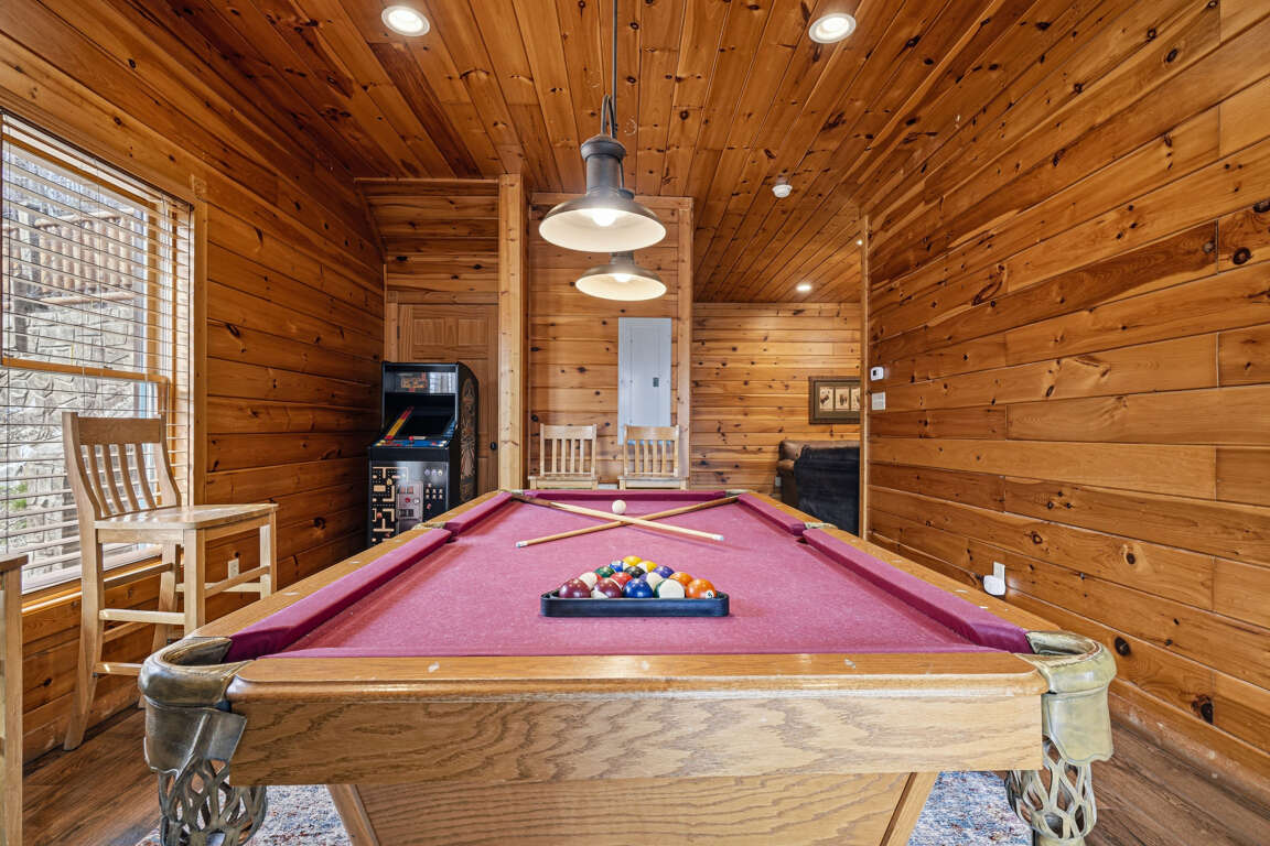 Enjoy the tranquility and beauty of the Smoky Mountains while taking advantage of the cabin’s fantastic amenities — including a game room with pool table, foosball, and arcade games, cozy fireplaces, resort pool access, and relaxing outdoor spaces designed for unwinding after a day of adventure.