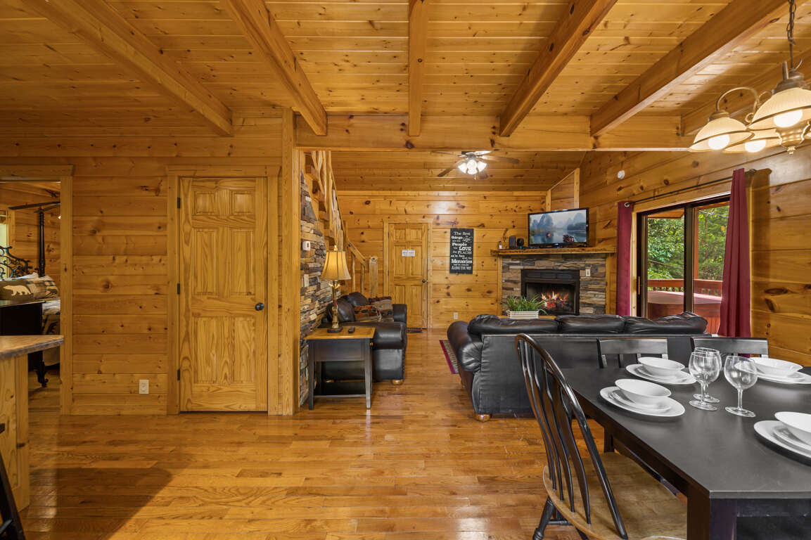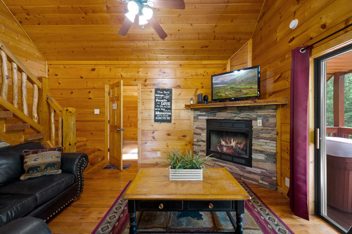 The living room is perfect for kicking your feet up and relaxing at Bearfoot Dreams. The stacked-stone gas fireplace helps create a cozy mountain cabin ambiance. Curl up with a good book while the fire crackles or turn on the TV, open a cold one, and watch a movie on the couch to unwind from a day of adventures.