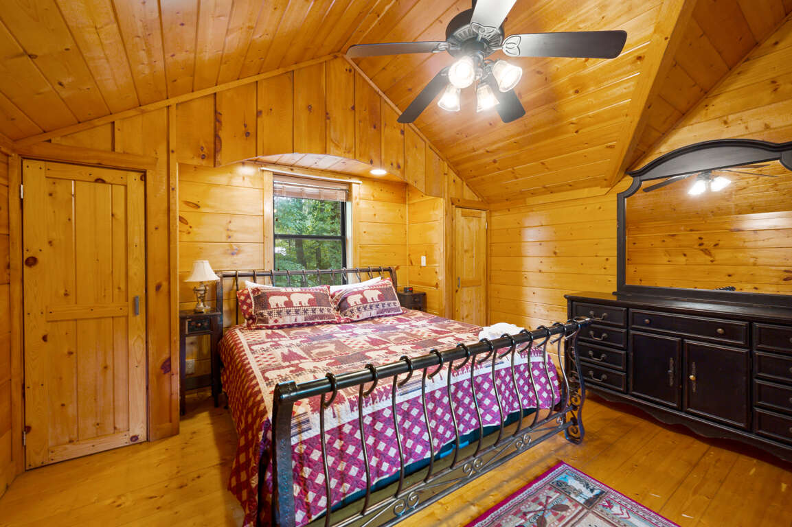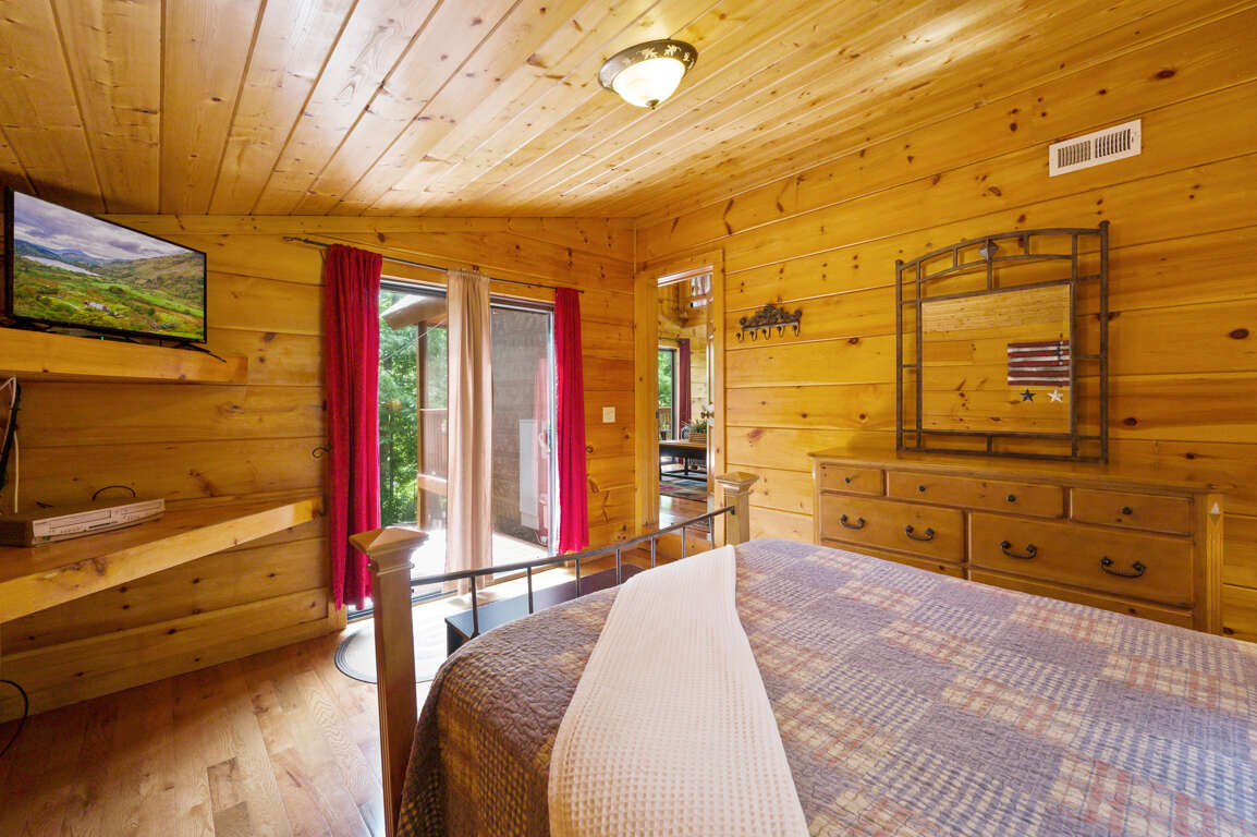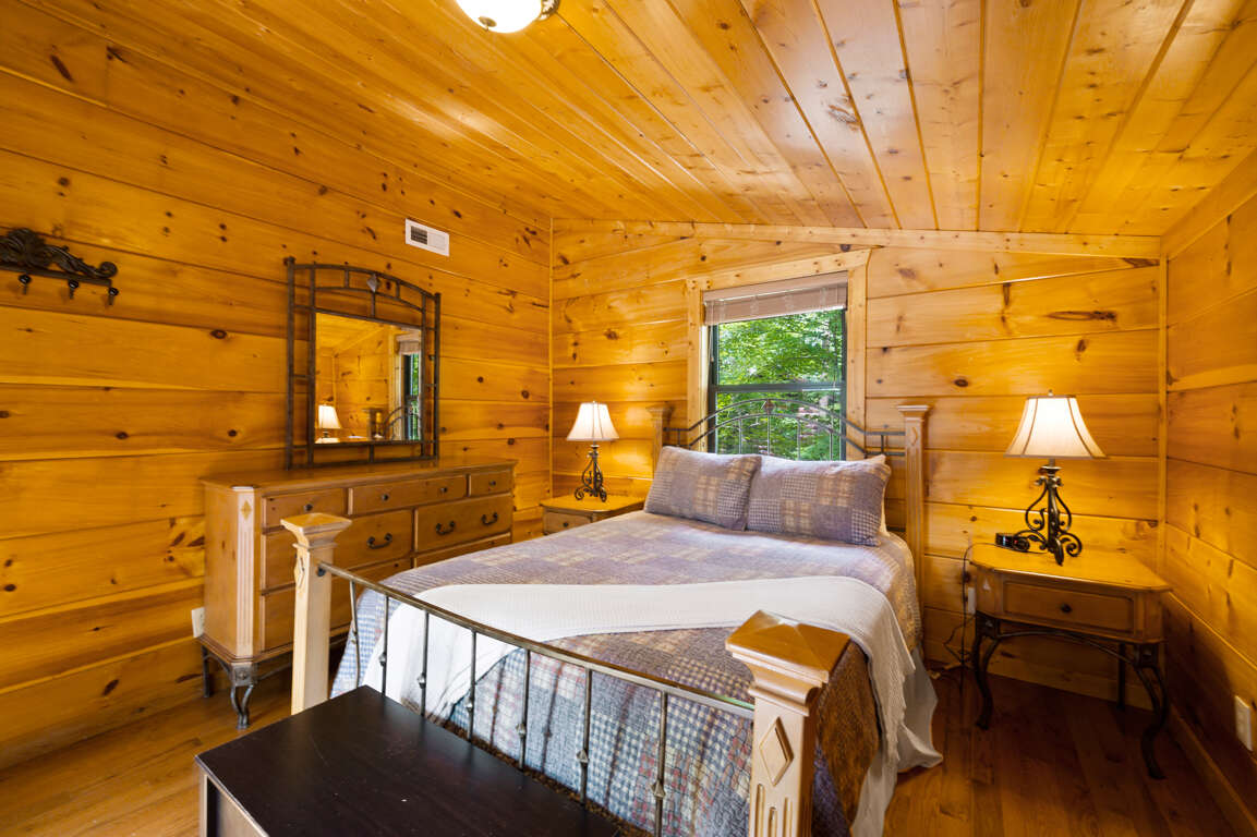 The three-bedroom Bearfoot Dreams cabin can accommodate additional guests on the sleeper sofa in the living room and the twin futon, so eight people can comfortably rest.