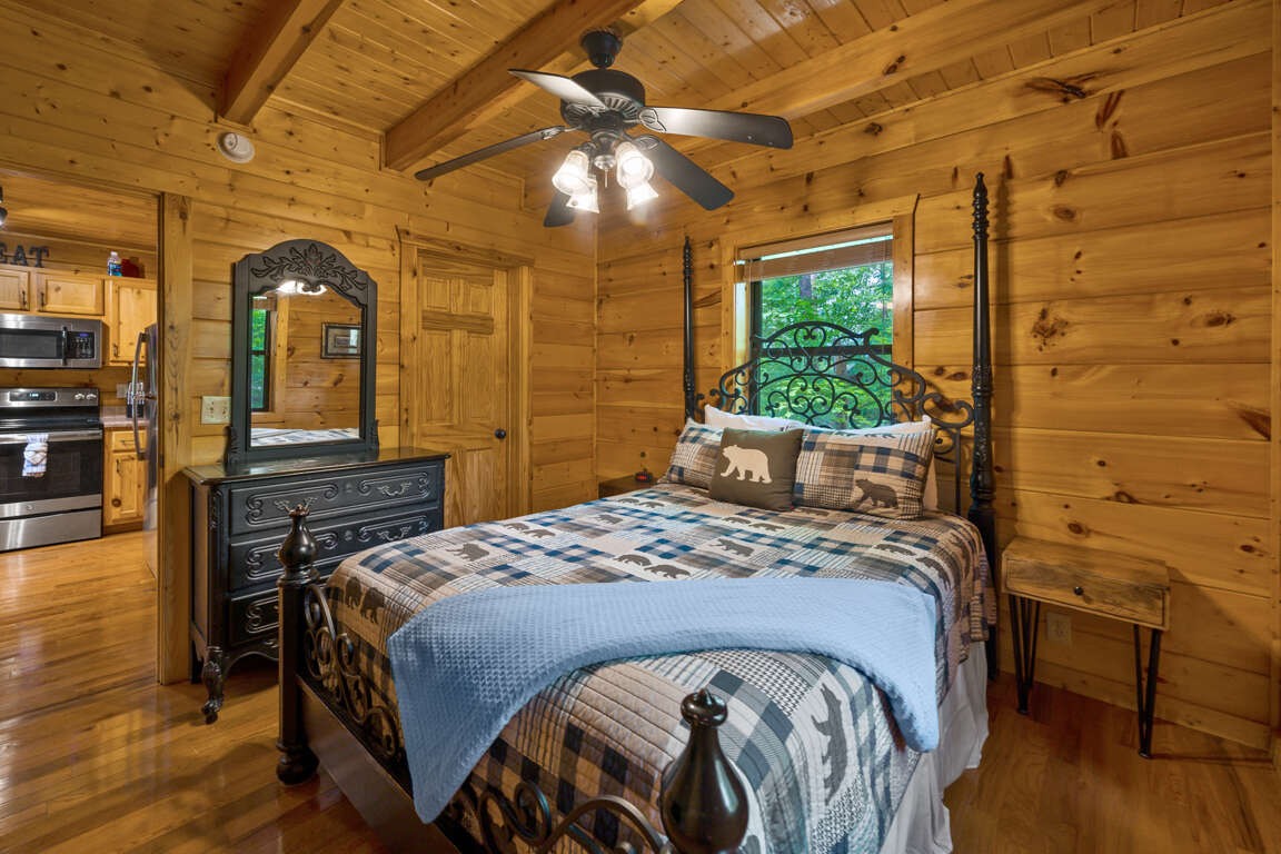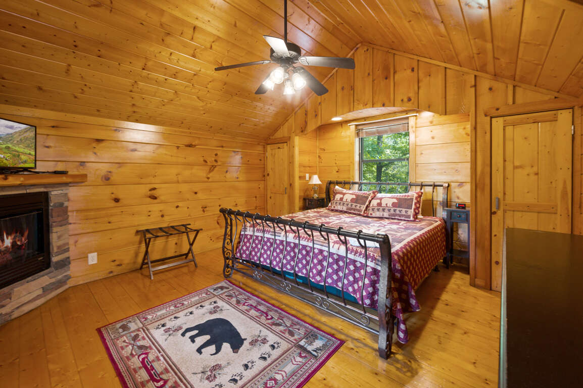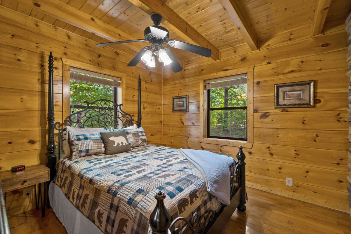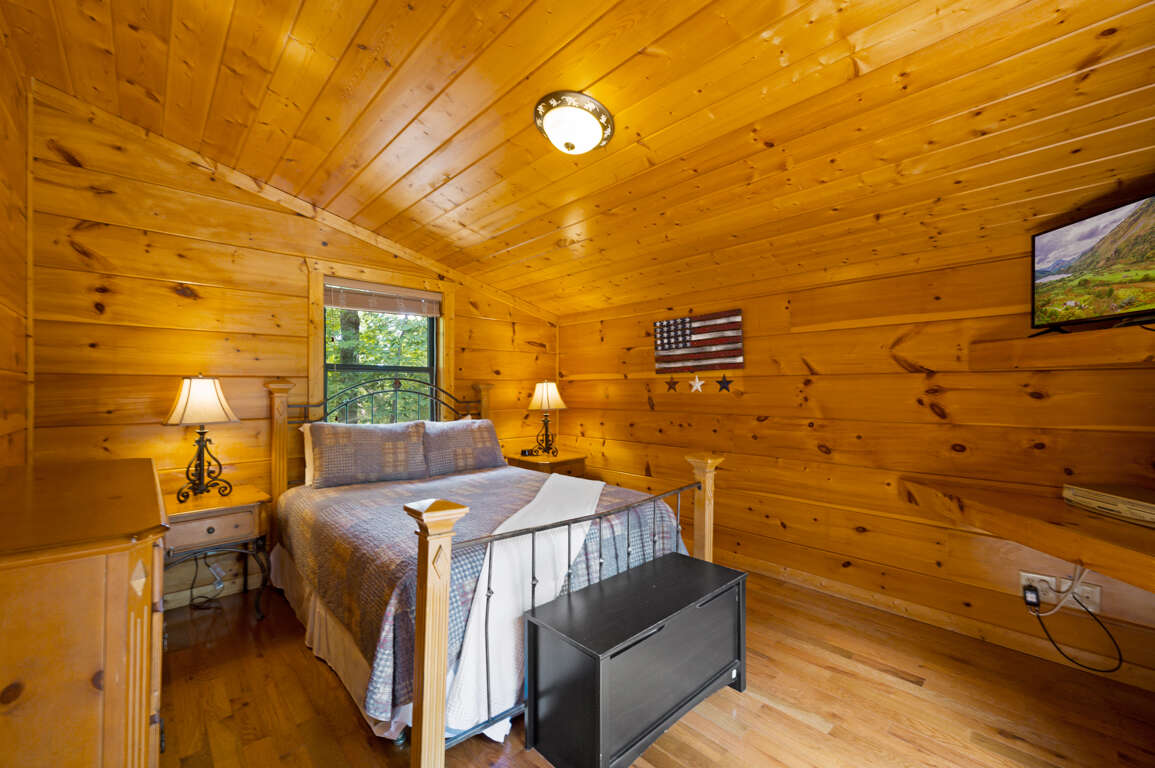 The three-bedroom Bearfoot Dreams cabin can accommodate additional guests on the sleeper sofa in the living room and the twin futon, so eight people can comfortably rest.