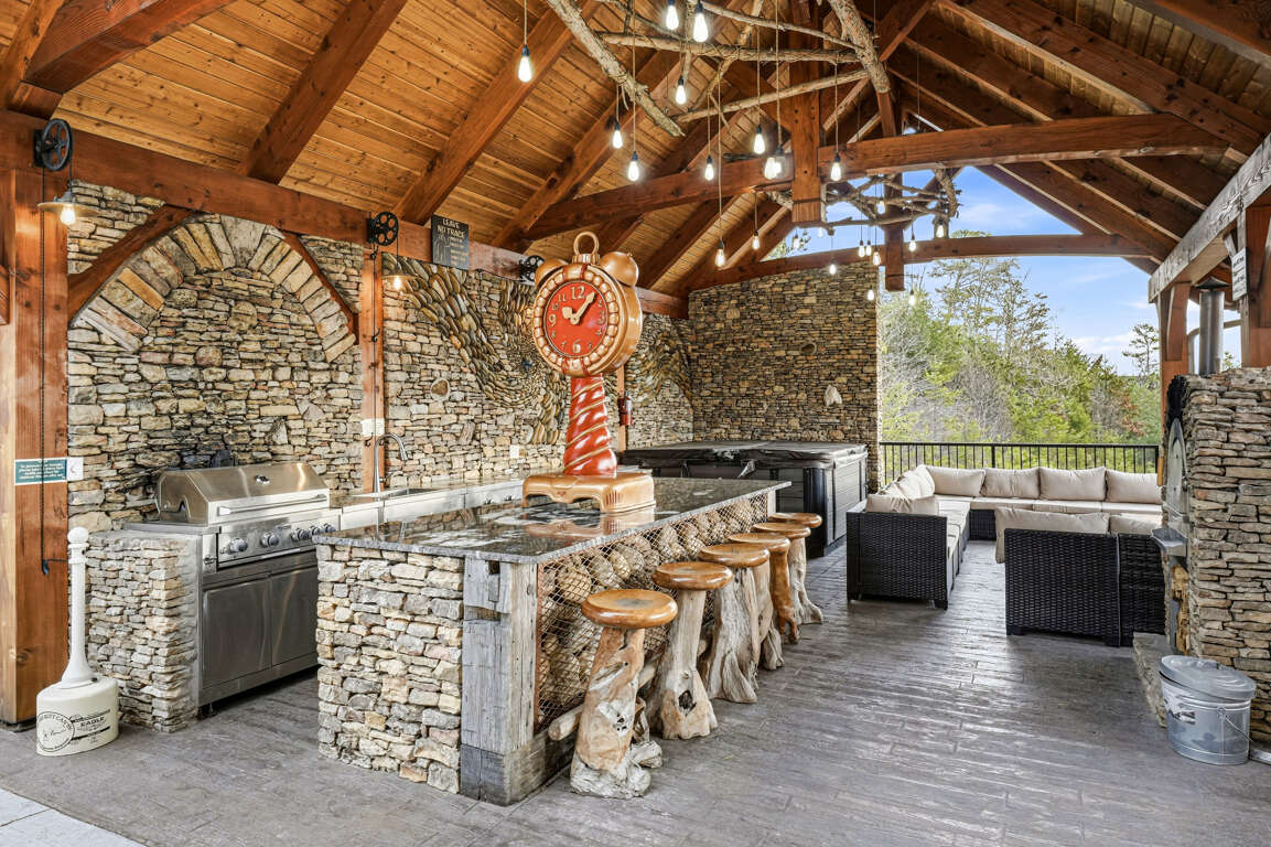 Enjoy the expansive outdoor Pavilion. Huge beams, custom lighting, and a large commercial outdoor kitchen. The kitchen consists of a 36” commercial grill, another cooktop, an outdoor fridge, a wine cooler fridge, a sink with hot and cold water, an ice maker, and a wood-fired stone pizza oven. An 11’ Island to sit at with barstools, an 8-person Hot tub, and seating for 12 around the fire pit overlooking the amazing views. While outside, go over and take a picture with our mascot, Papa Bear! Plenty of parking for 6-7 vehicles. J1772 Vehicle charging station. Tesla will need an adapter.