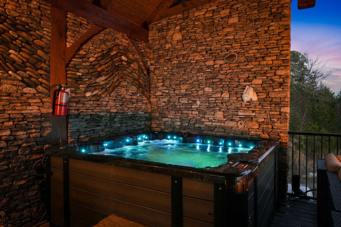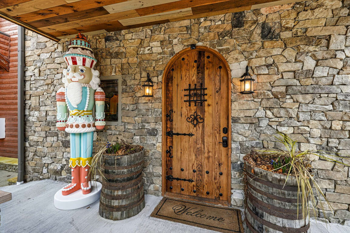 Above the center King suite is a huge loft with two more queen beds. The little ones can climb the “Magic Ladder” to the loft and peek through the hobbit door and overlook the center Rec room. Each bedroom has its own private door leading to the deck, offering peaceful, unobstructed views. Fully outfitted bathrooms with smart mirrors.