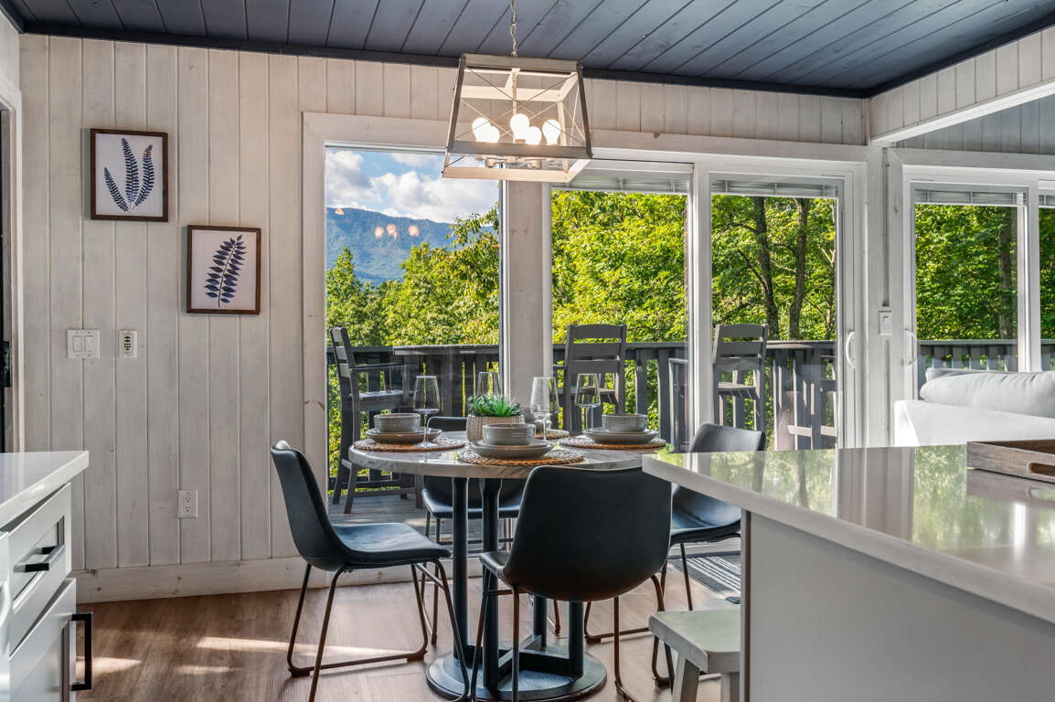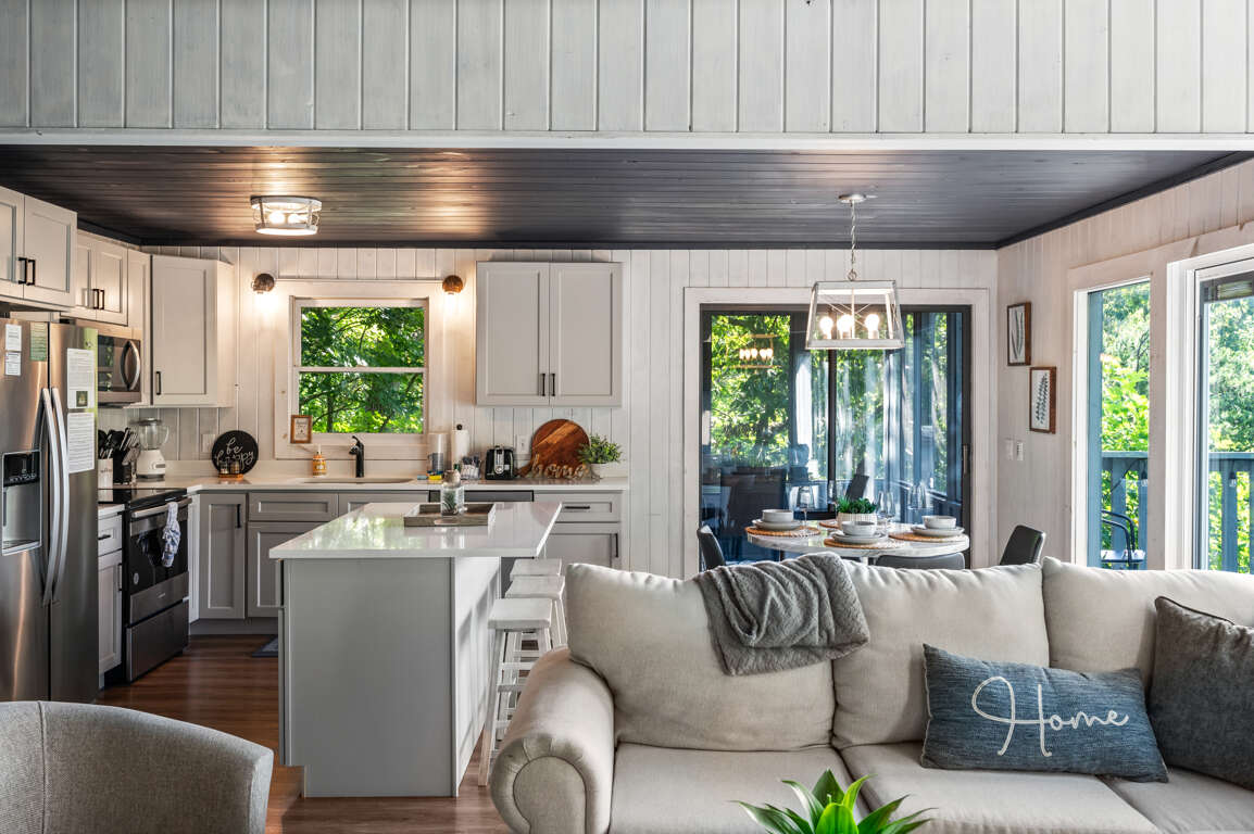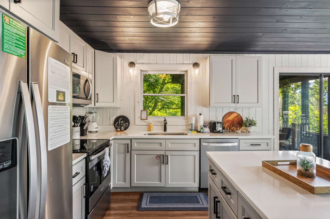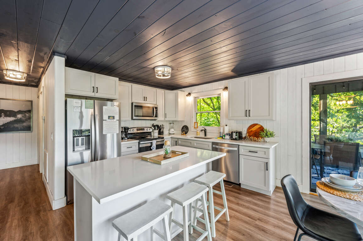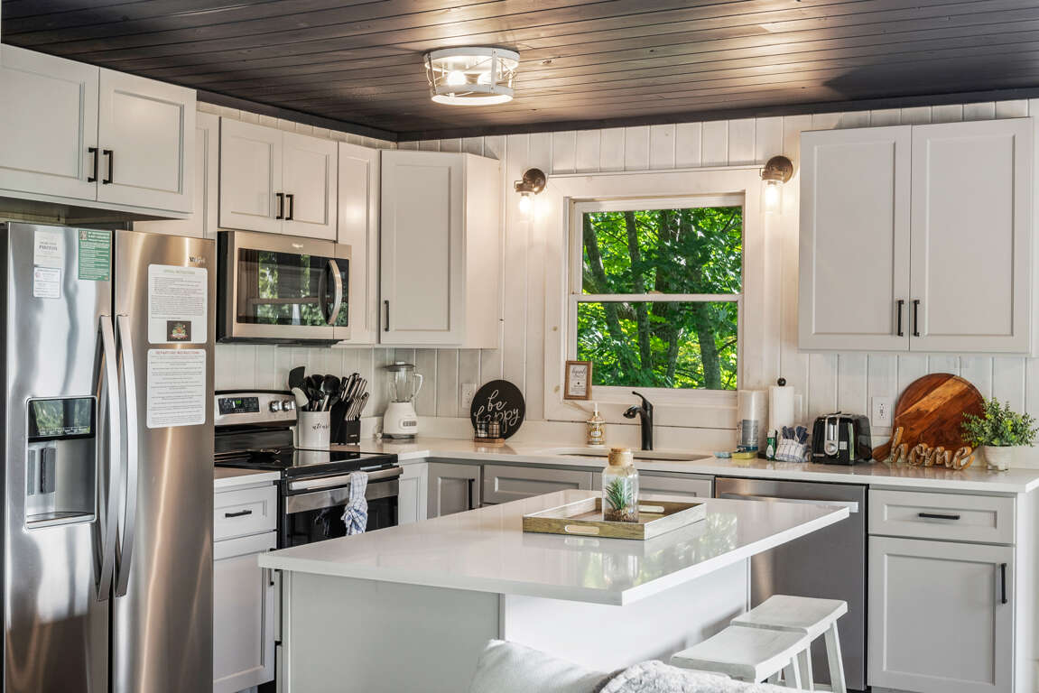 The newly remodeled kitchen has stainless steel appliances and is fully equipped with cutlery, cookware, dishes, and most any you might need to whip up a feast during your stay. There’s a dining table for four, a breakfast nook, and seating for three more at the kitchen island so there’s room for everyone. Watch the sun set behind the trees through the kitchen windows while you make a drink and unwind after a long day of exploring the Smokies.