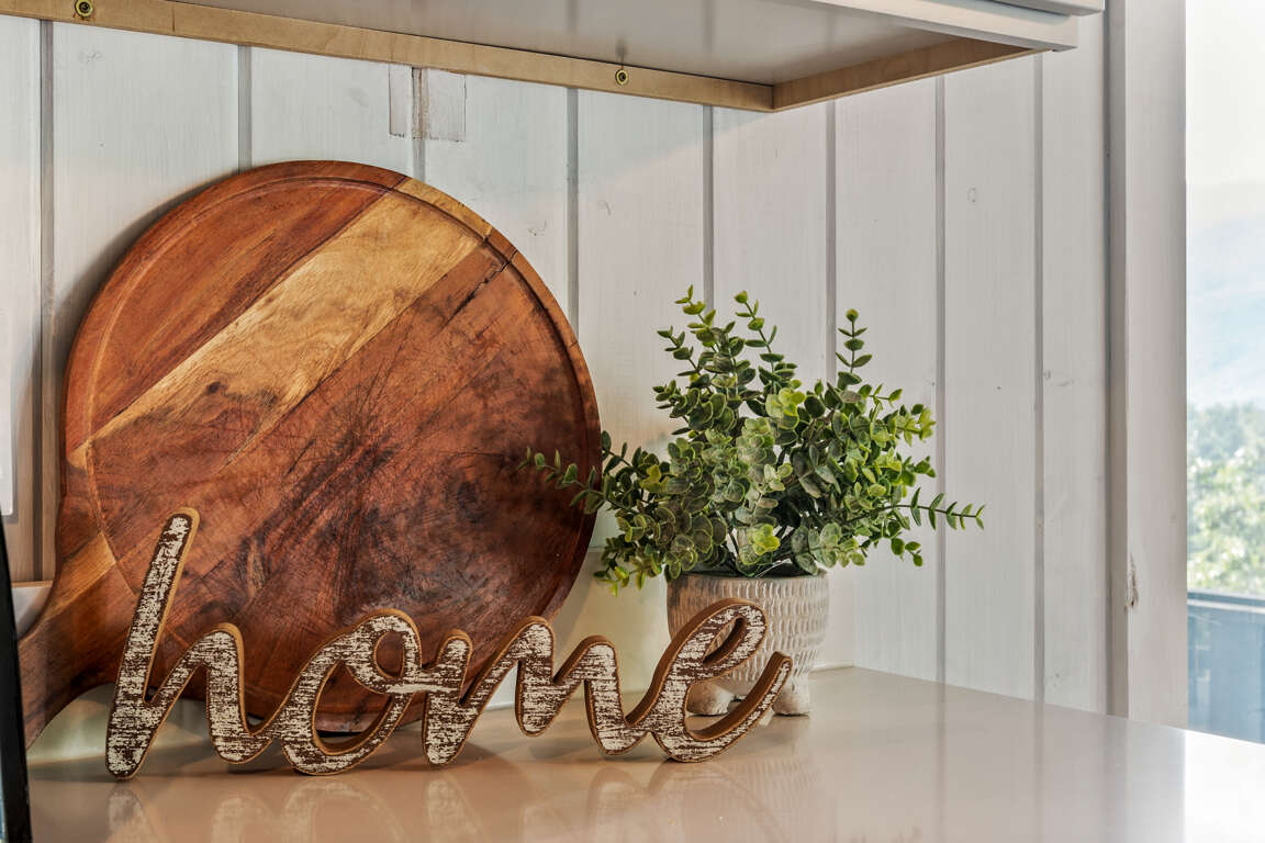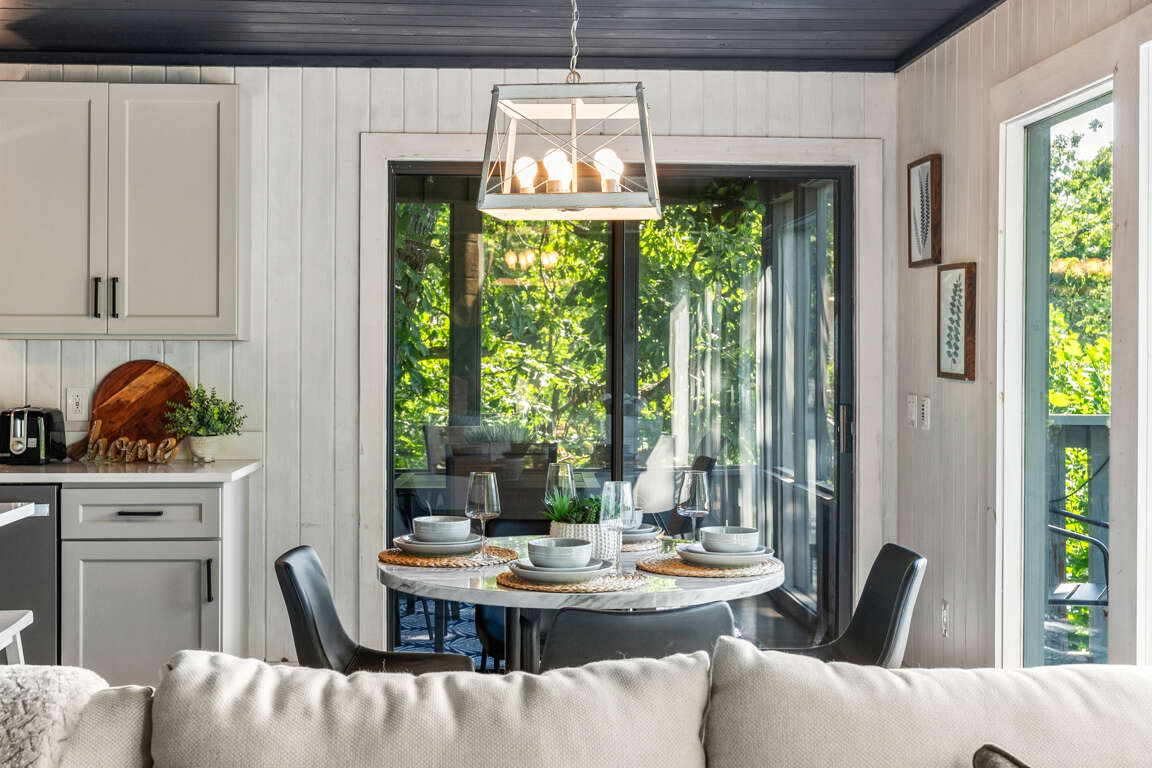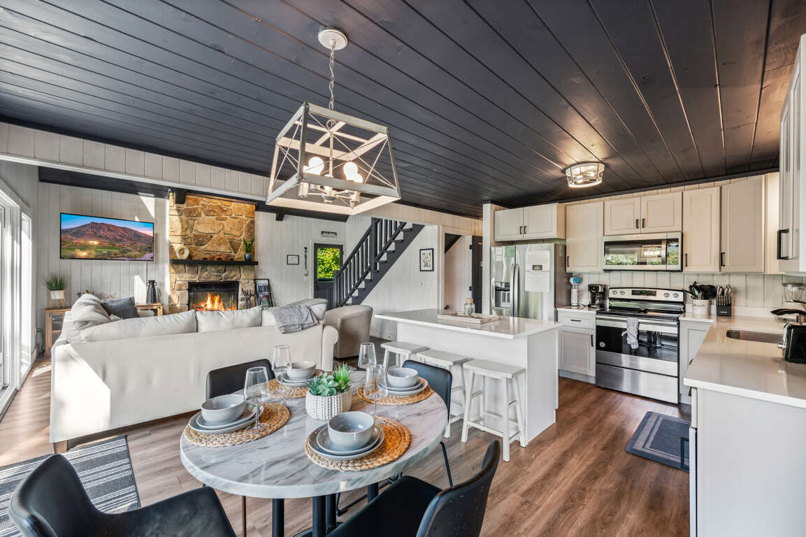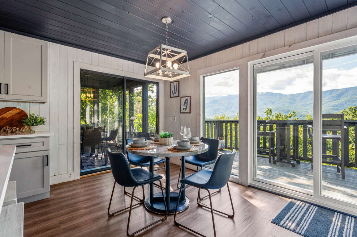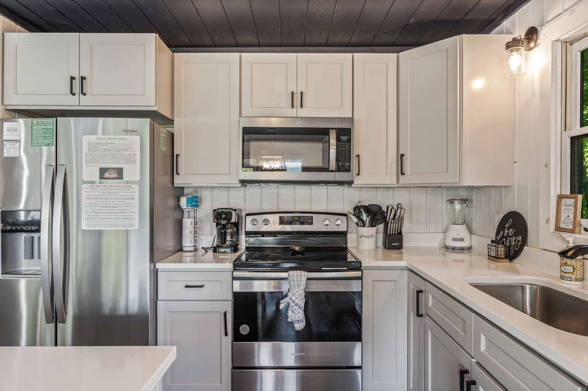 The newly remodeled kitchen has stainless steel appliances and is fully equipped with cutlery, cookware, dishes, and most any you might need to whip up a feast during your stay. There’s a dining table for four, a breakfast nook, and seating for three more at the kitchen island so there’s room for everyone. Watch the sun set behind the trees through the kitchen windows while you make a drink and unwind after a long day of exploring the Smokies.