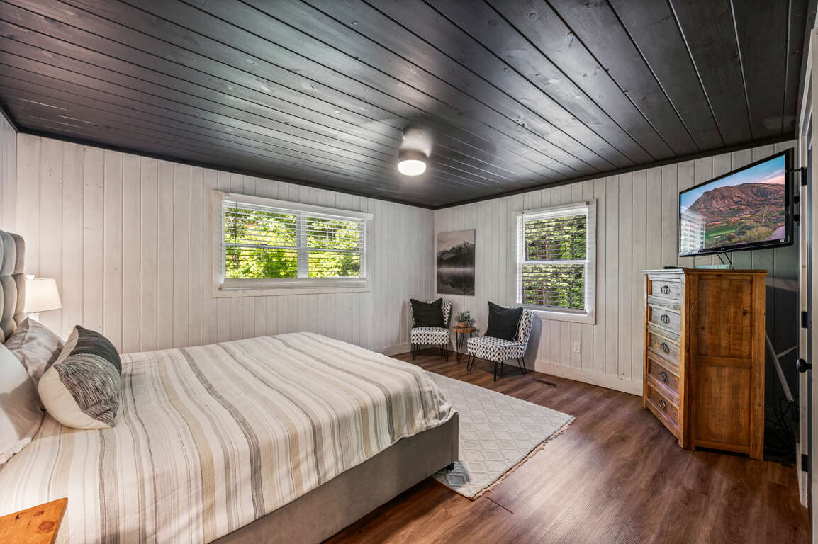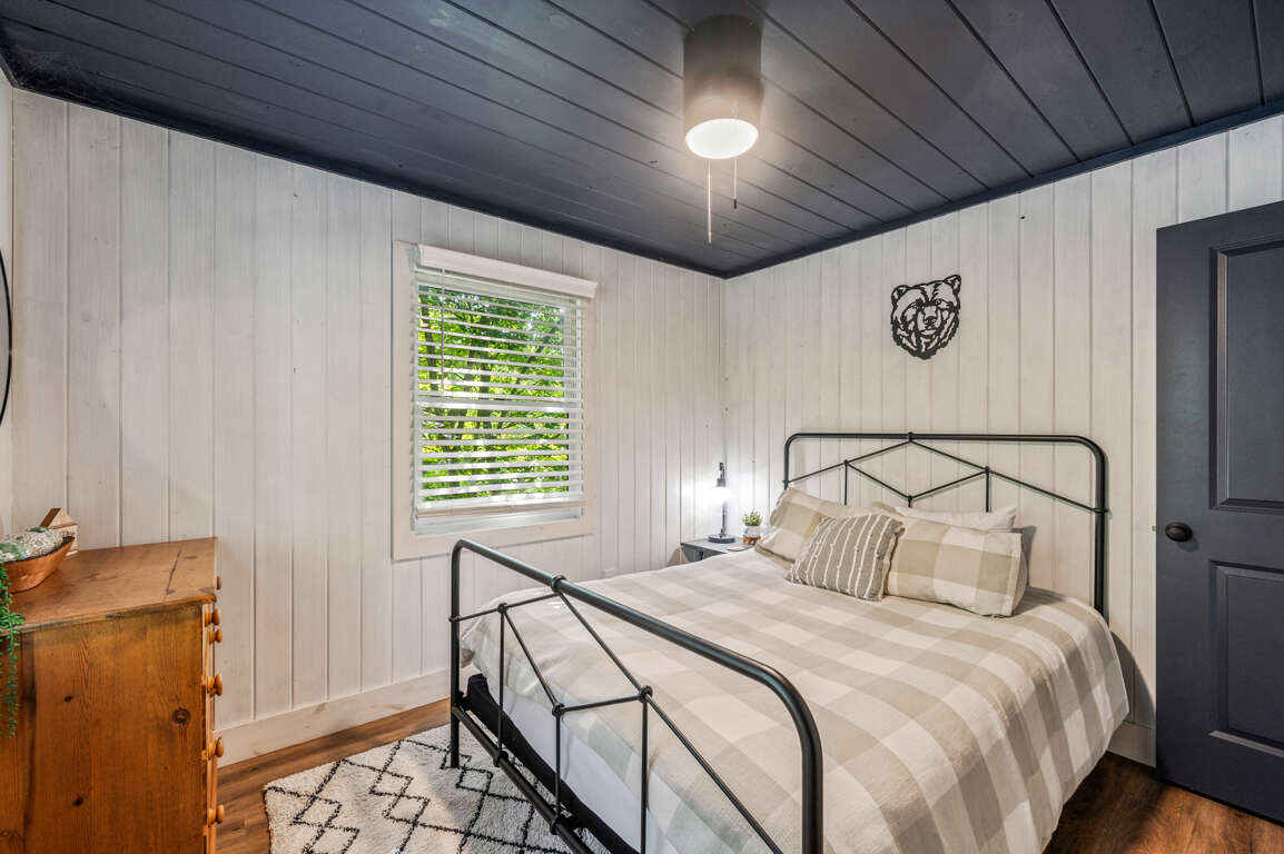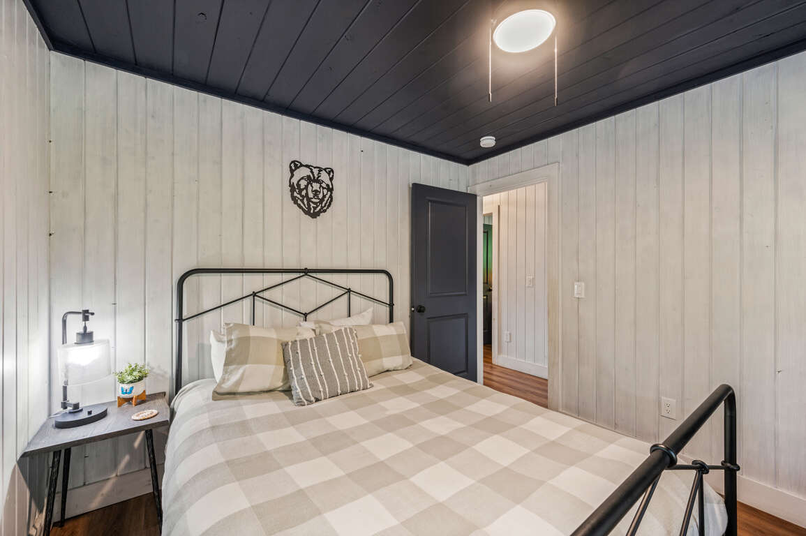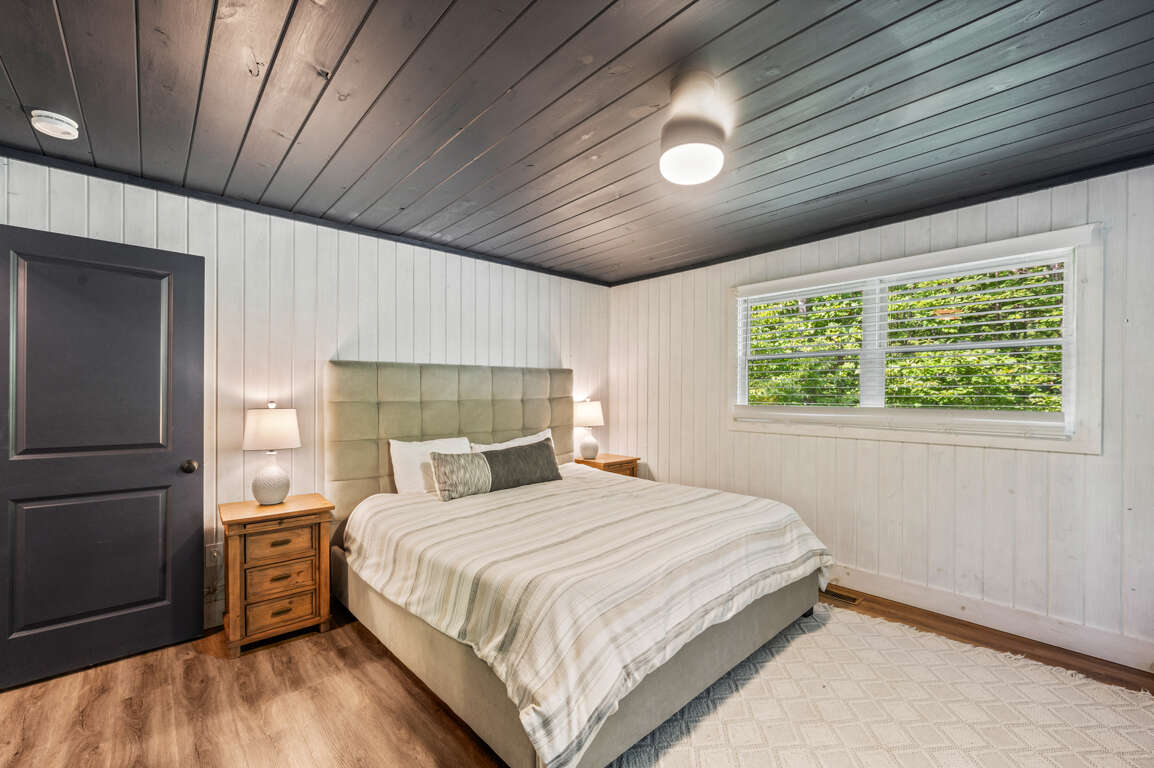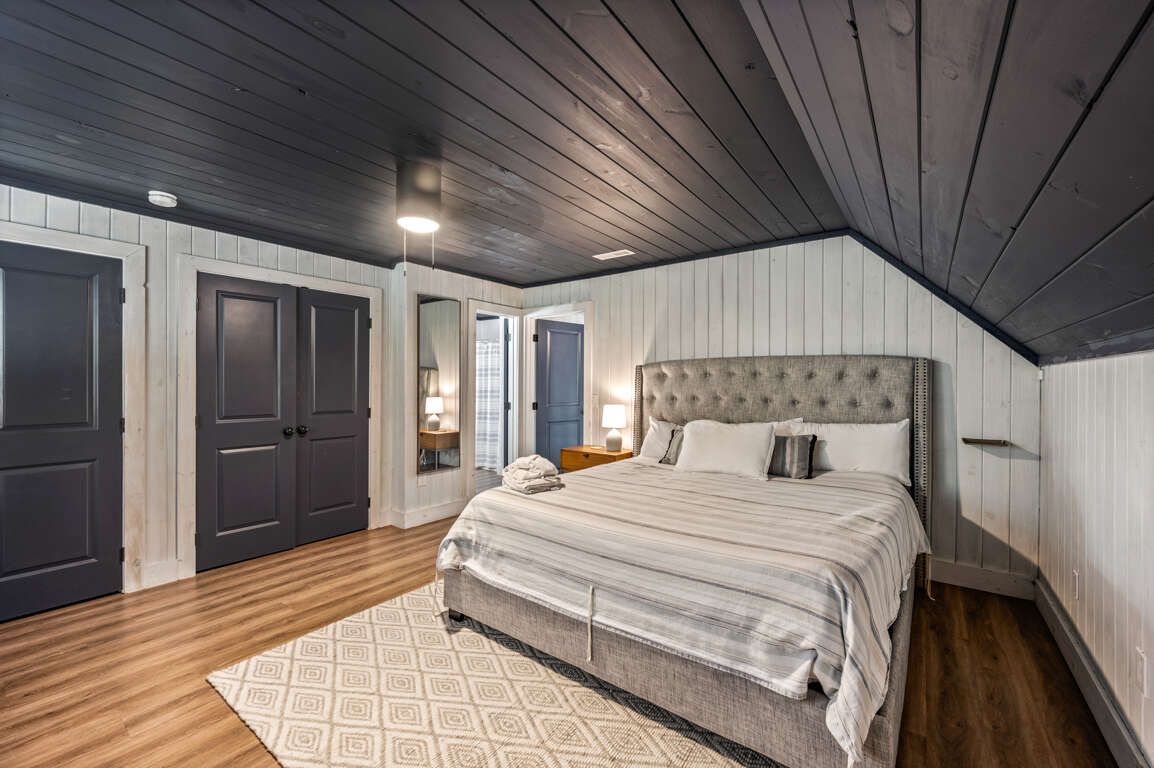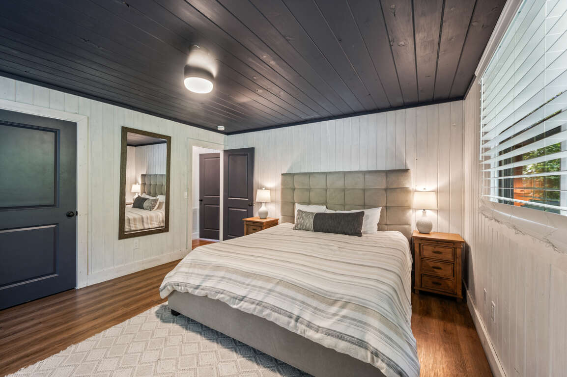 On the main floor, you’ll find the other two bedrooms and their shared bathroom. One room with another king bed and a queen in the other.